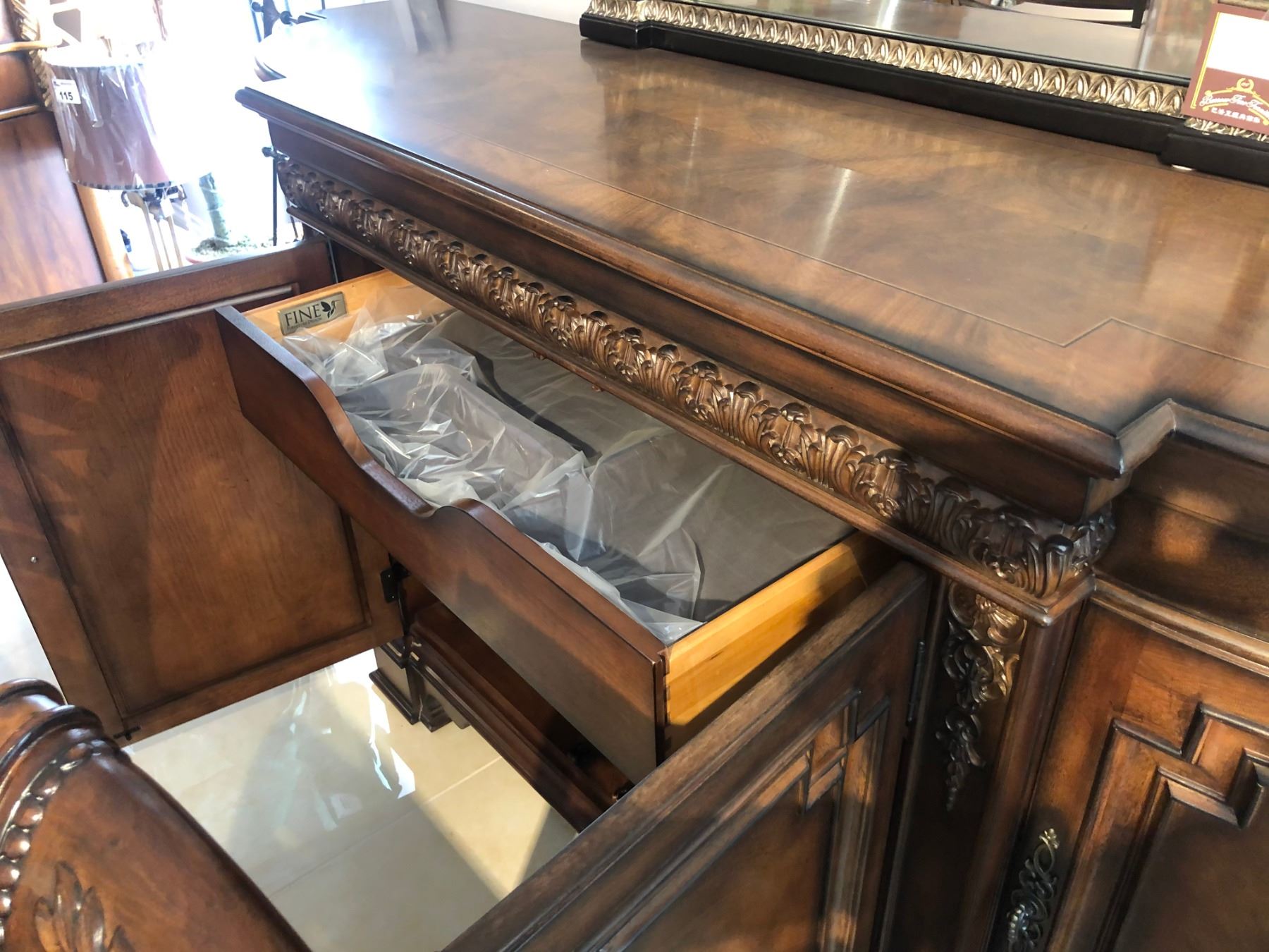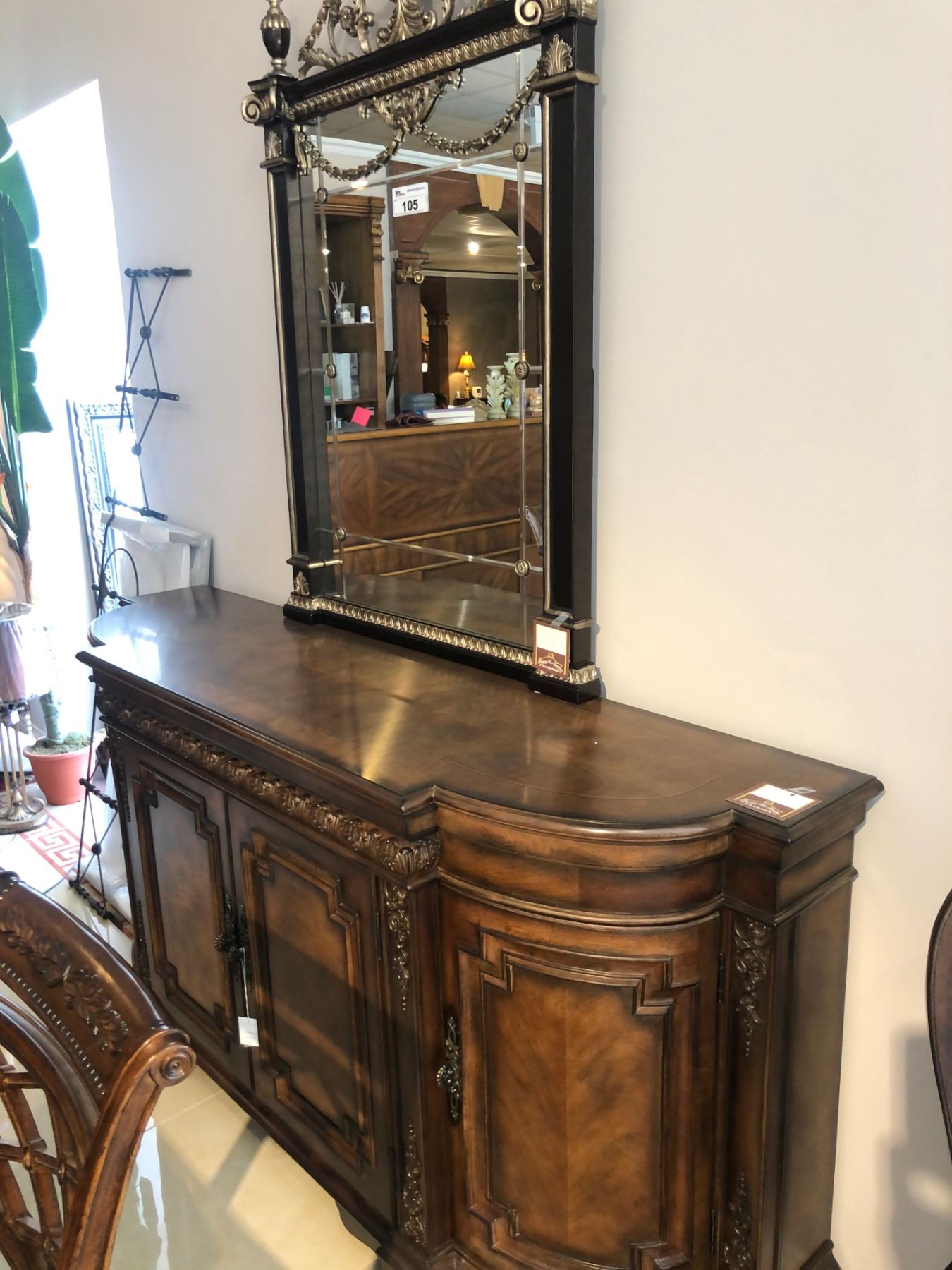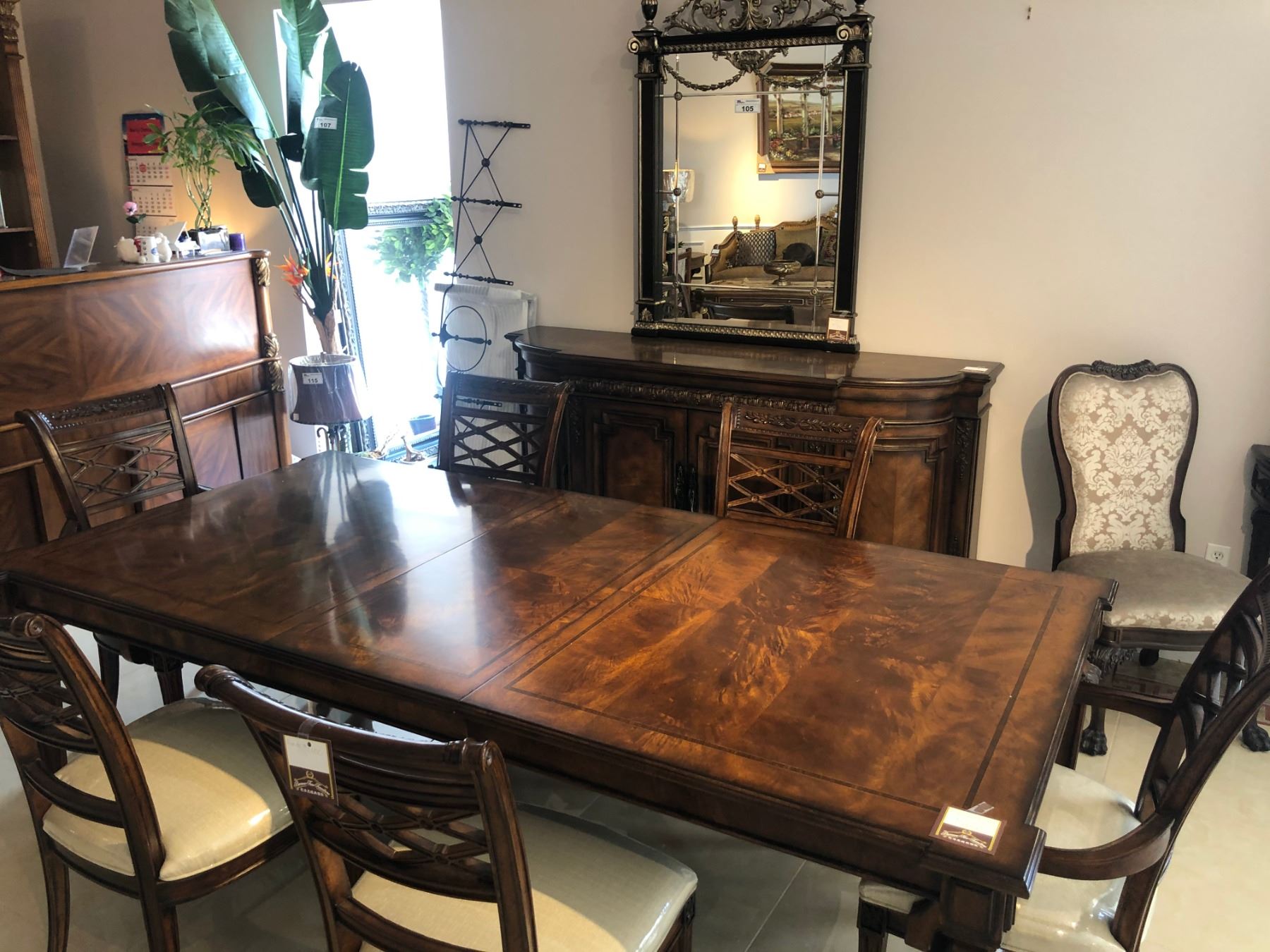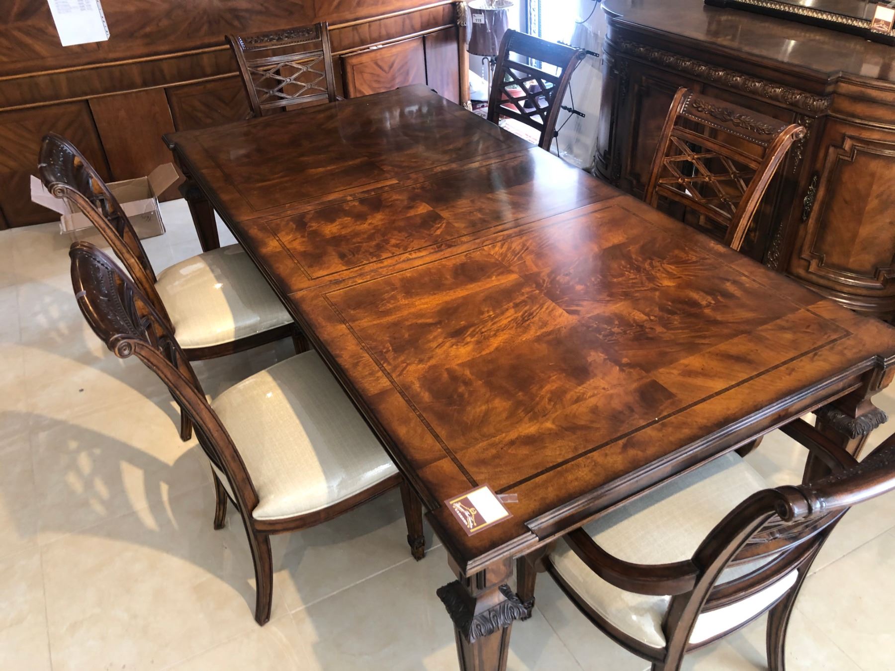 CONTEMPORARY WOODEN INLAYED FORMAL DINING ROOM SUITE. INCLUDES TABLE WITH TWO LEAVES, SIX CHAIRS, BUFFET WITH MIRROR AND BACK BOARD. RETAIL $20,300.00