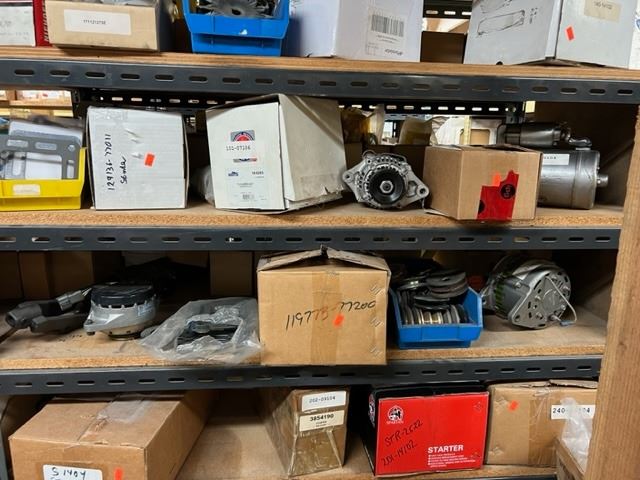 CONTENTS OF 1 SIDE OF 3 SHELVES. ALTERNATORS, STARTER MOTORS, ZINCS, ALT FANS, PLUG WIRES, FILTERS, BELLOWS, WATER PUMPS, DIST CAPS, RED AND BLACK 10G WIRE, ETC