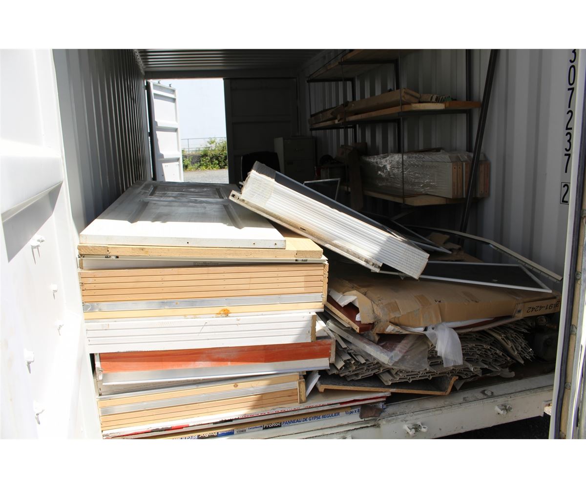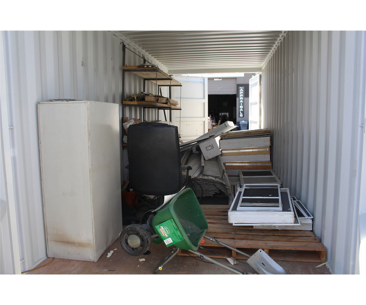 CONTENTS OF 20' STORAGE CONTAINER *STORAGE CONTAINER NOT INCLUDED* MOSTLY BUILDING SUPPLIES, CUT OFF SAW, WINDOW SCREENS, ETC