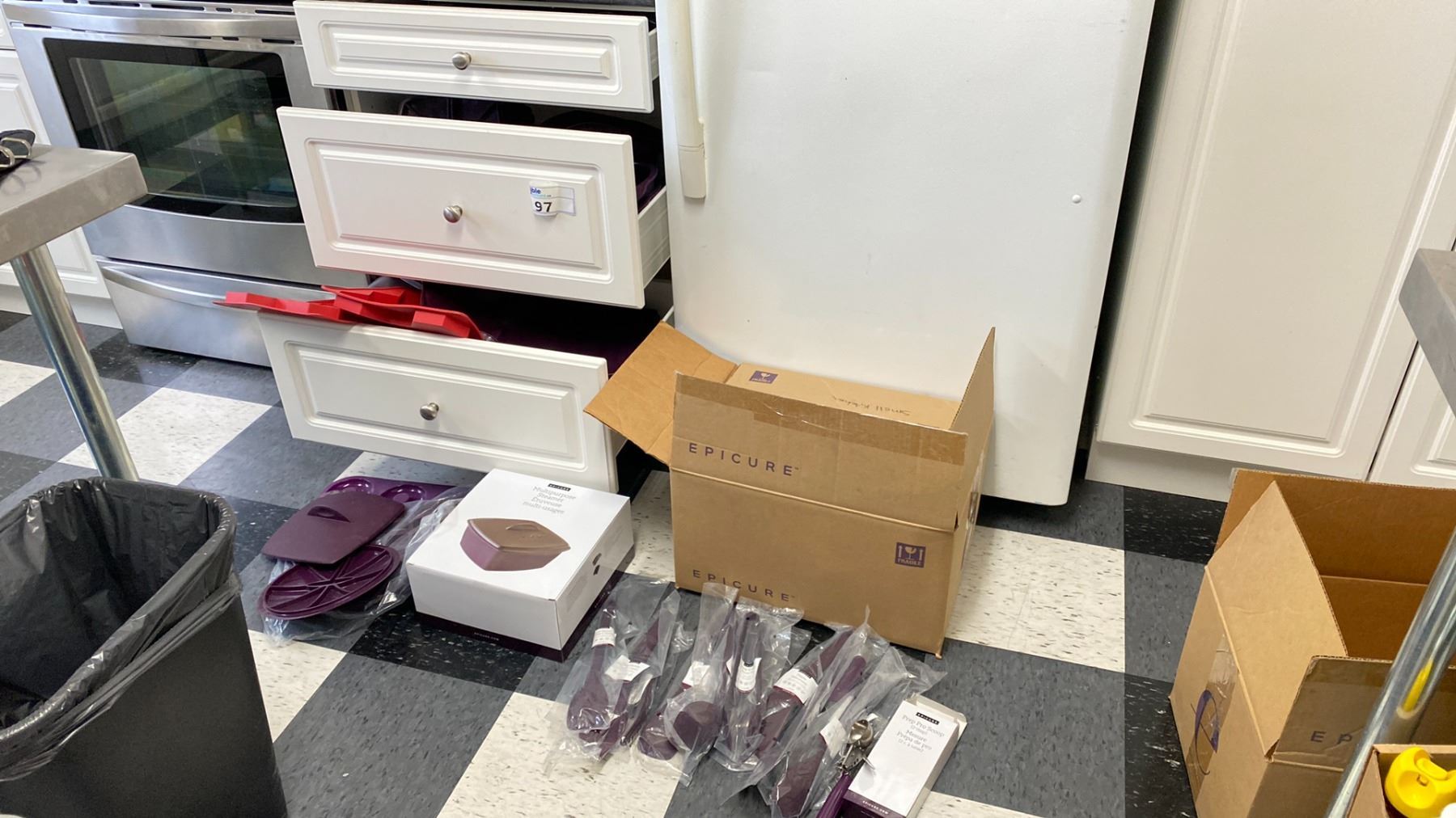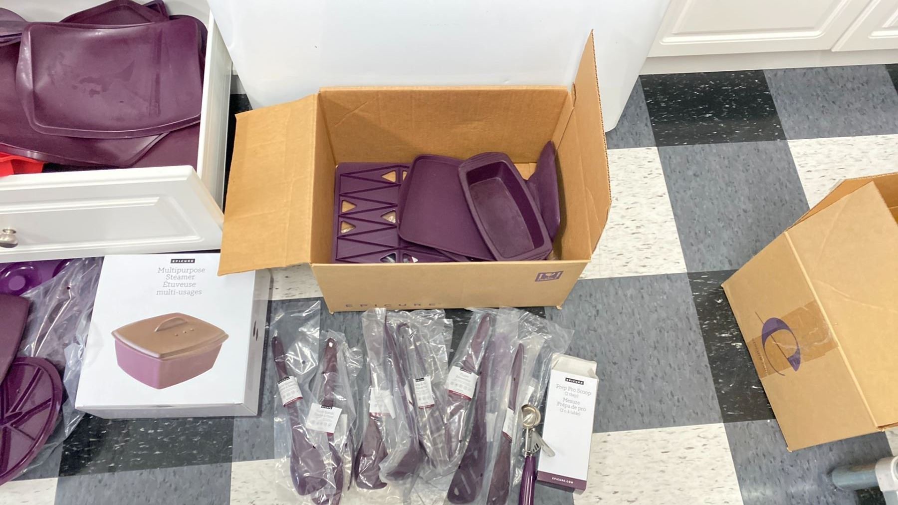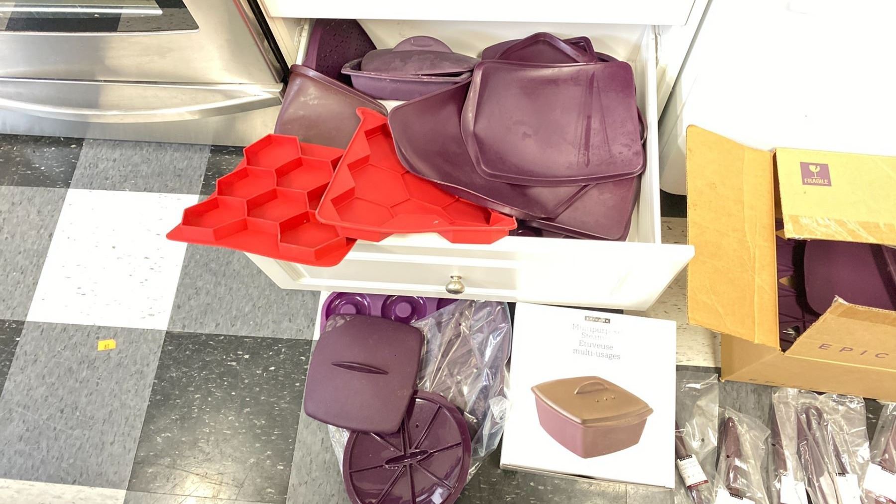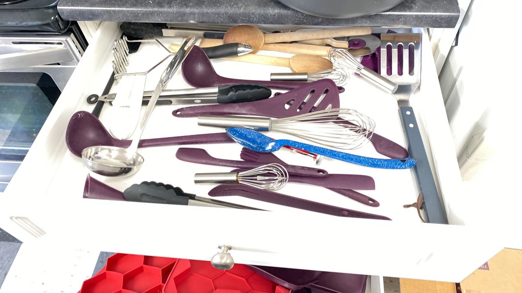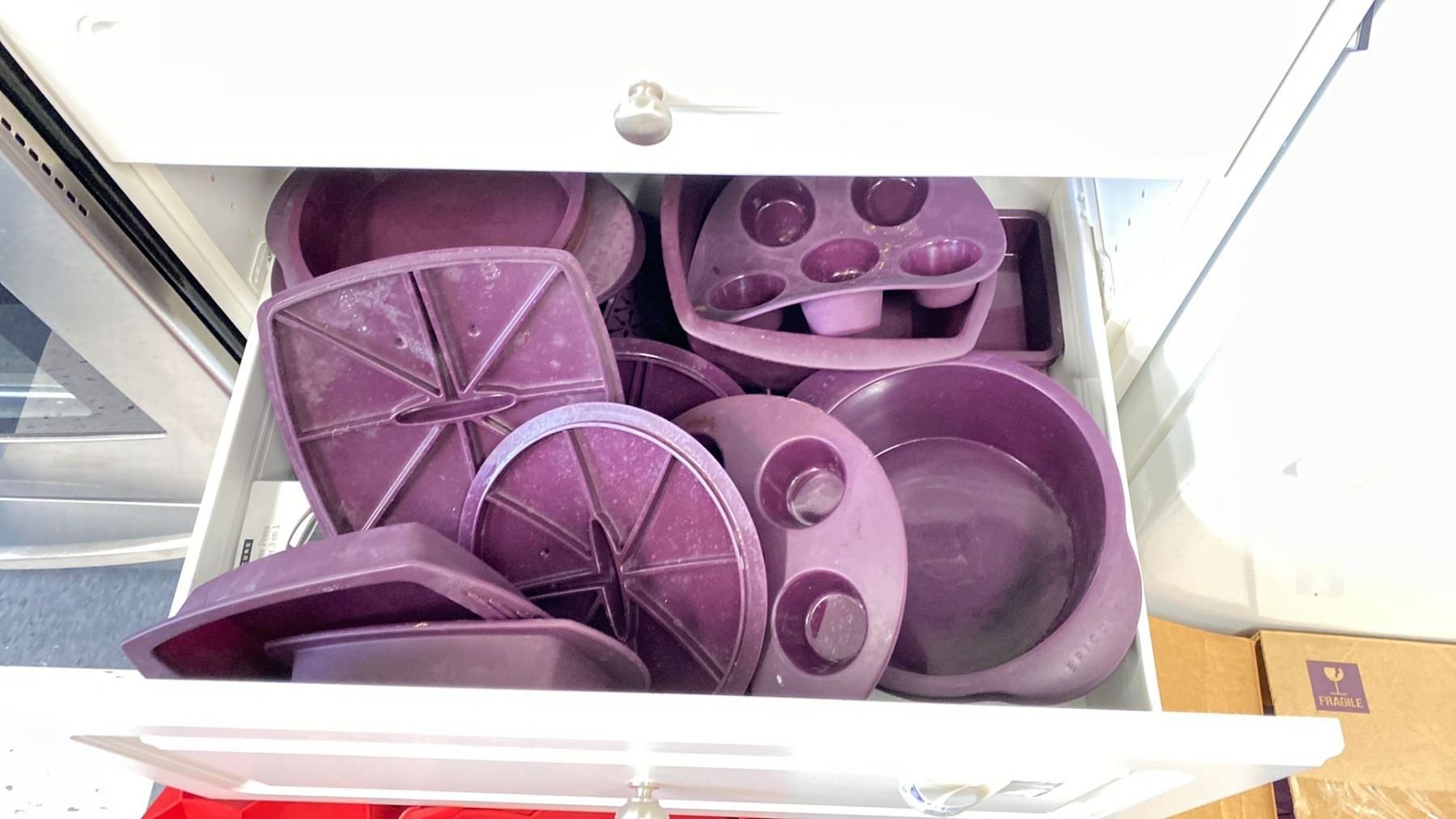 CONTENTS OF 3 DRAWERS ASST SILICONE COOKING AND BAKING ITEMS. SOME NEW. ICE CUBE TRAYS, BAGEL, UTENSILS, STEAMERS, PORTIONER, ETC