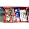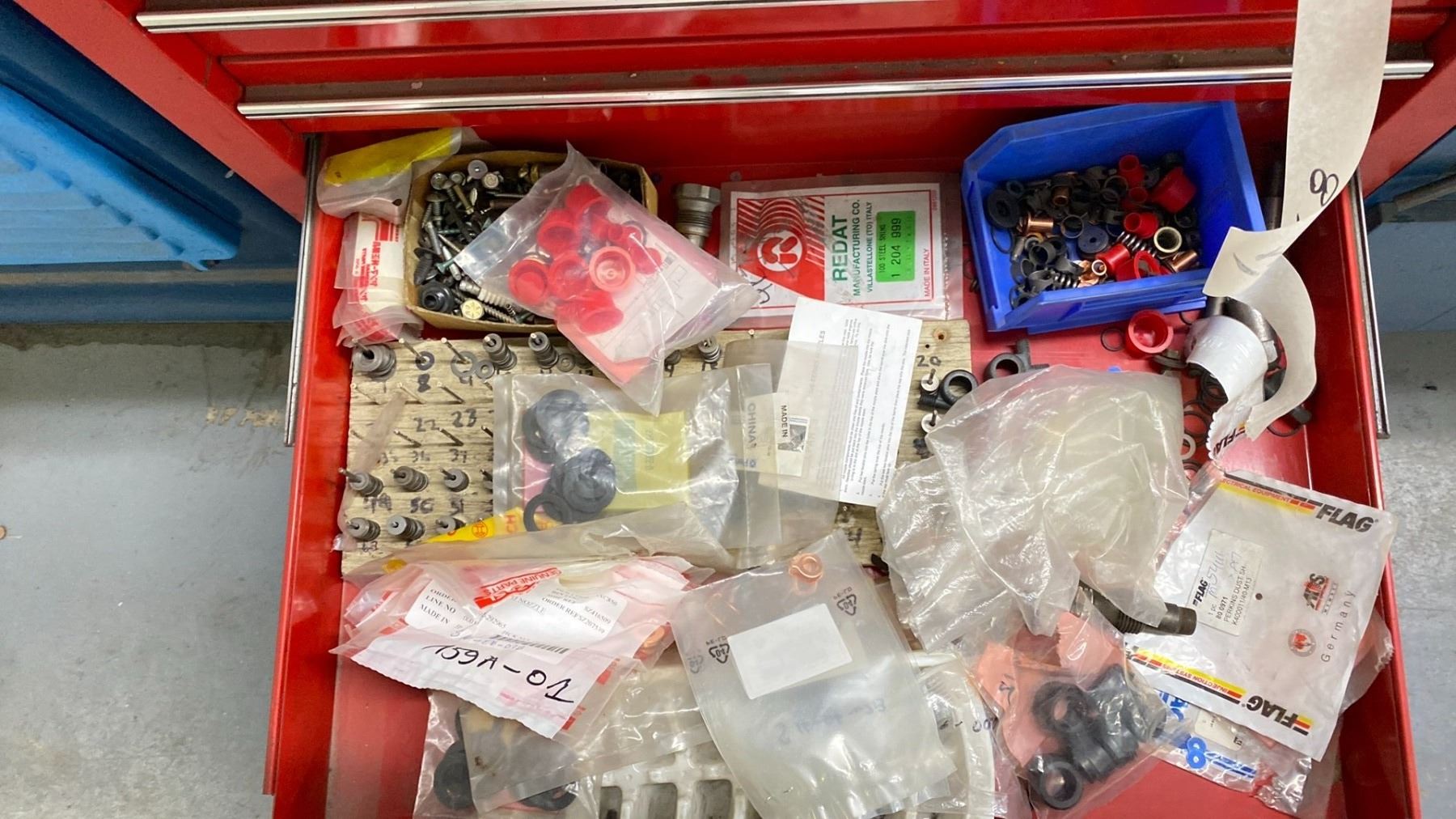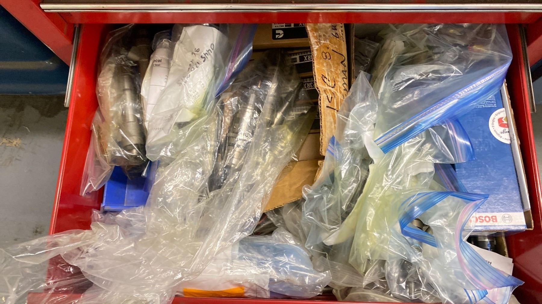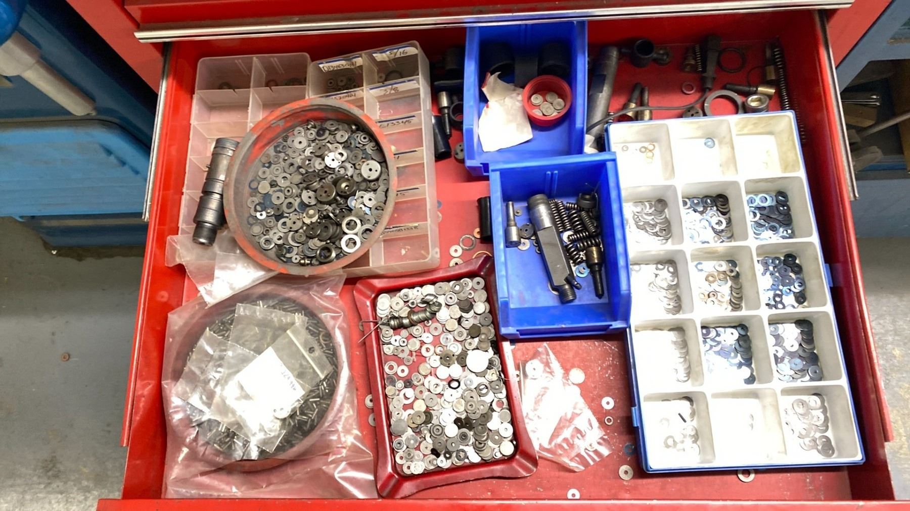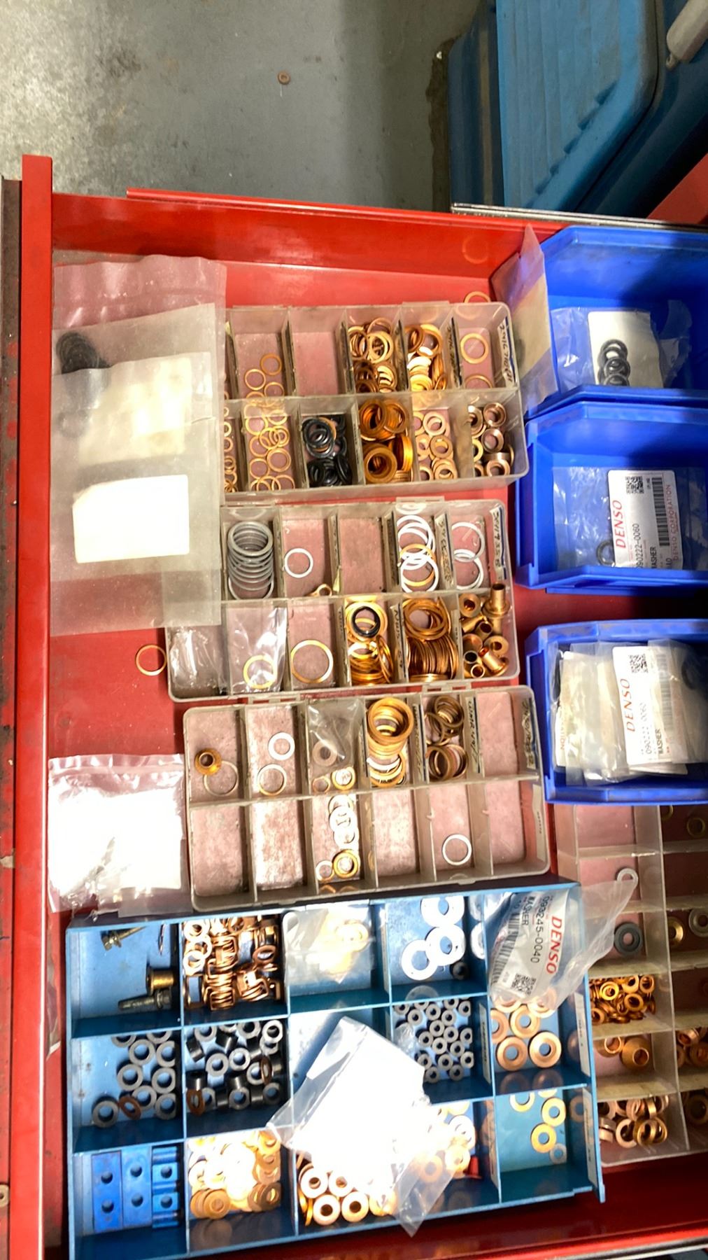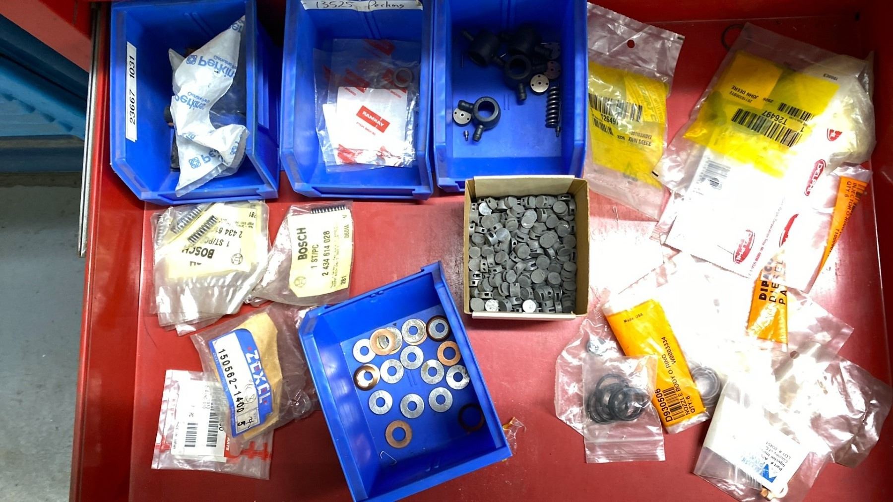 CONTENTS OF 7 DRAWERS OF SHIMS, INJECTOR, GASKETS, RANDOM TOOLS, AND INJECTOR CORES. CABINET NOT INCLUDED. BRING YOUR OWN BOXES.