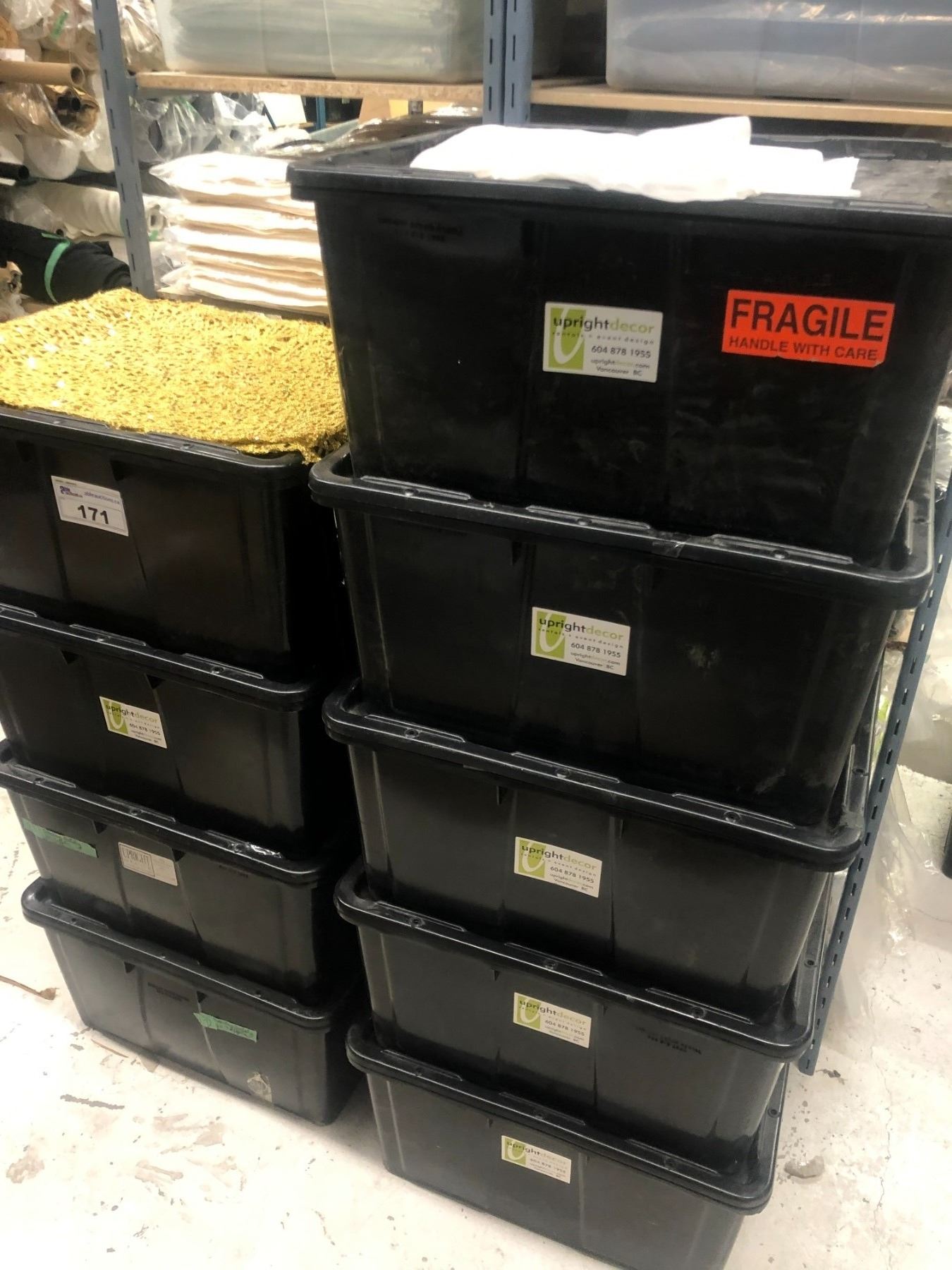 CONTENTS OF 9 BINS OF ASSORTED LINEN, FABRIC, CLOTHES ETC. COMES WITH BINS