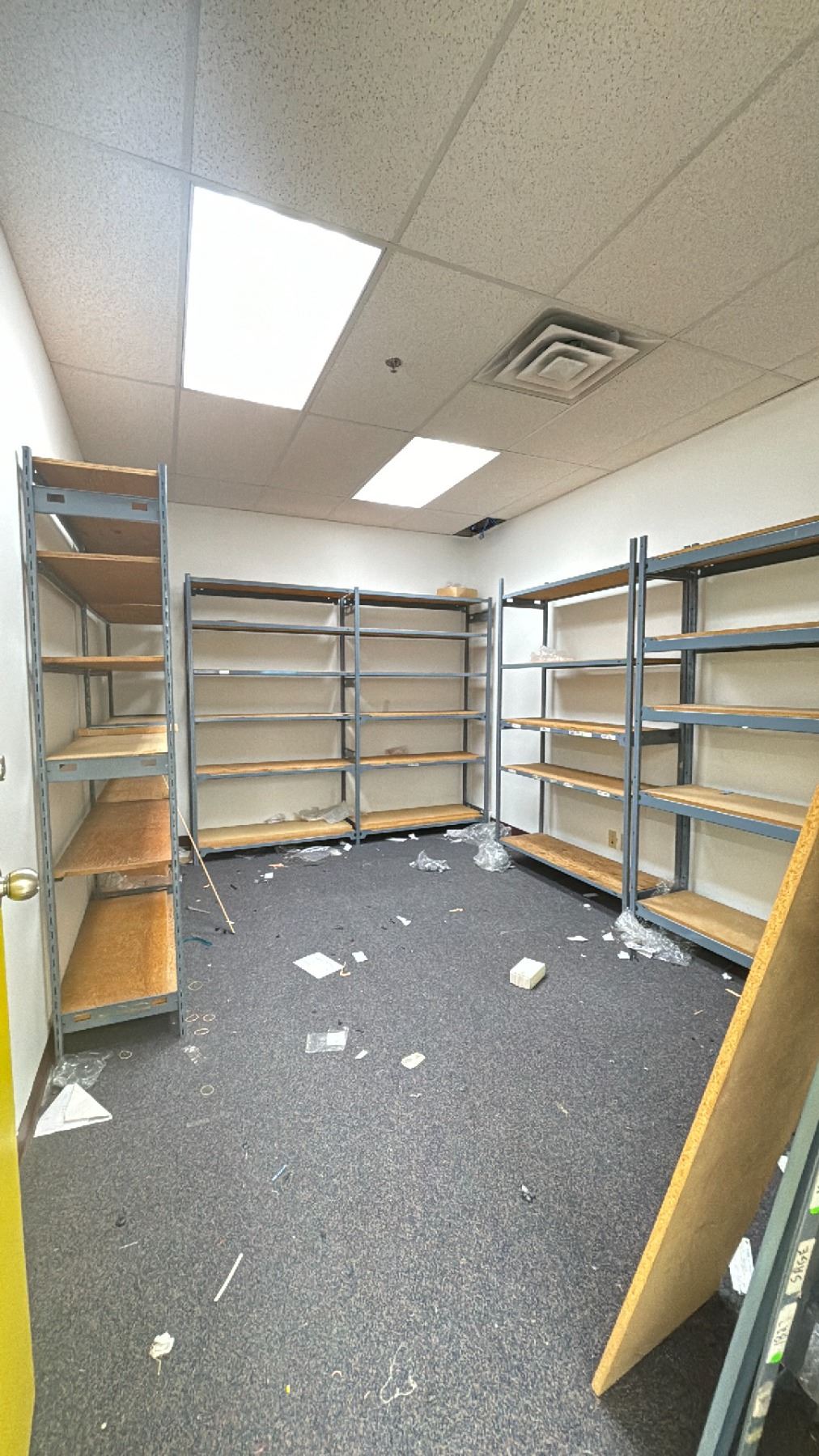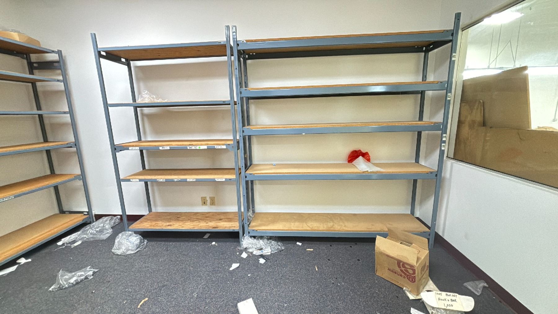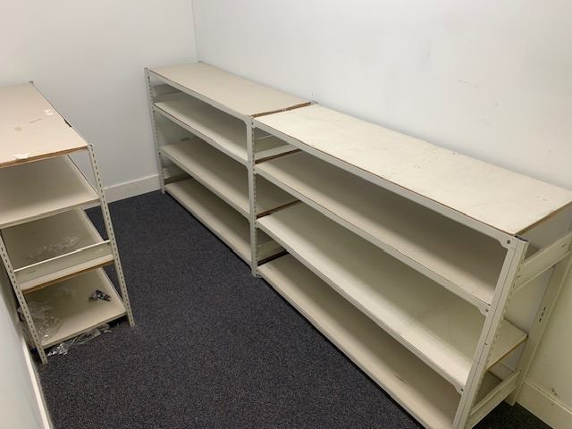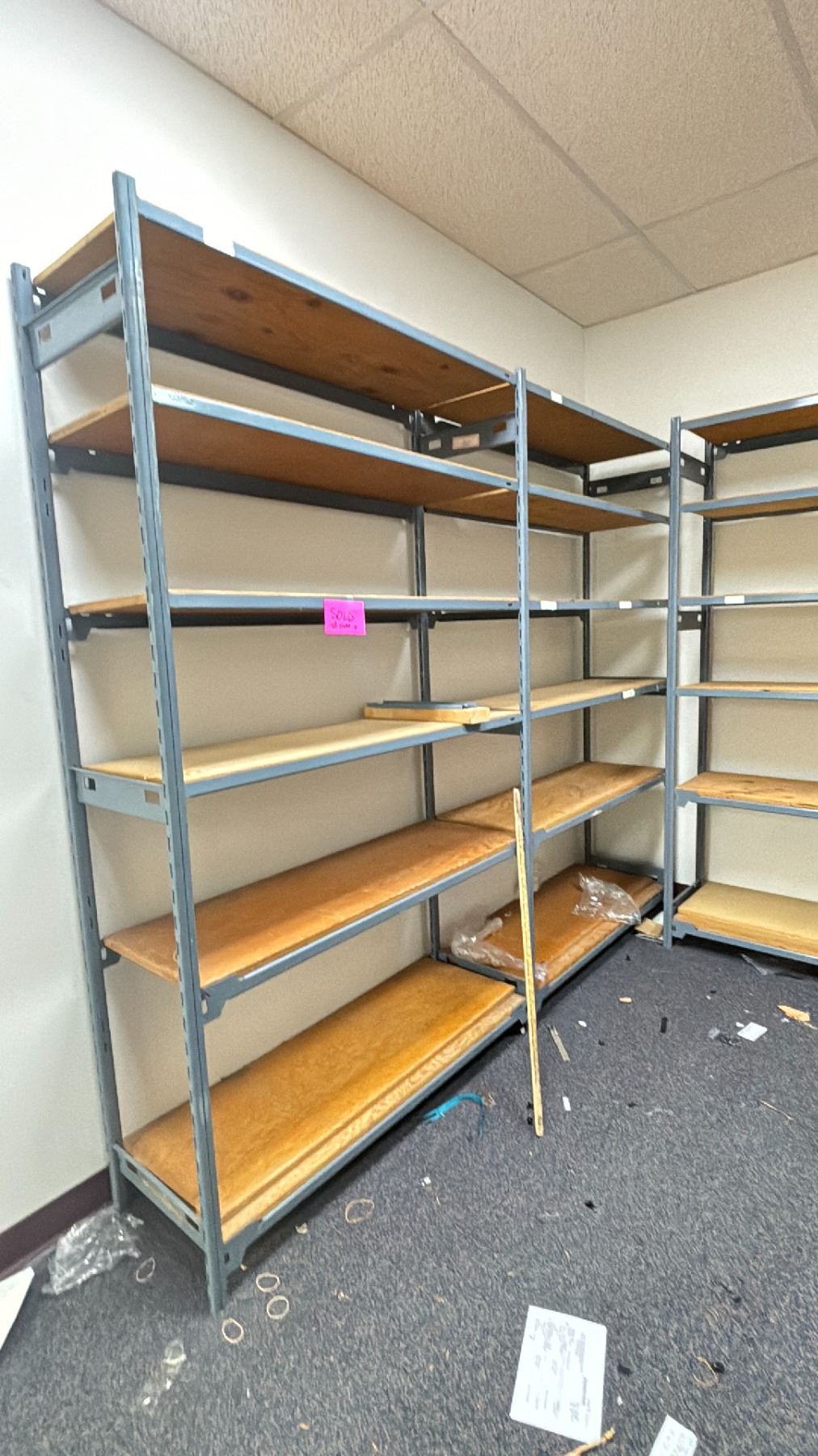 CONTENTS OF BACK STORAGE ROOM INCLUDING: 6 BAYS OF GREY METAL EZ-RECT SHELVING WITH WOOD *ALL 16"D X 84"H*