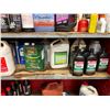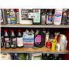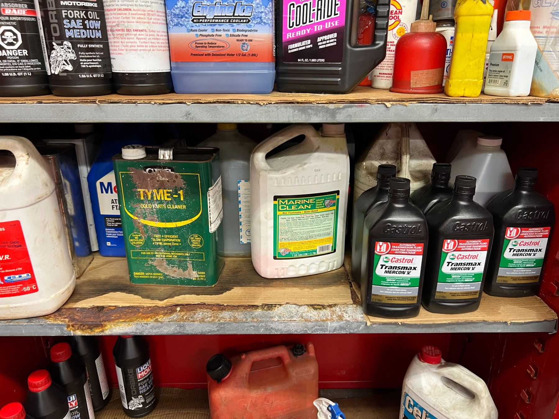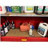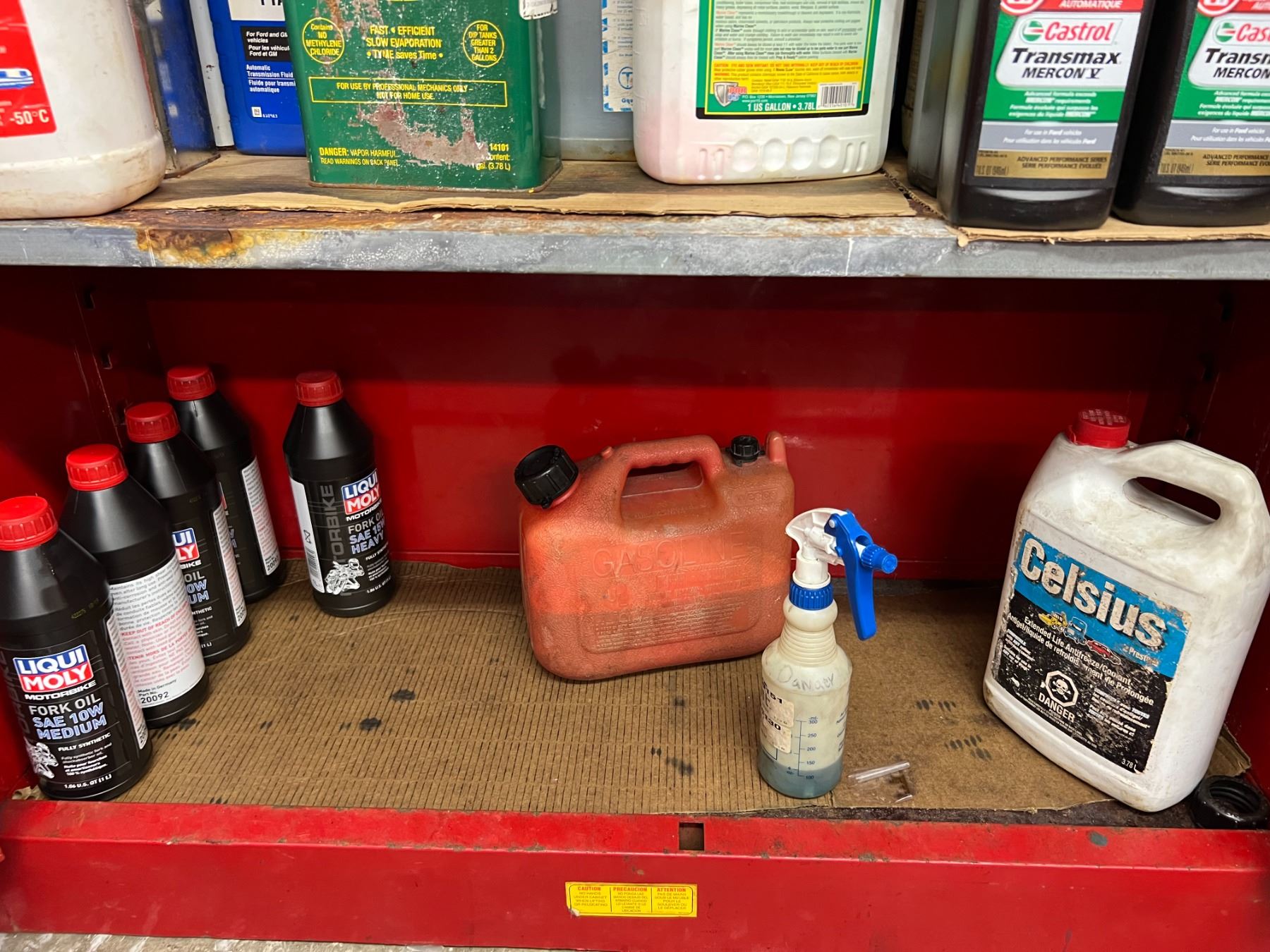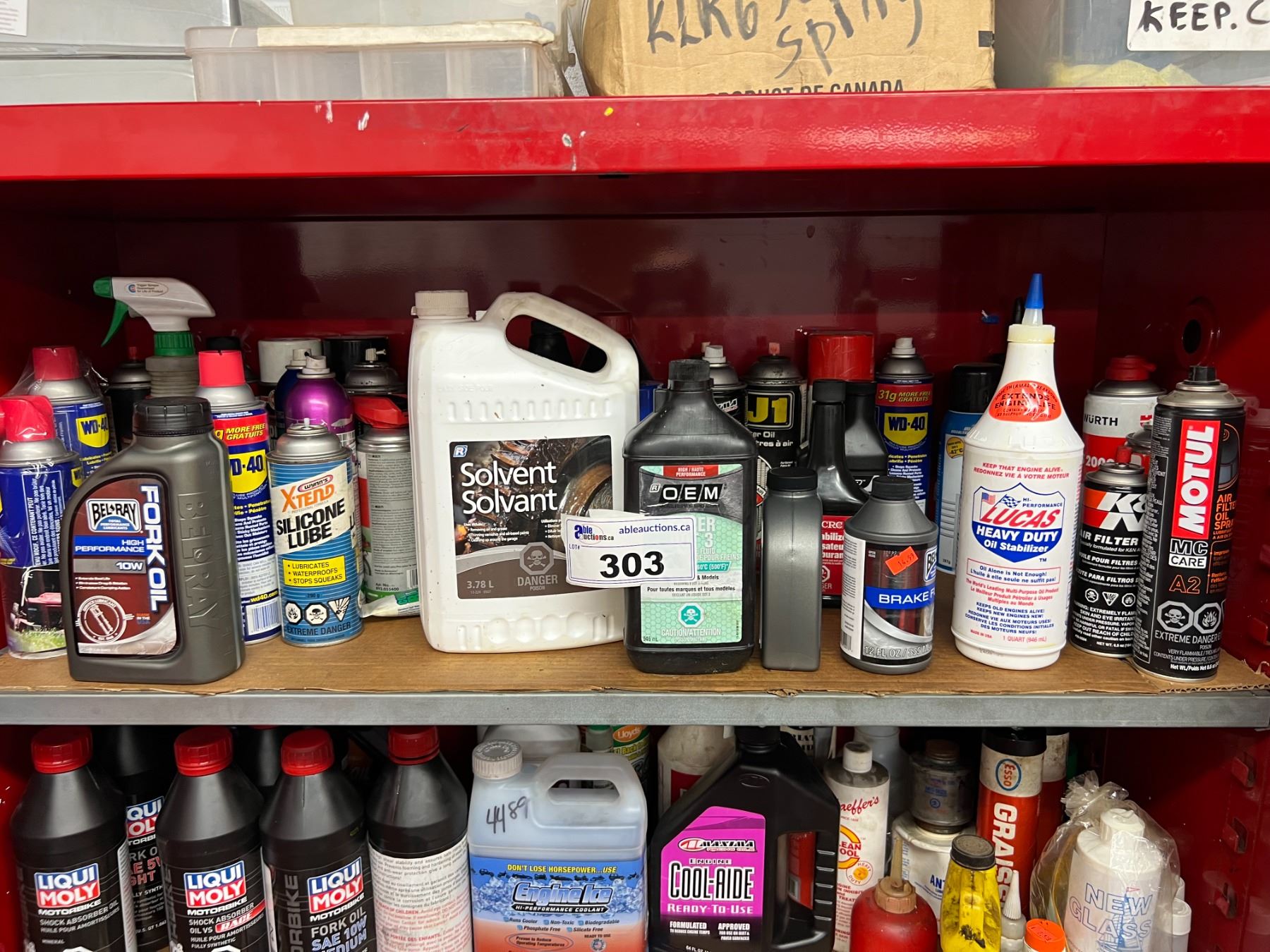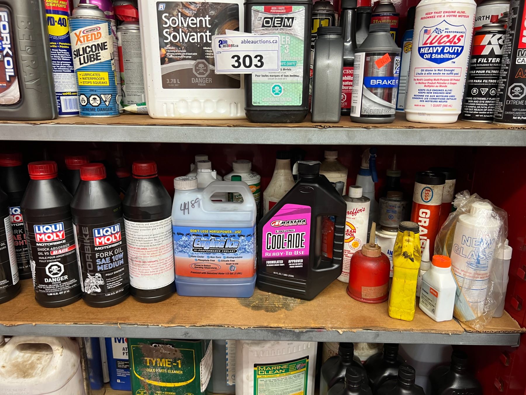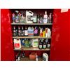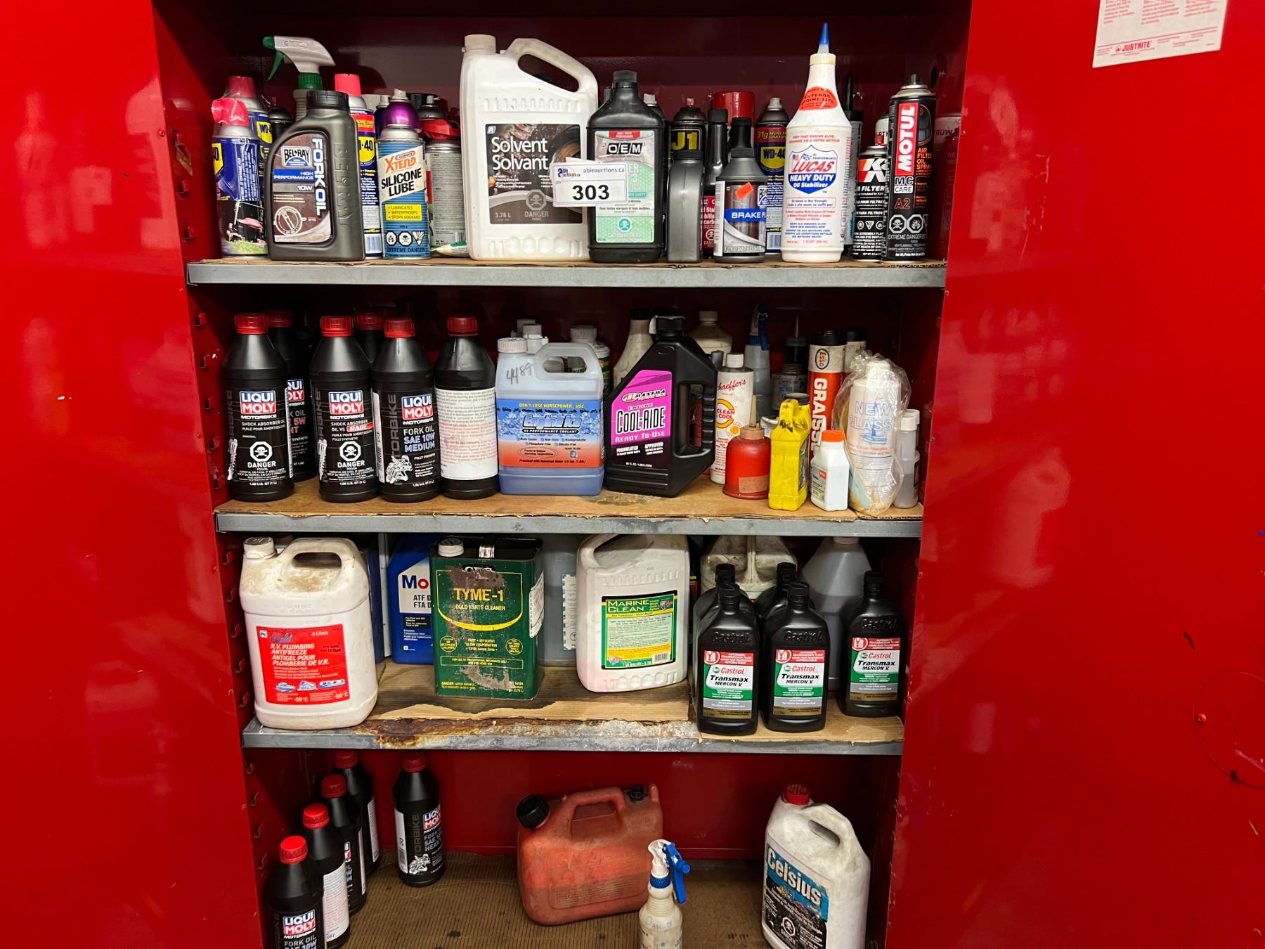 CONTENTS OF CABINET (OILS, FORK OIL, BRAKE FLUID, SOLVENTS, GREASE, TRANSMISSION OILS,