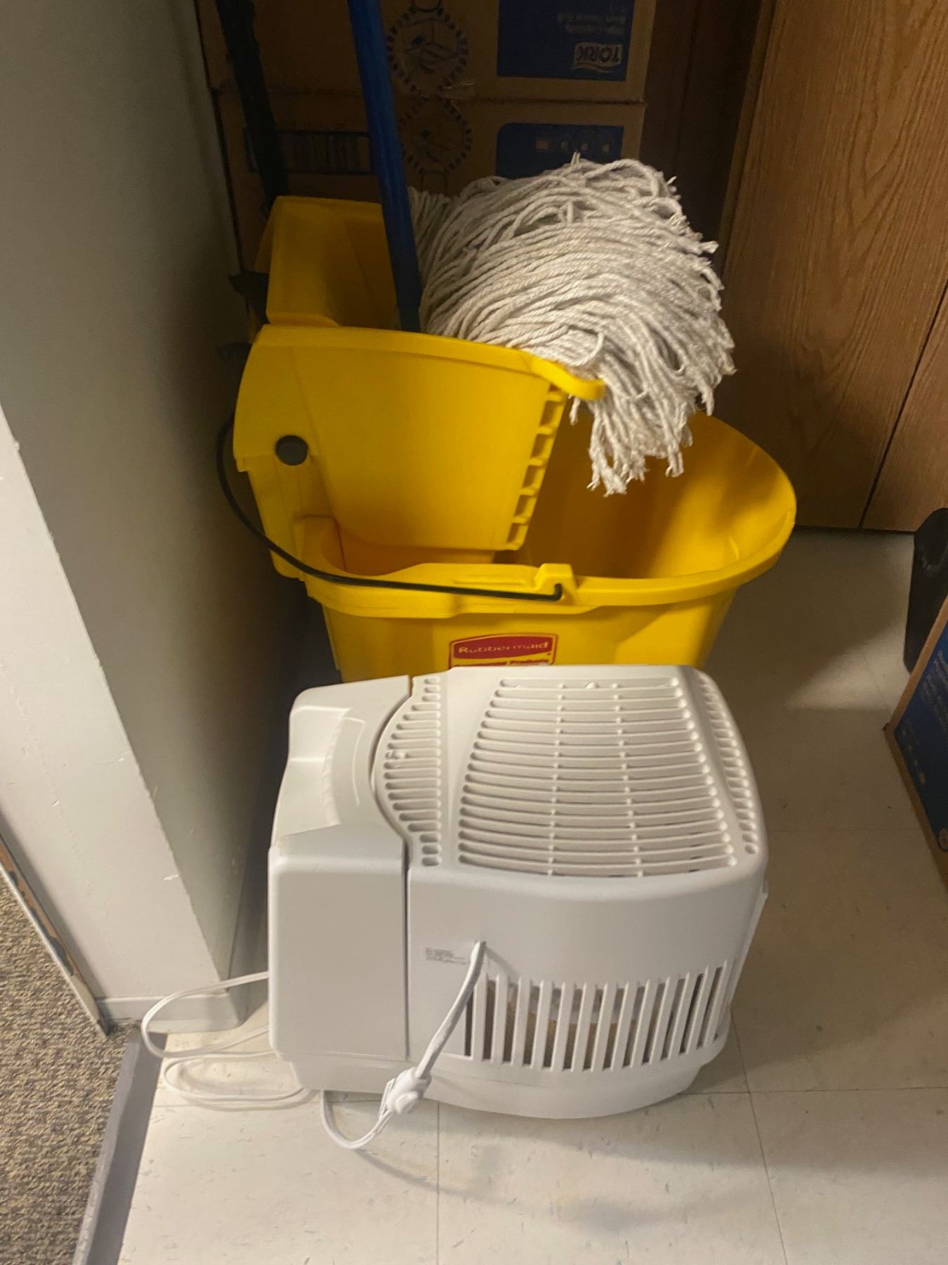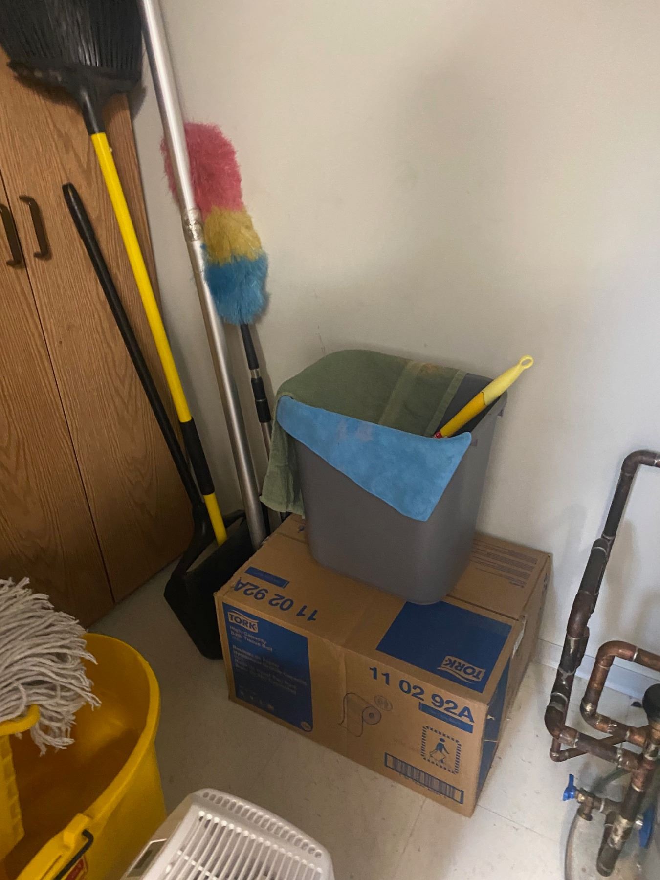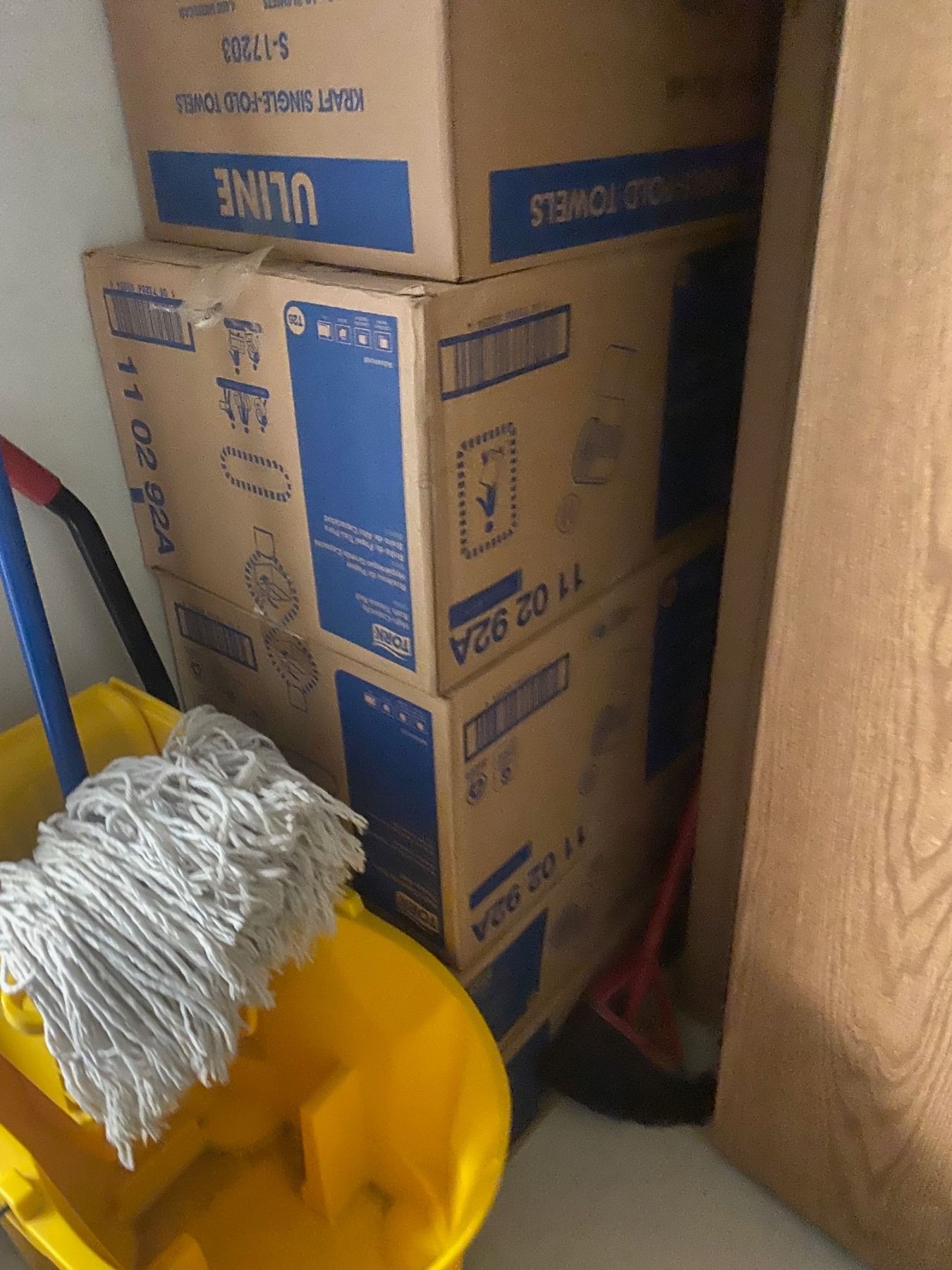 CONTENTS OF CLOSET; MOP BUCKETS, AIR PURIFIER, TOILET PAPER AND MORE