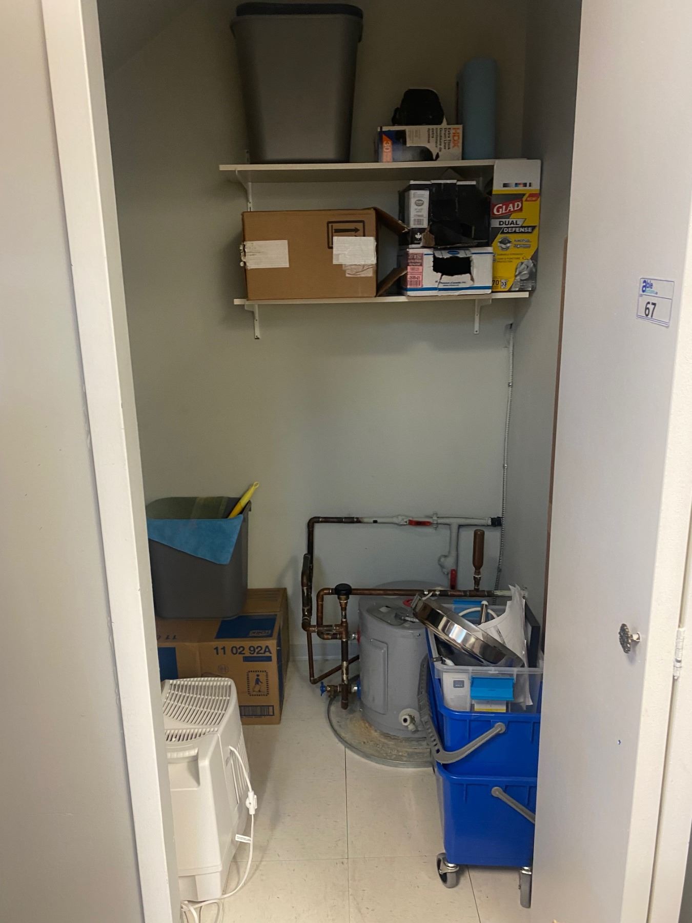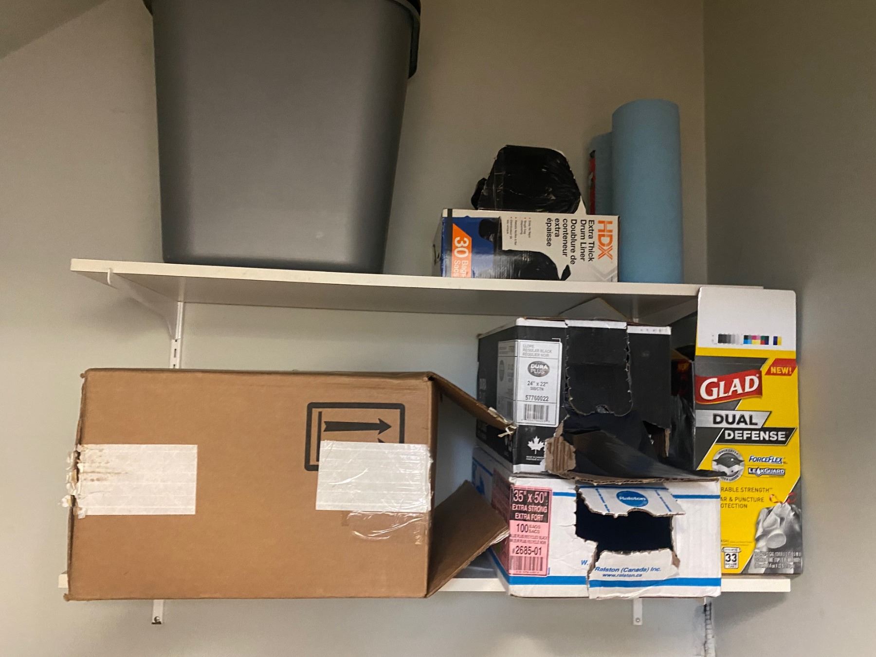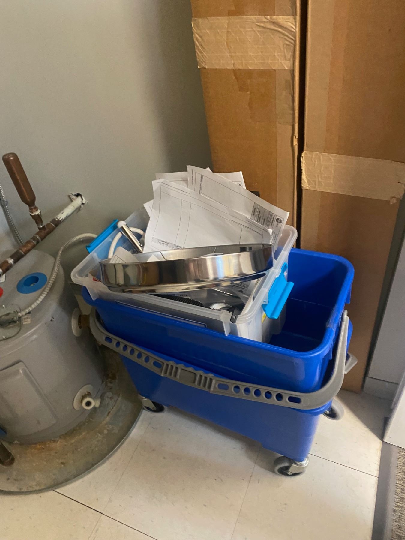 CONTENTS OF CLOSET; MOP BUCKETS, AIR PURIFIER, TOILET PAPER AND MORE