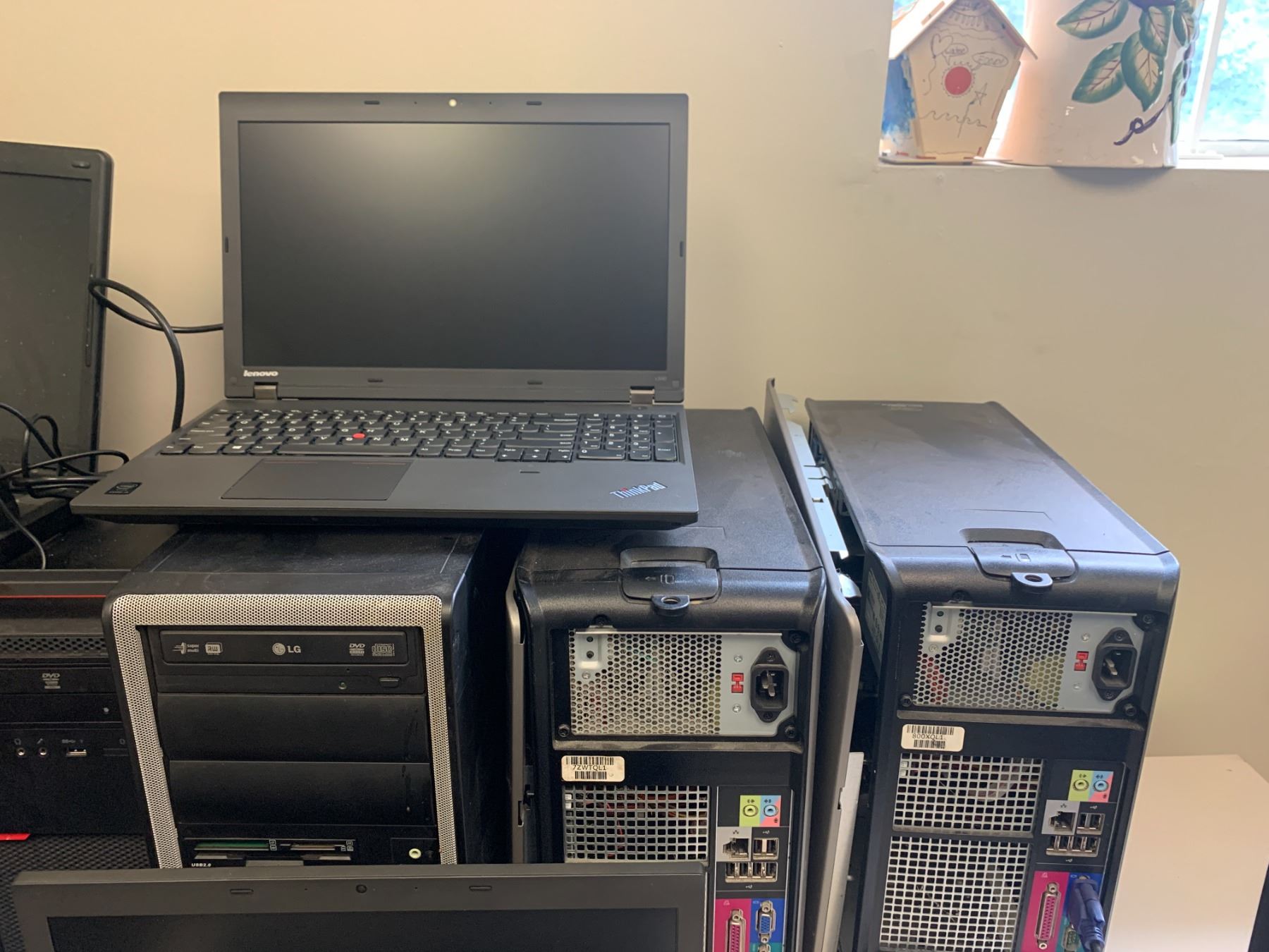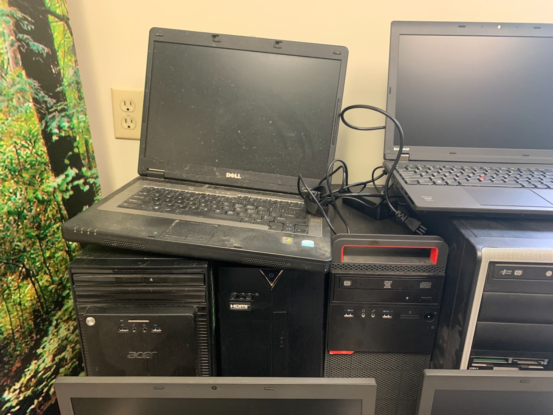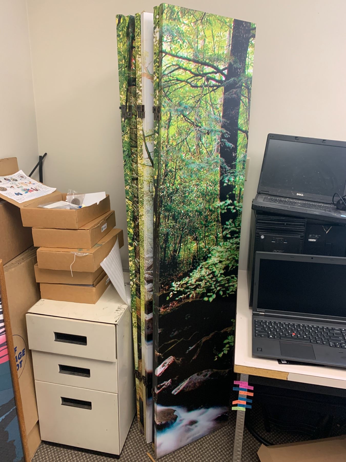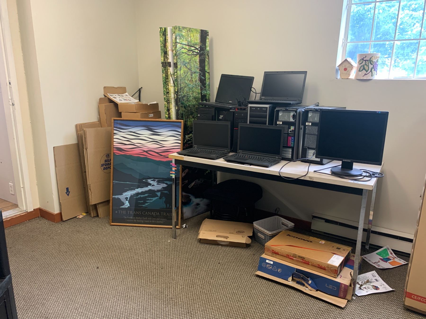 CONTENTS OF CORNER, WITH TABLE, PRIVACY SCREEN AND COMPUTERS (HARD DRIVES REMOVED)