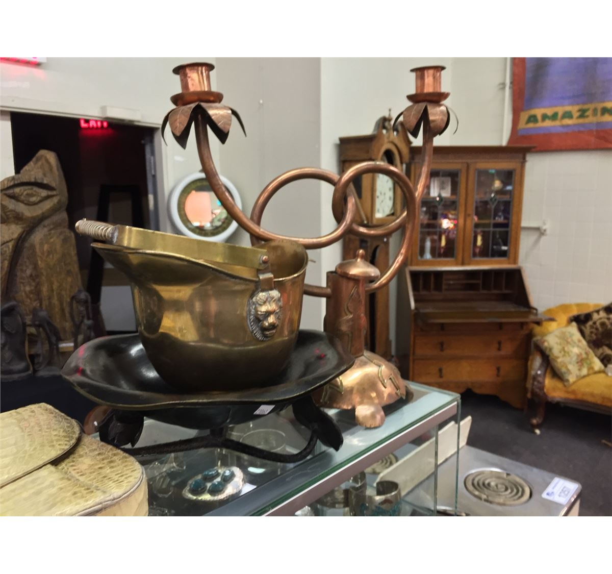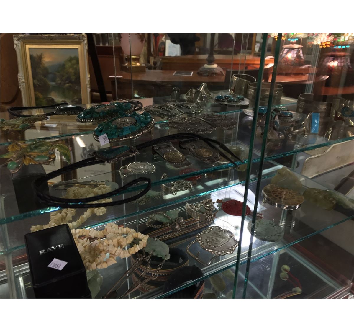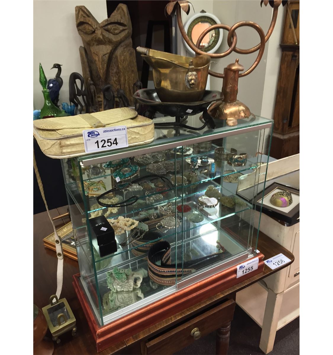 CONTENTS OF CURIO CABINET INCLUDES JADE PIECES, COPPER ITEMS, REPTILE SKIN PURSE AND MISC. JEWELLERY