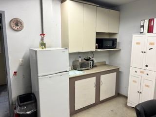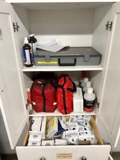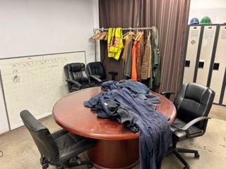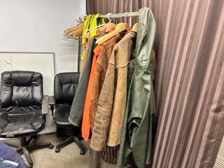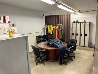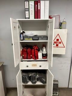 CONTENTS OF FIRST AID ROOM INCLUDING: FIRST AID CABINET, CONTENTS, METAL SHELF OF WELDING SUPPLIES, WOODEN CABINETS, CLOTHING RACKS, METAL LOCKERS, DIPLOMAT FRIDGE, RCA MICROWAVE, STAINLESS STEEL TOASTER OVEN, ELECTRIC KETTLE, CONFERENCE TABLE & ASSORTED OFFICE CHAIRS (ITEMS ARE SUBJECT TO CHANGE FROM PICTURES PLEASE PREVIEW)