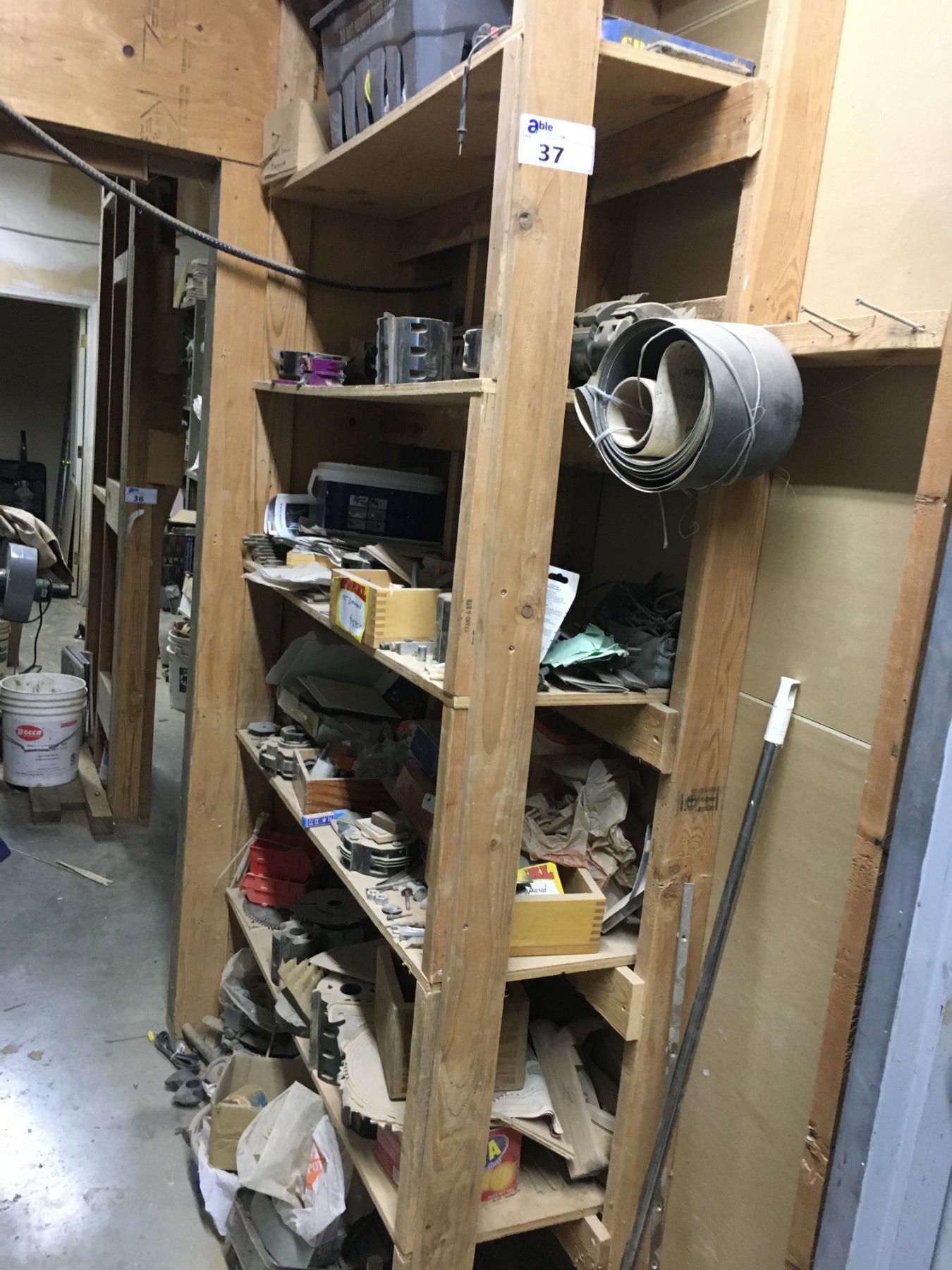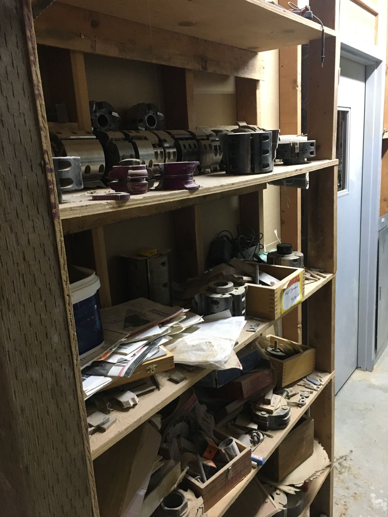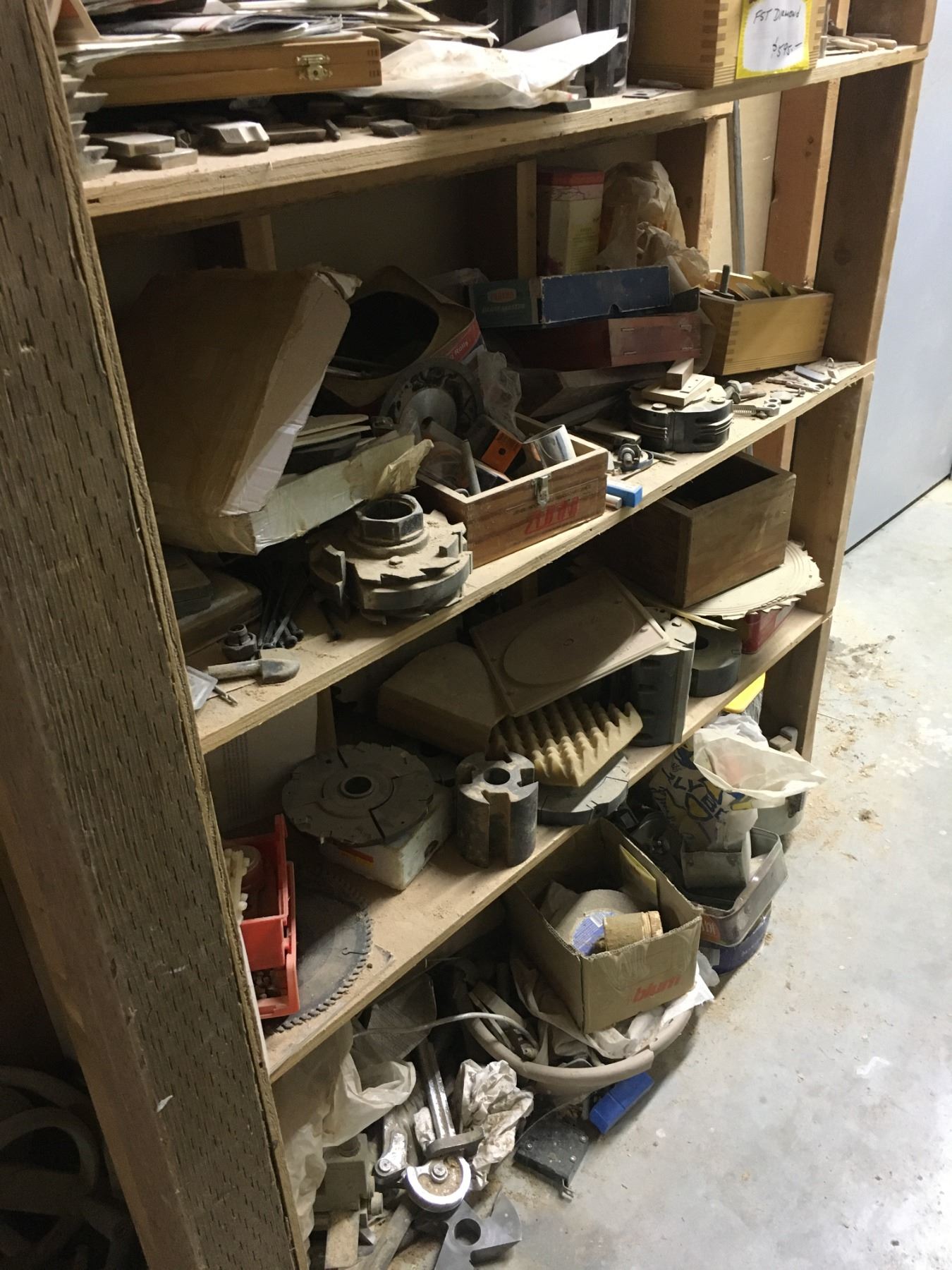 CONTENTS OF LARGE WOODEN SHELF UNIT-ASSORTED CUTTERS, HARDWARE AND MISCELLANEOUS ITEMS