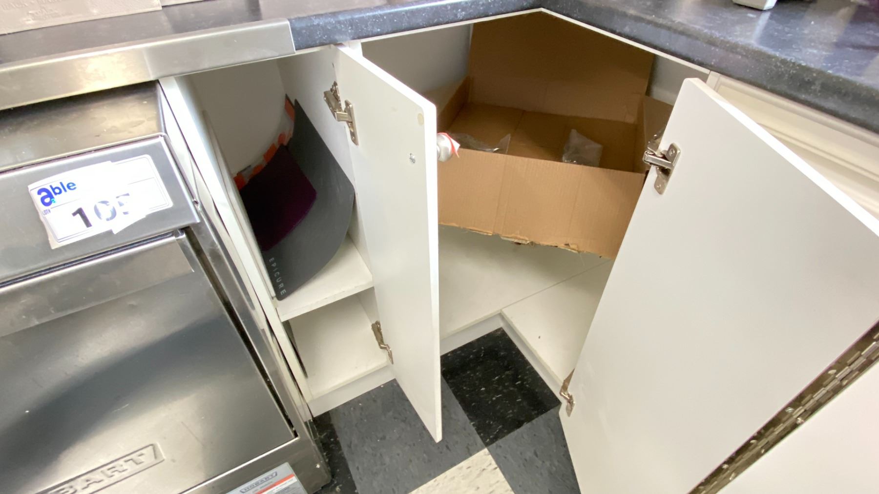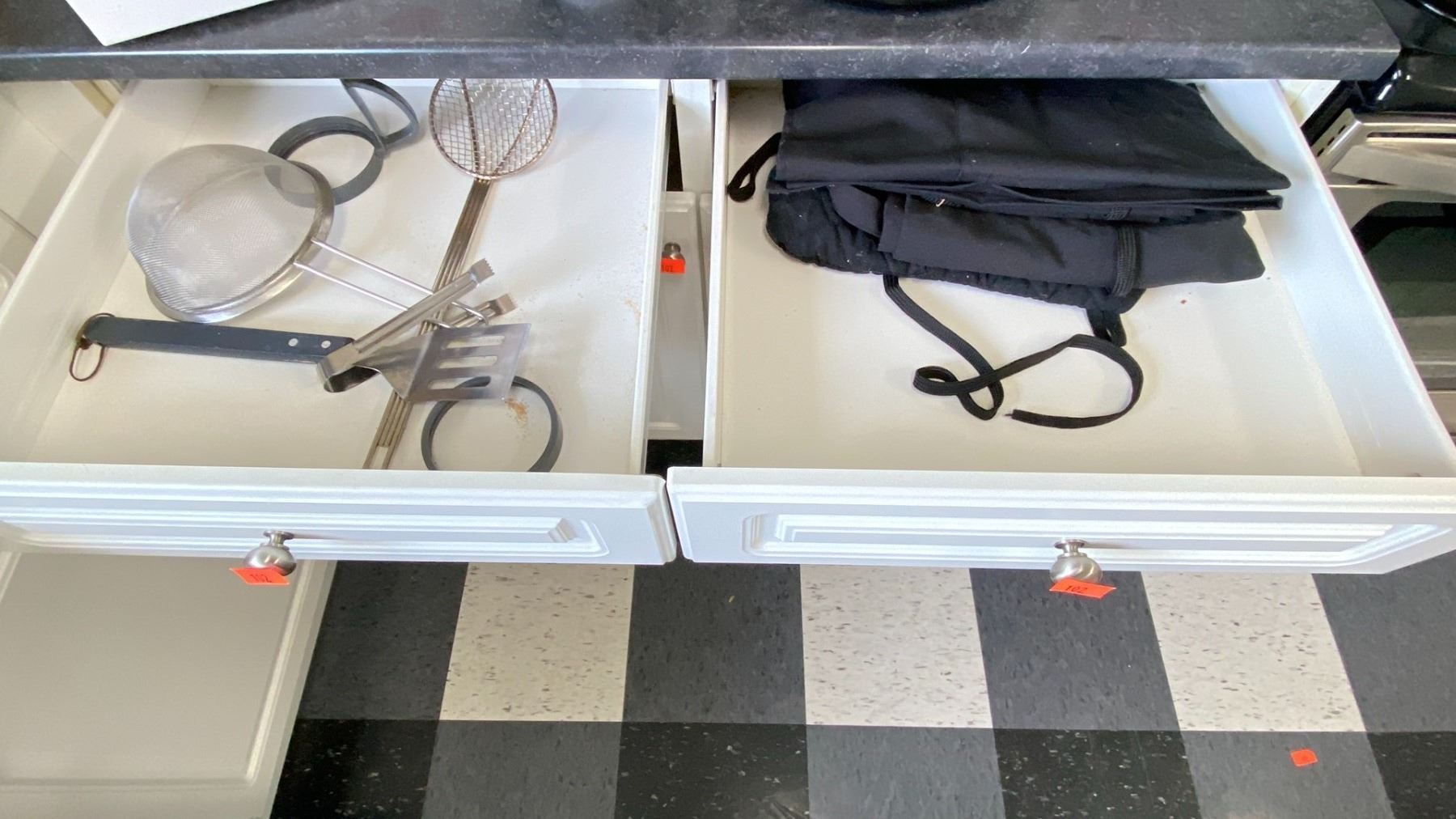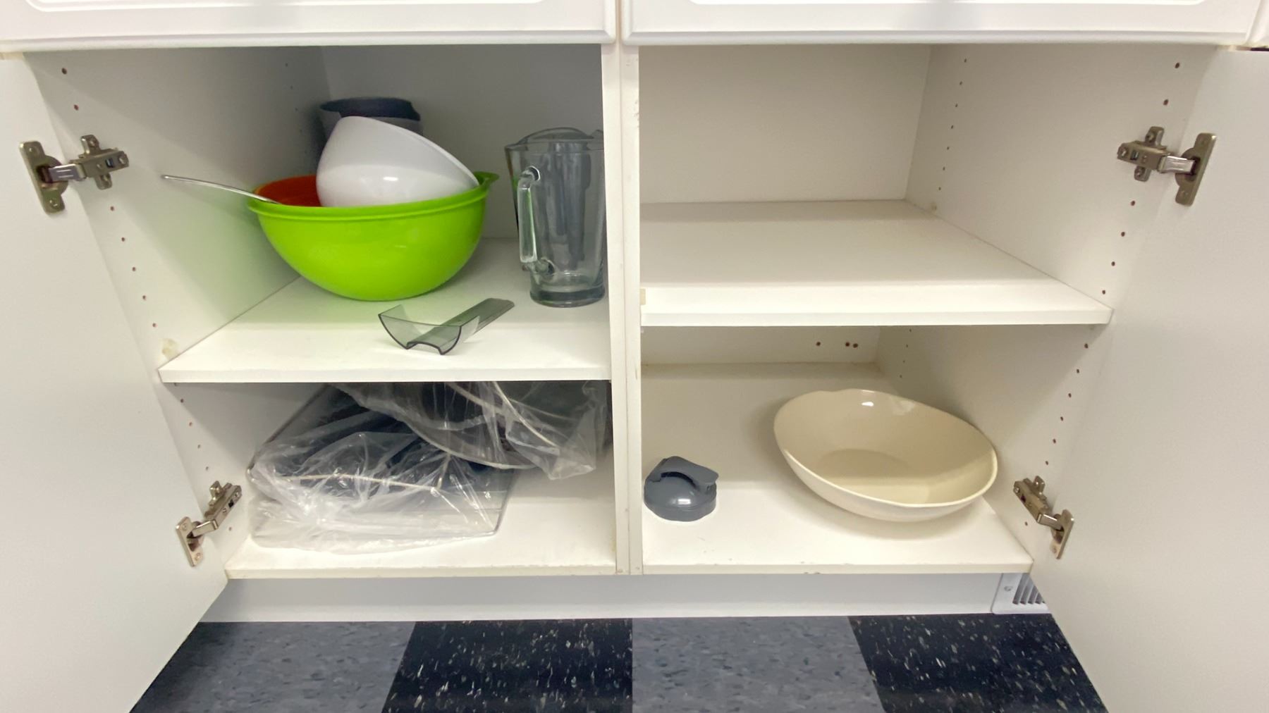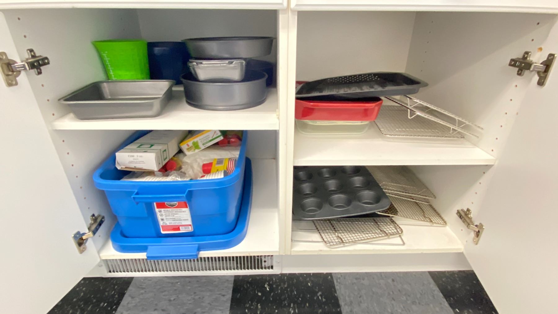 CONTENTS OF LOWER CABINETS. BAKING PANS, CUPCAKE PANS, WHISK, COOKIE CUTTERS, TOTE OF DISPOSABLE