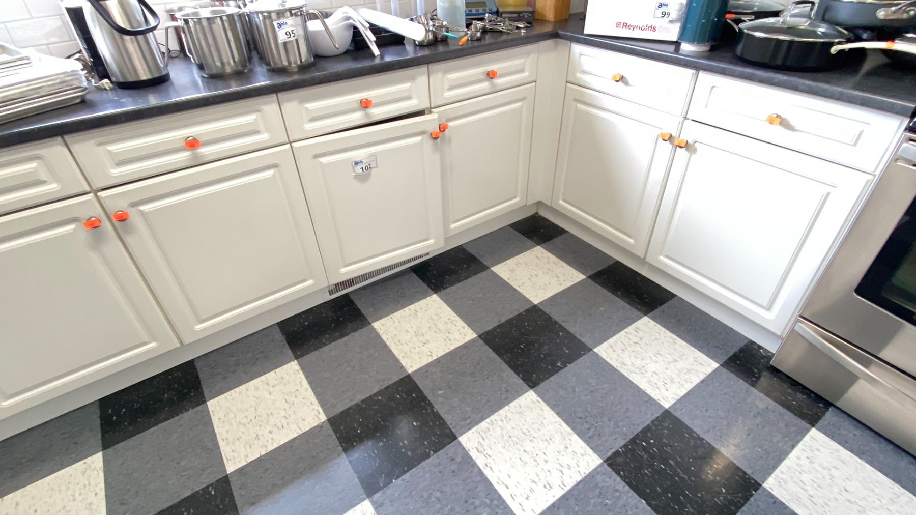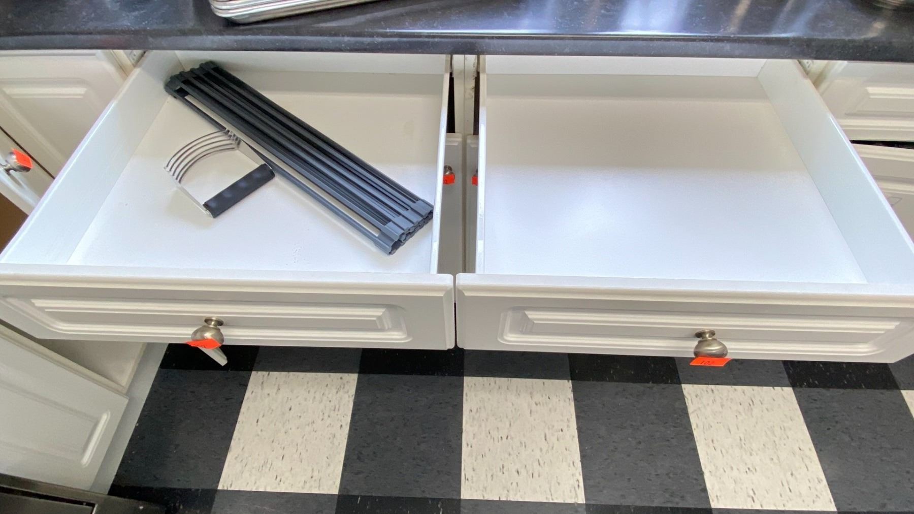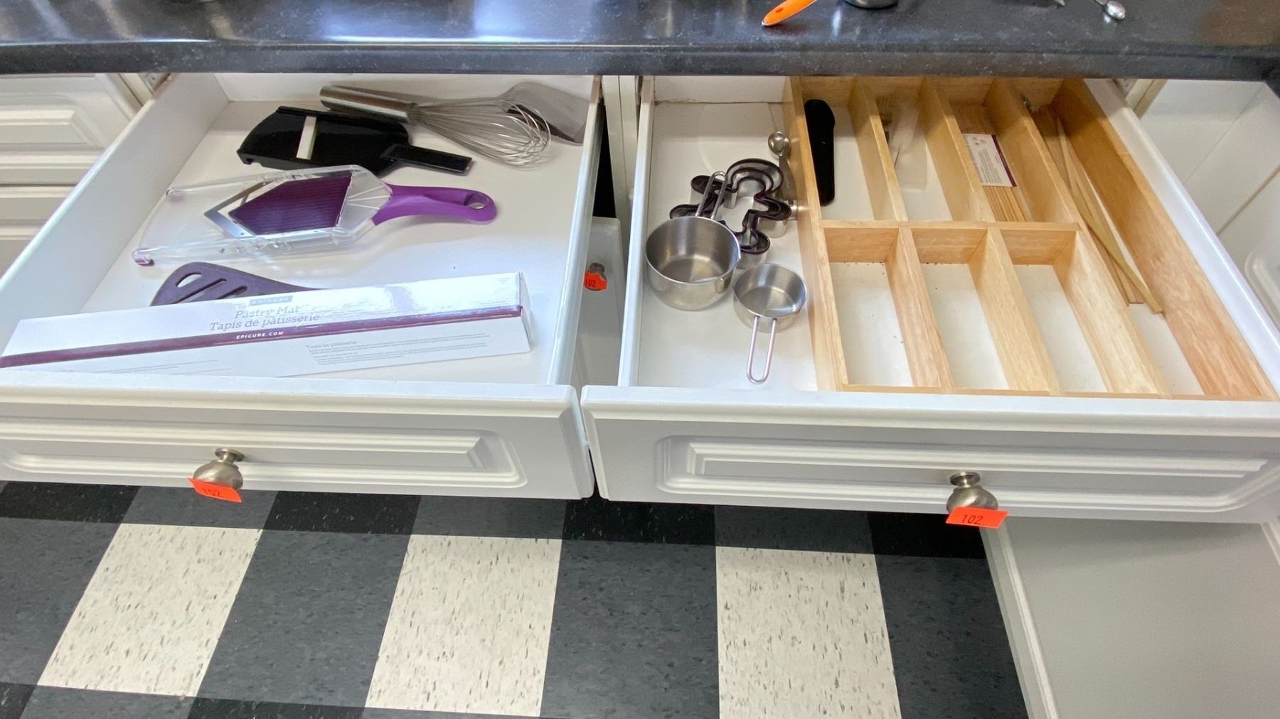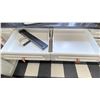 CONTENTS OF LOWER CABINETS. BAKING PANS, CUPCAKE PANS, WHISK, COOKIE CUTTERS, TOTE OF DISPOSABLE