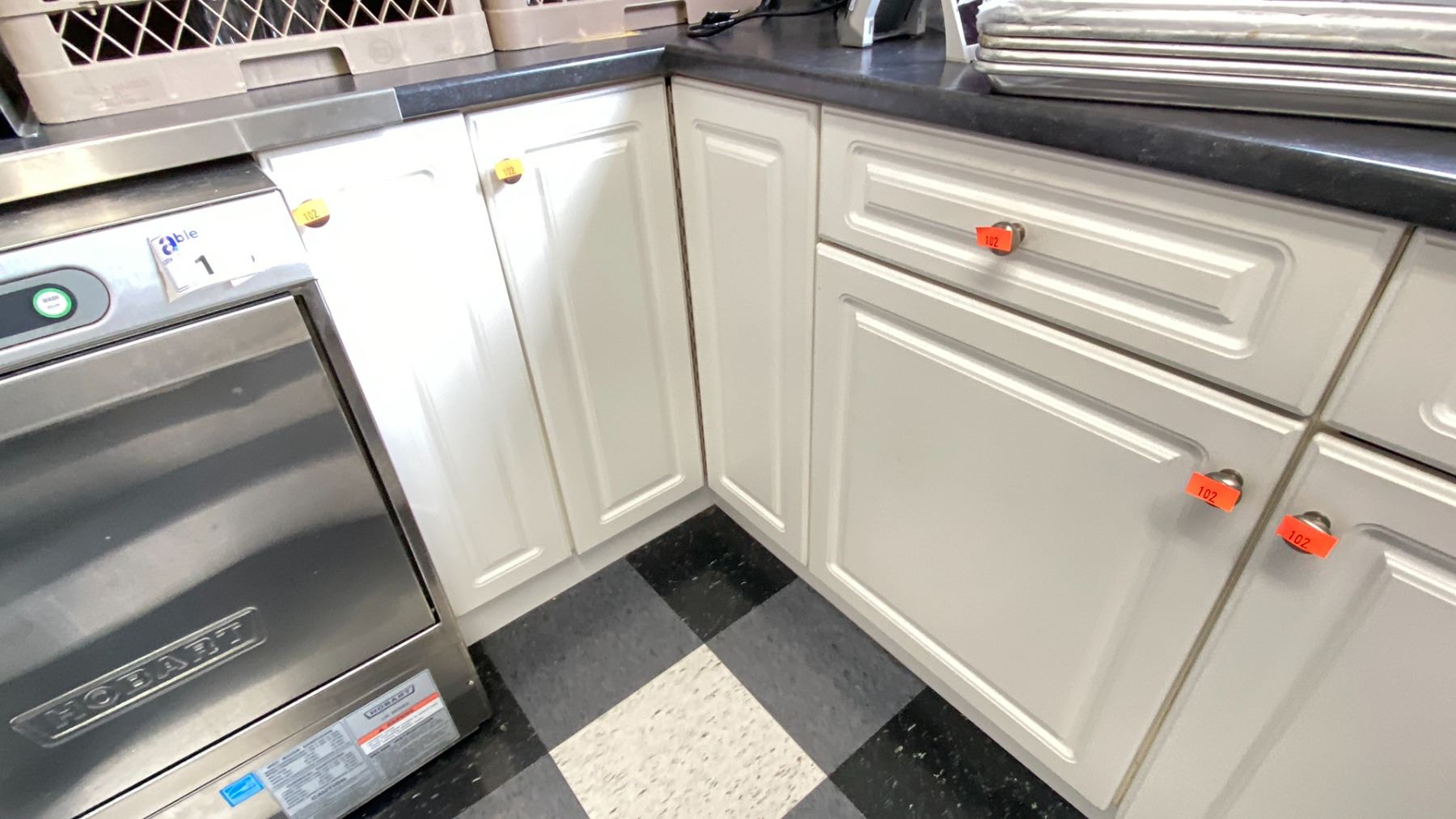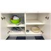 CONTENTS OF LOWER CABINETS. BAKING PANS, CUPCAKE PANS, WHISK, COOKIE CUTTERS, TOTE OF DISPOSABLE ITEMS, ETC.