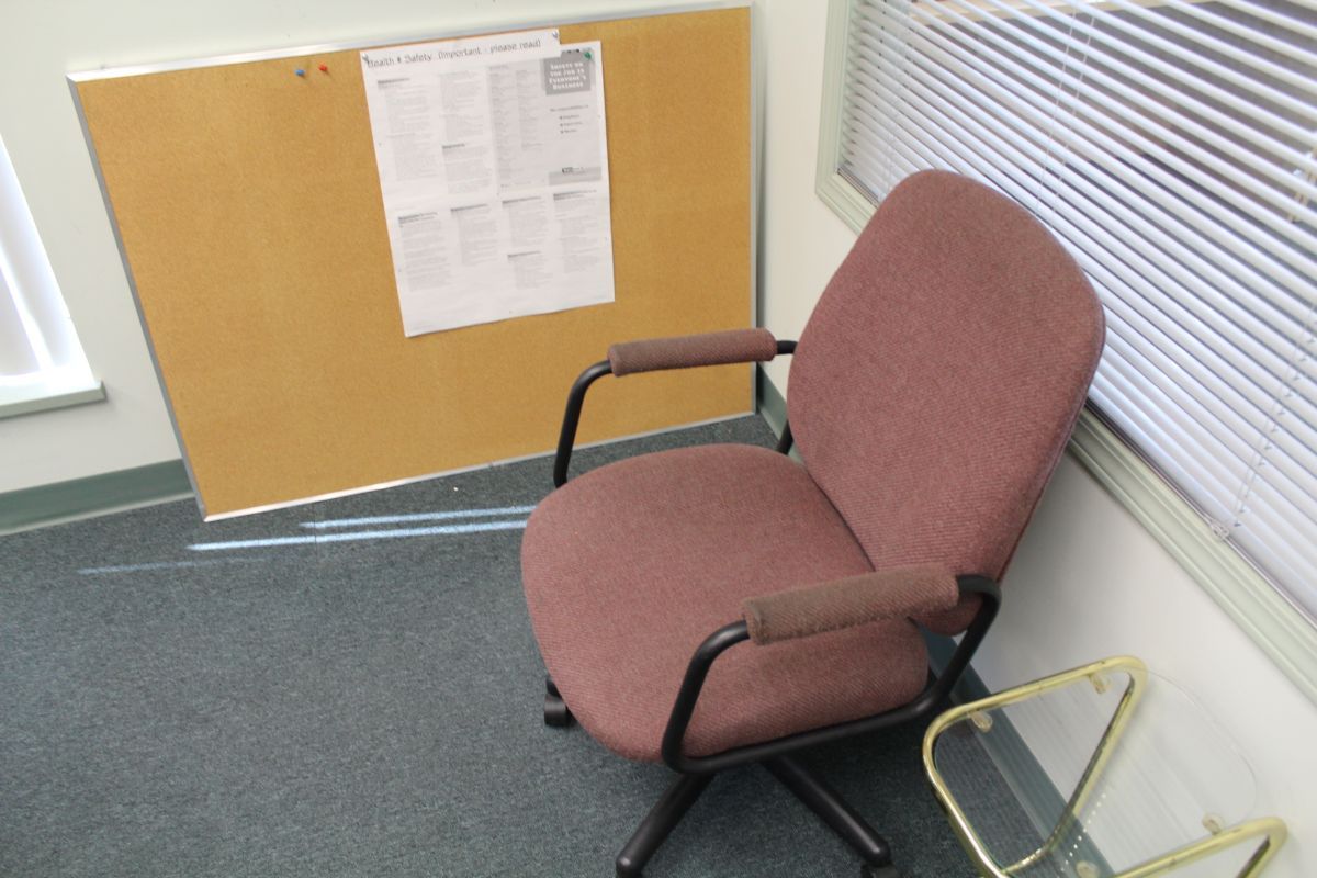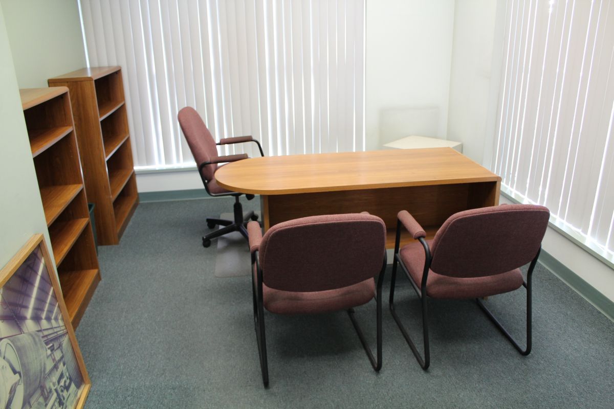 CONTENTS OF LOWER OFFICE INCLUDING: DESK, 2 OFFICECHAIRS, 2 CLIENT CHAIRS, 2 BOOK SHELFS, PRINTER CABINET, CORK BOARD, PICTURE AND END TABLE