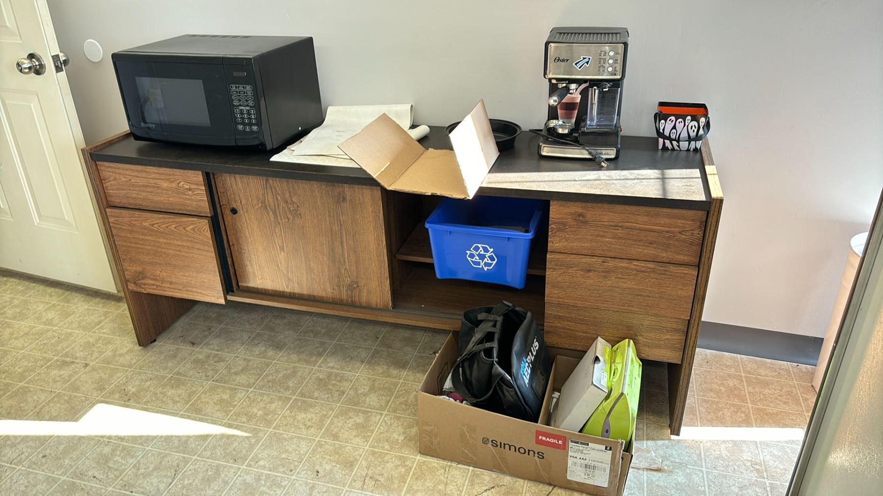 CONTENTS OF LUNCHROOM - APPLIANCES, MICROWAVE, TOASTER, DISHWASHER, FRIDGE, 2 CREDENZAS, GARBAGE CANS, COFFEE MAKER