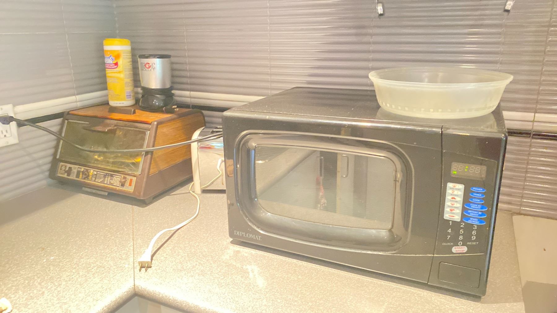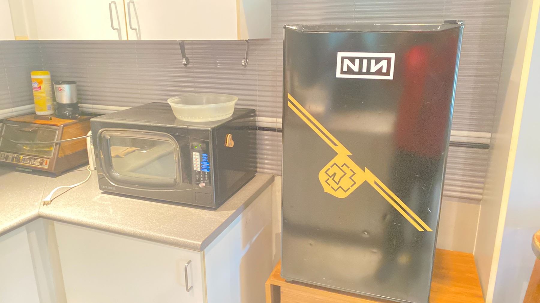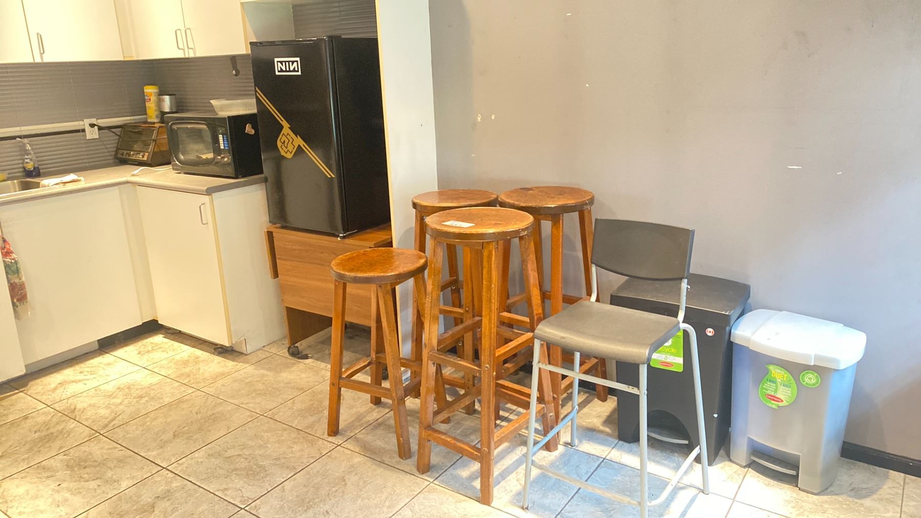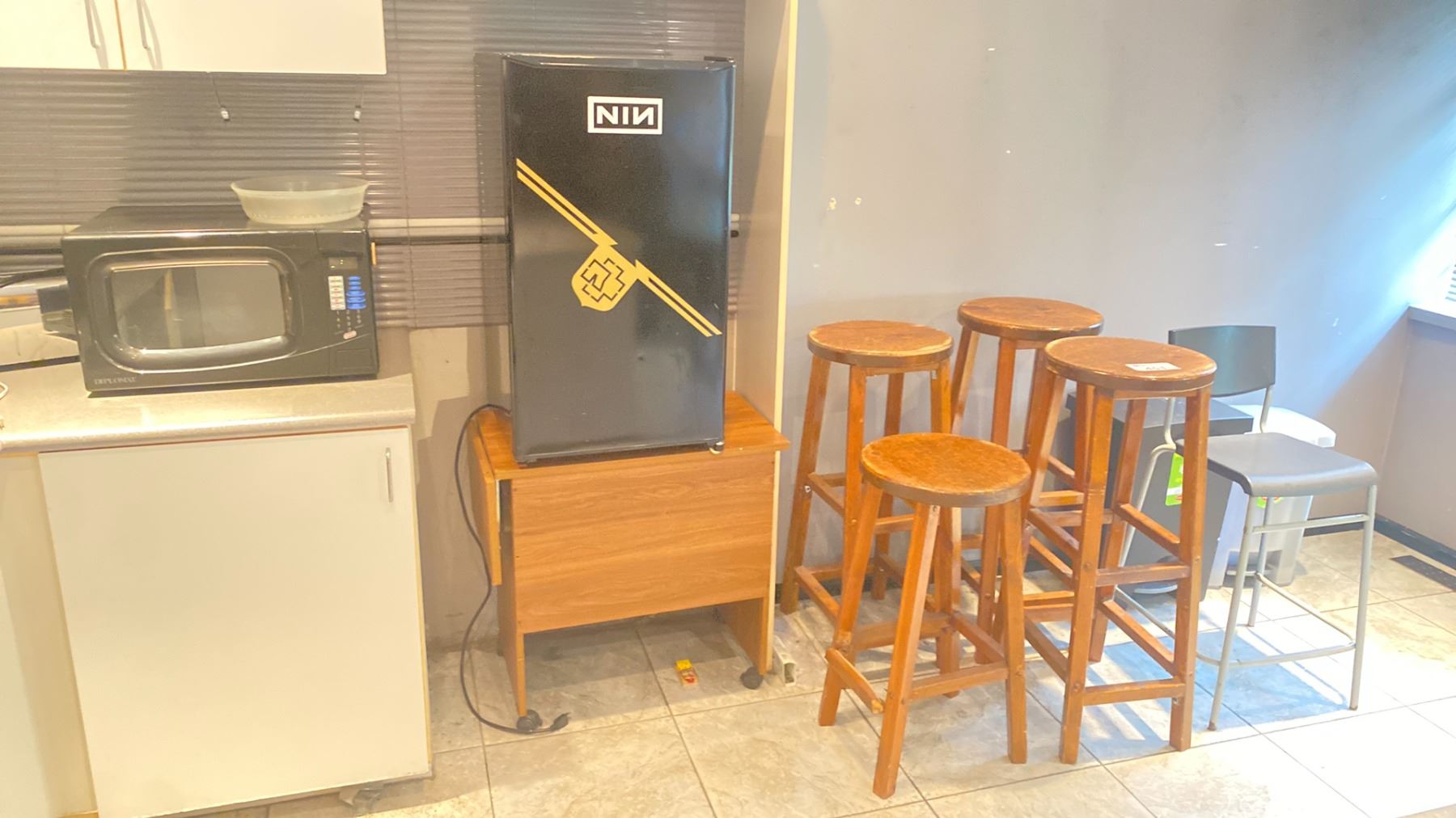 CONTENTS OF LUNCHROOM; STOOLS, MINI FRIDGE, MICROWAVE AND MORE