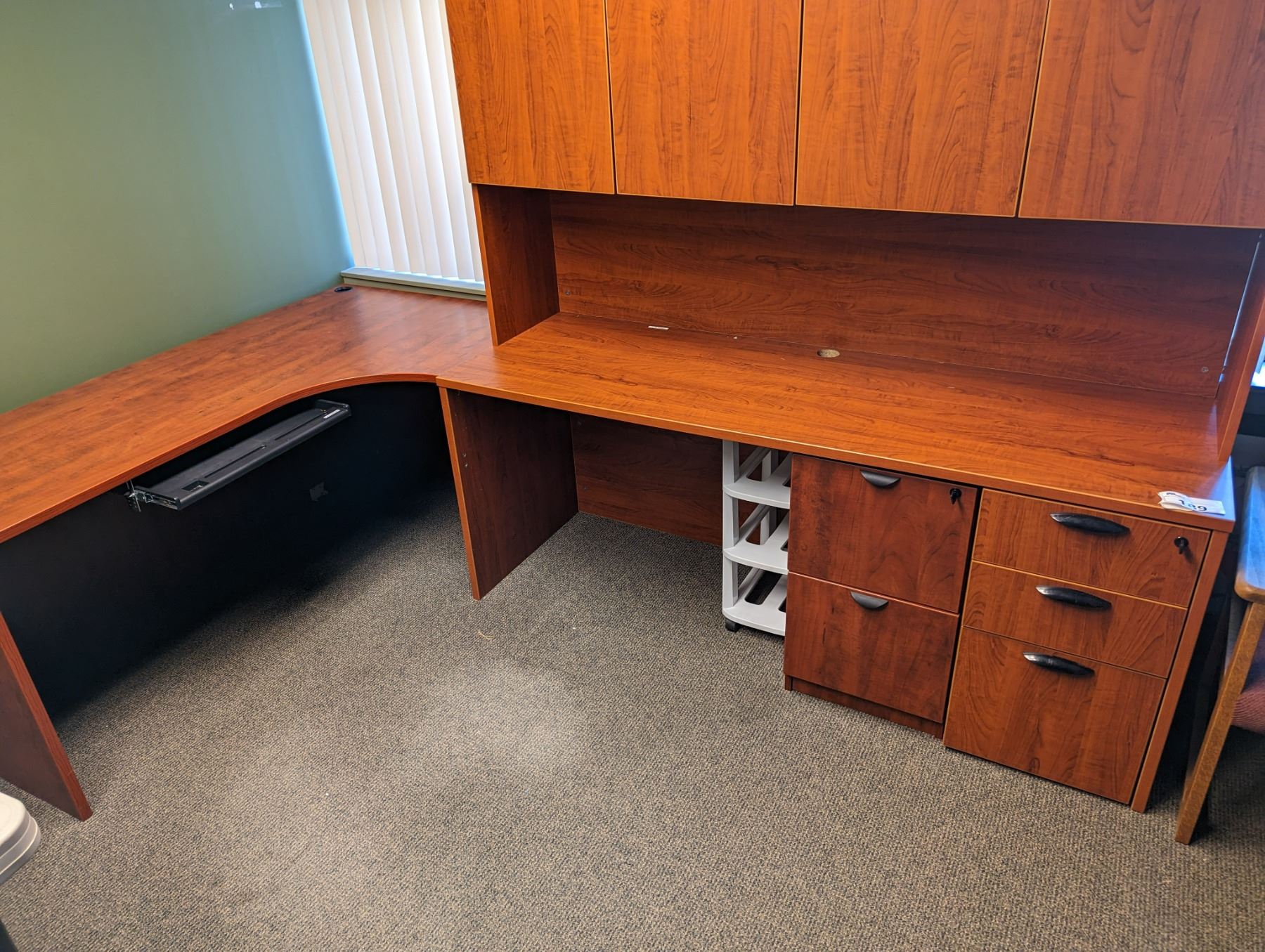 CONTENTS OF MIDDLE OFFICE. 6' ARTIFICIAL PLANT, 4' FOLDING TABLE, 9'X66" DESK WITH HUTCH 4 CHAIR, 32" BOOKSHELF. NOTE IMPERFECT COLOR MATCH ON DESK