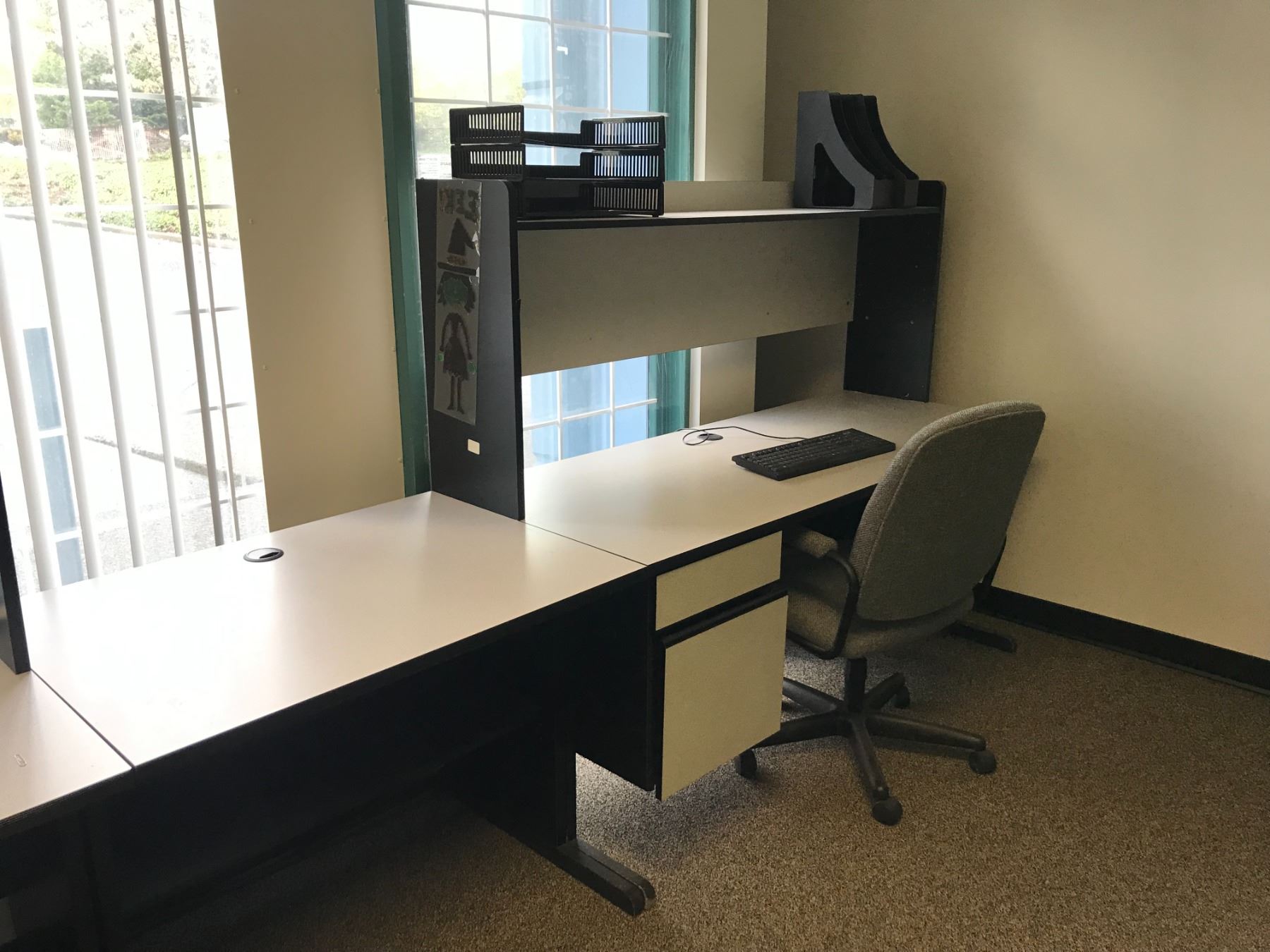 CONTENTS OF OFFICE-4 GREY & BLACK DESKS, 4 OFFICE CHAIRS, 1 FILLING CABINET, 2 MONITORS, ETC