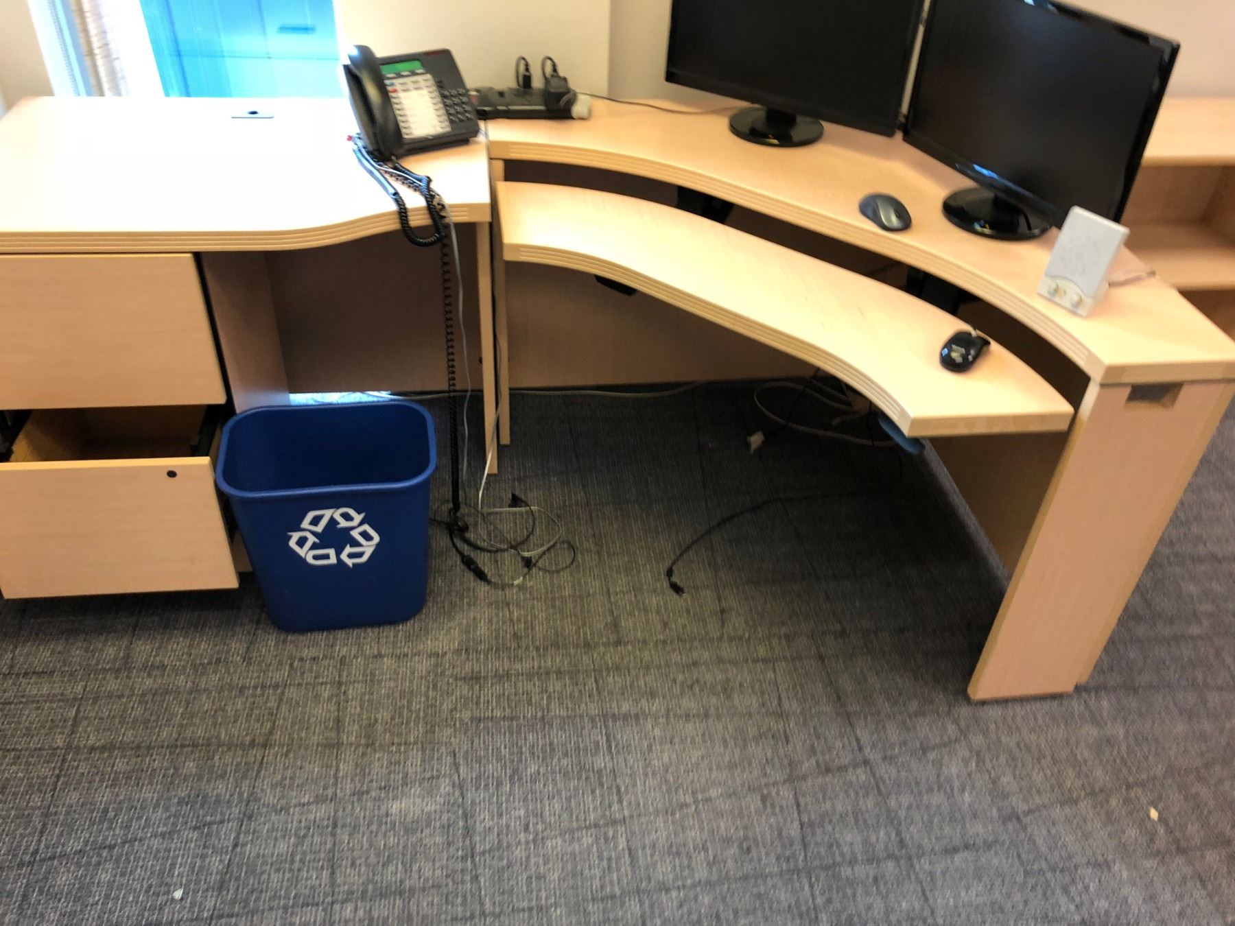 CONTENTS OF OFFICE INC. 2 MAPLE COMPUTER DESKS, 2 TALL BOOK SHELVES, 1 SHORT BOOK SHELF, AND