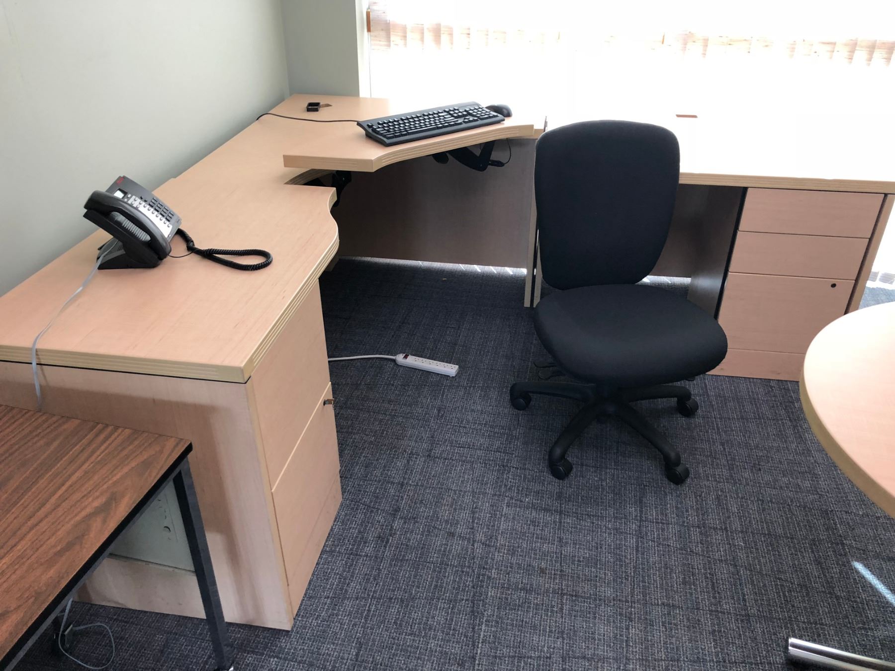 CONTENTS OF OFFICE INC. 2 MAPLE CORNER COMPUTER DESKS, MAPLE CONFERENCE TABLE, BOOK SHELF, AND BLACK STENO CHAIR