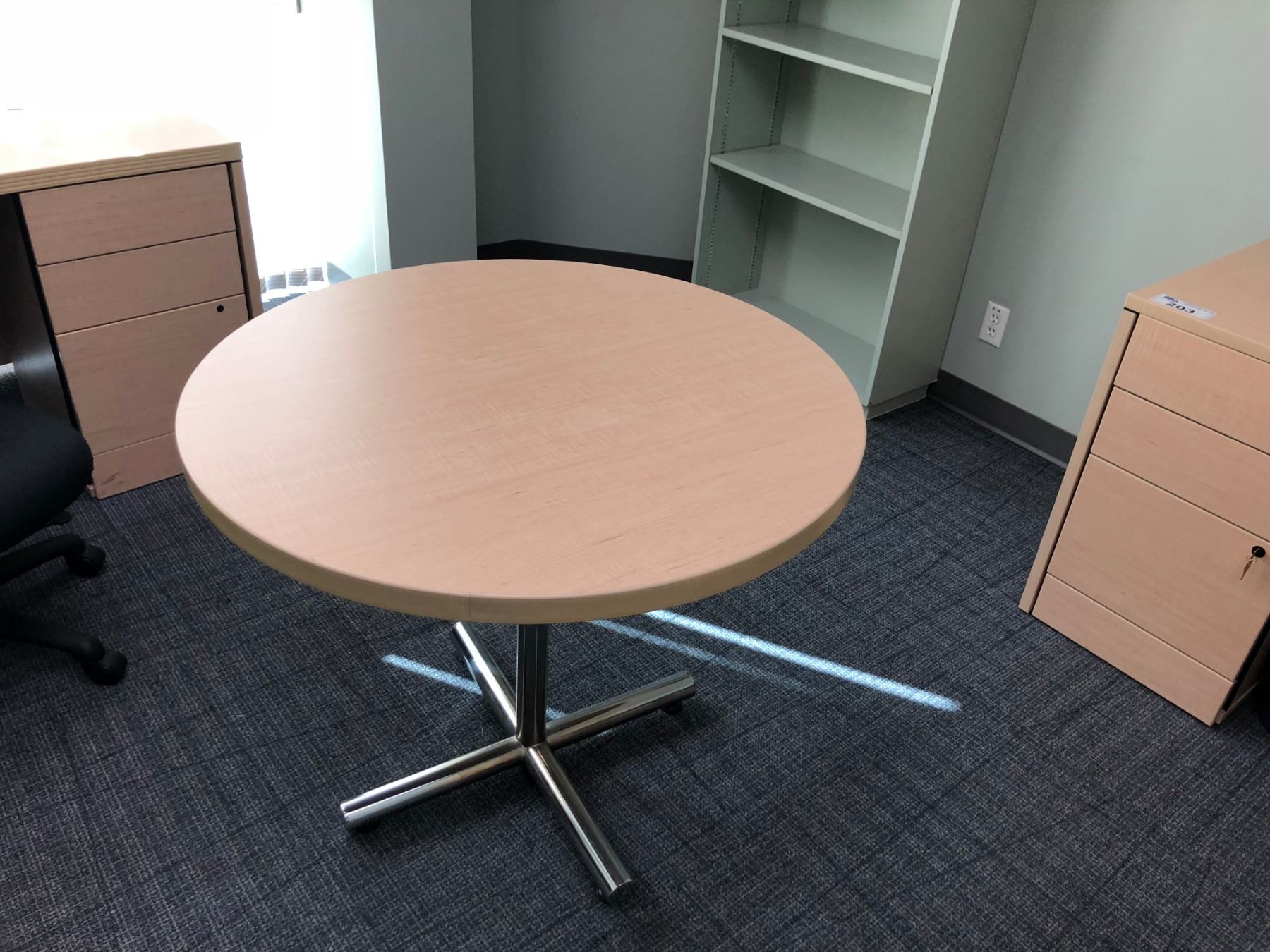 CONTENTS OF OFFICE INC. 2 MAPLE CORNER COMPUTER DESKS, MAPLE CONFERENCE TABLE, BOOK SHELF, AND