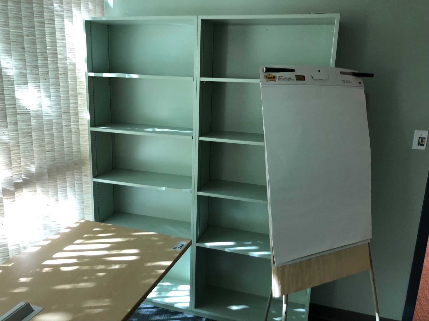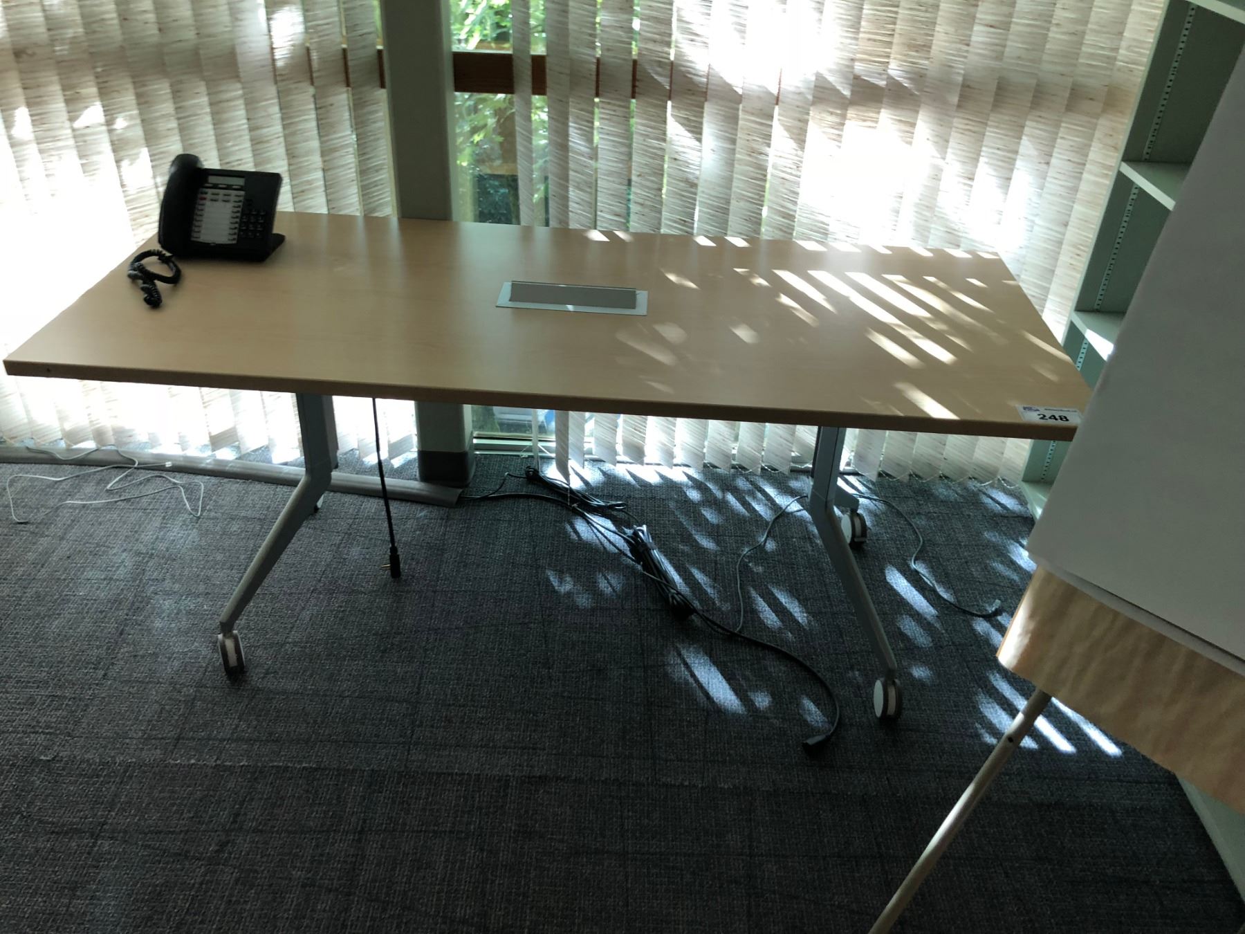 CONTENTS OF OFFICE INC. 2 MAPLE ROLLING COMPUTER TABLES, 2 TALL BOOK SHELVES, CONFERENCE TABLE, AND