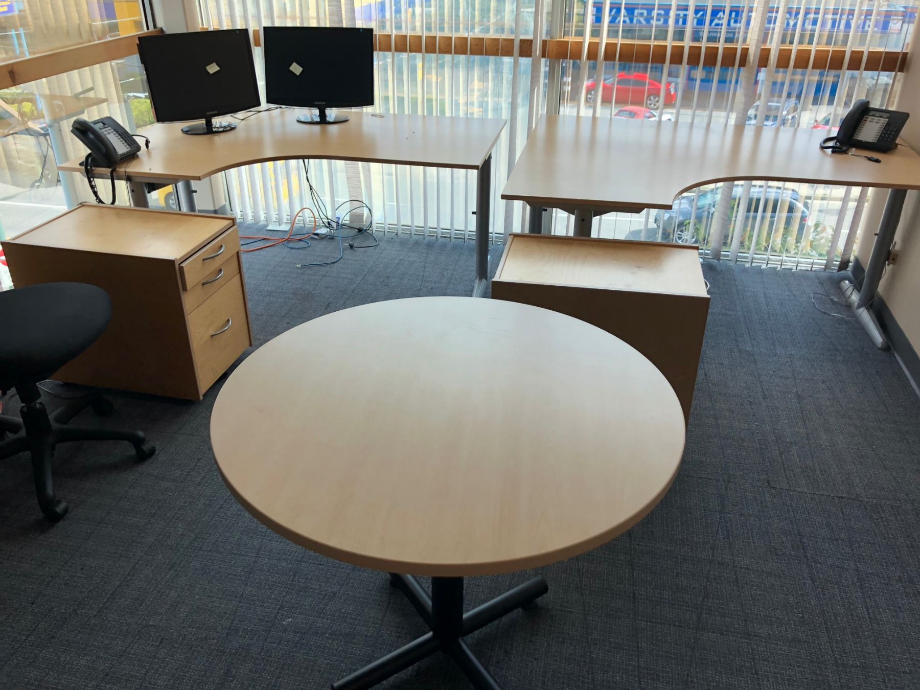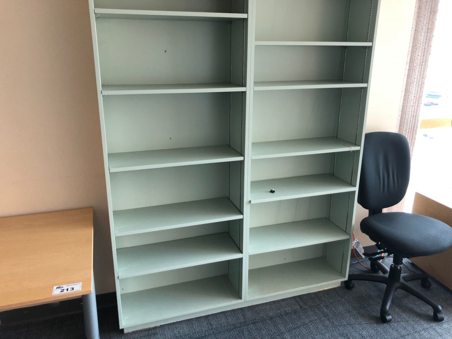 CONTENTS OF OFFICE INC. 3 MAPLE COMPUTER TABLES, MAPLE CONFERENCE TABLE, 2 MAPLE ROLLING FILE PEDESTALS, 2 TALL BOOK SHELVES, AND BLACK STENO CHAIR