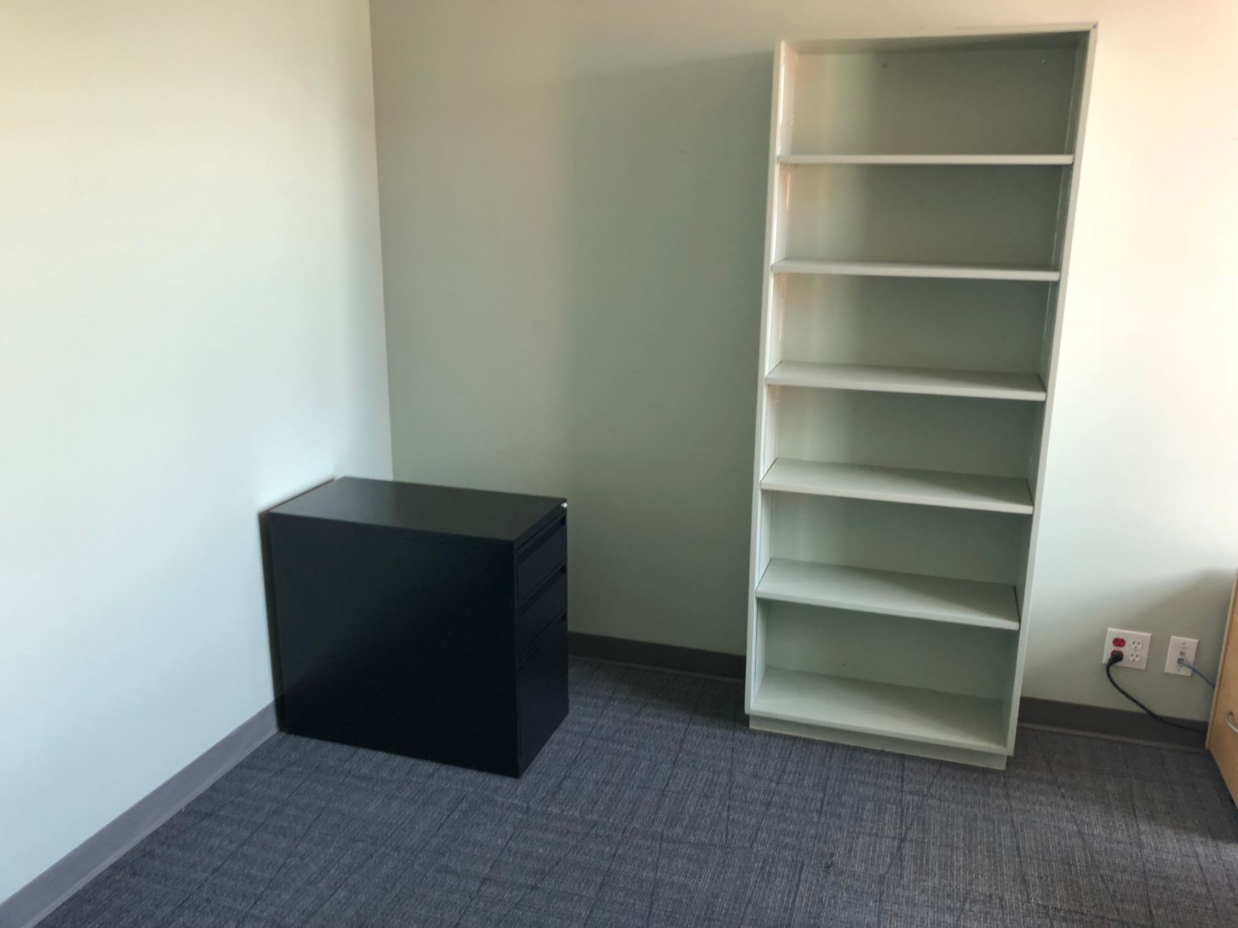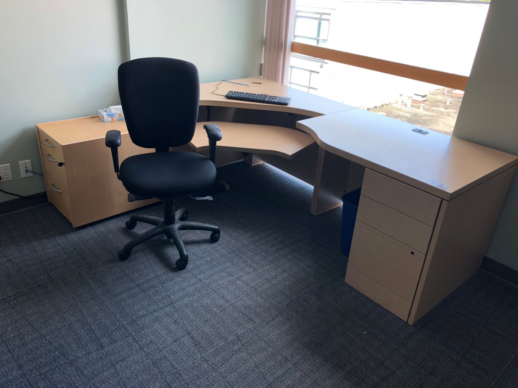 CONTENTS OF OFFICE INC. MAPLE COMPUTER DESK, 3 TALL BOOK SHELVES, AND 2 BLACK 3 DRAWER FILE PEDESTALS