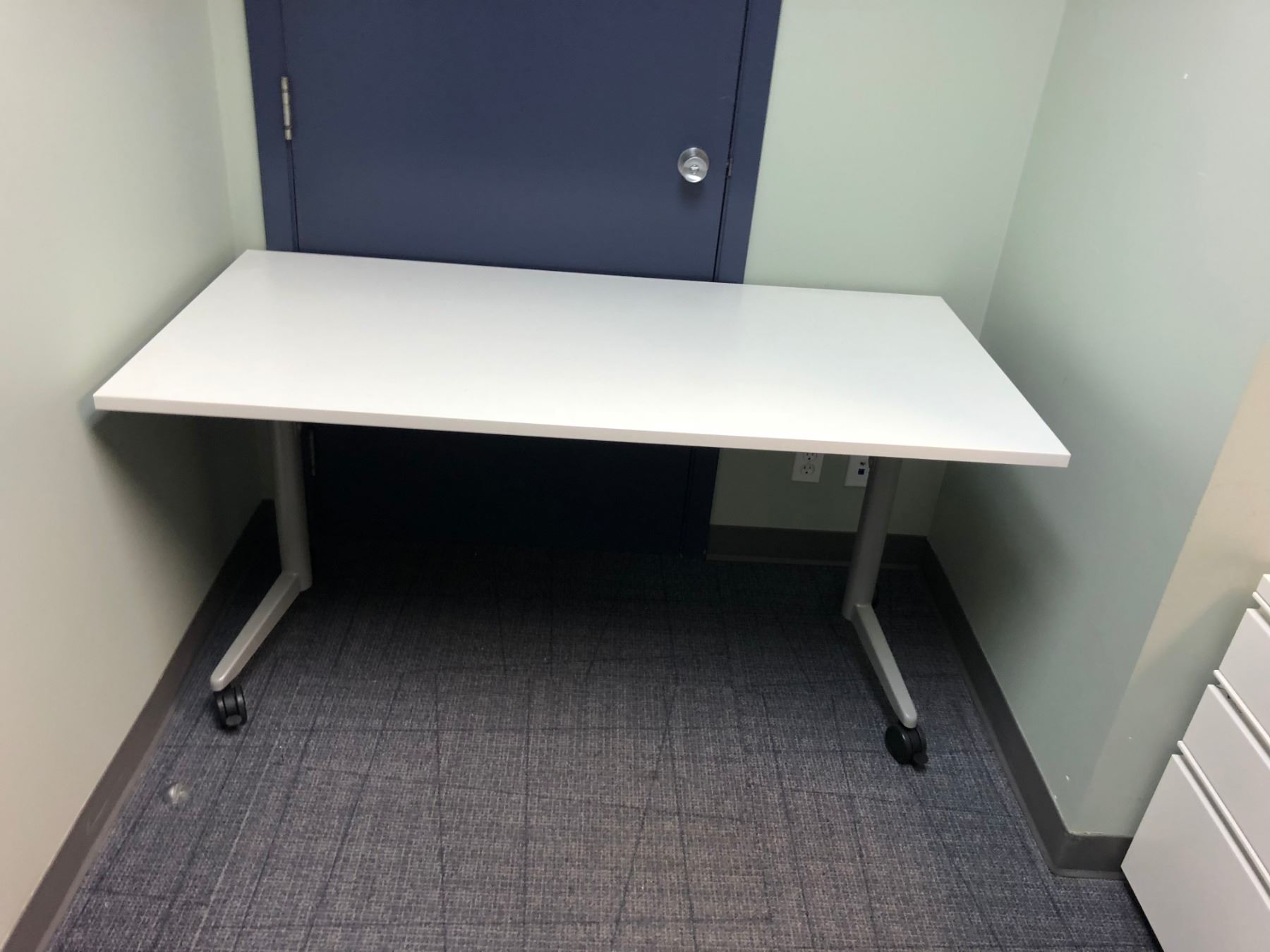 CONTENTS OF OFFICE INC. MAPLE COMPUTER DESK, WHITE ROLLING COMPUTER TABLE, BLACK 5 DRAWER LATERAL FILE CABINET, AND FILE PEDESTAL