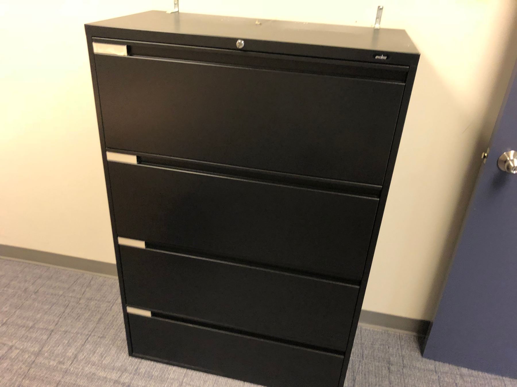 CONTENTS OF OFFICE INC. MAPLE CORNER COMPUTER DESK, BLACK 4 DRAWER LATERAL FILE CABINET, AND EGAN 4' X 6' WHITE BOARD
