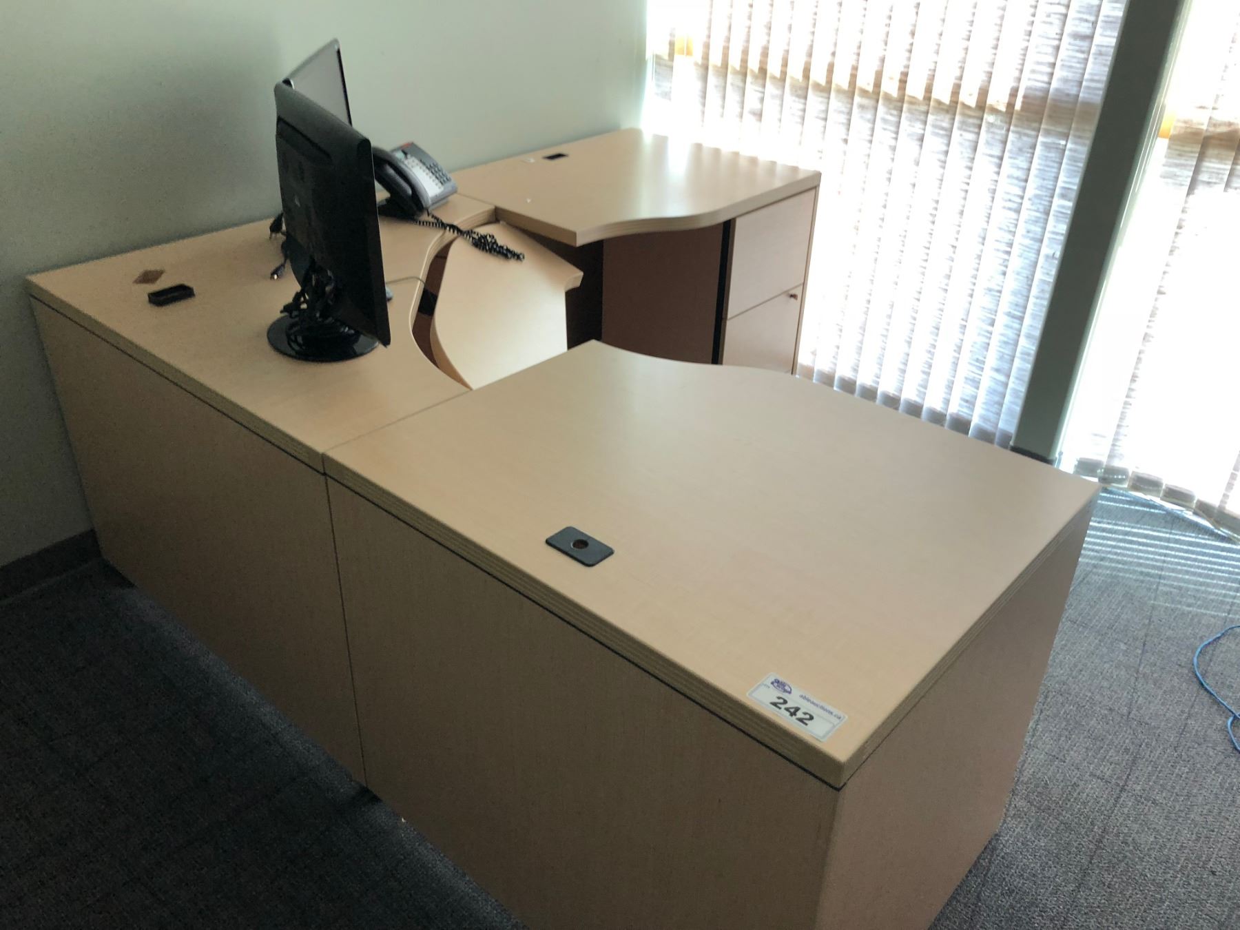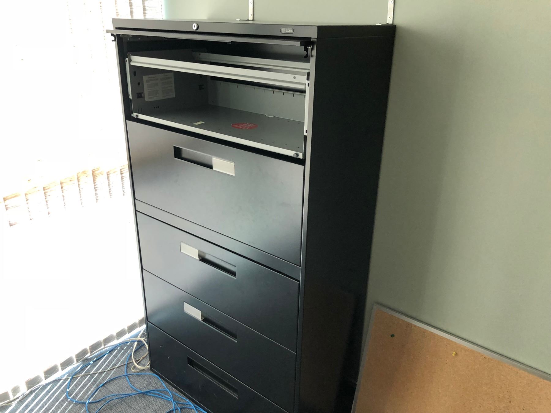 CONTENTS OF OFFICE INC. MAPLE CORNER COMPUTER DESK, BLACK 5 DRAWER LATERAL FILE CABINET AND TALL BOOK SHELF