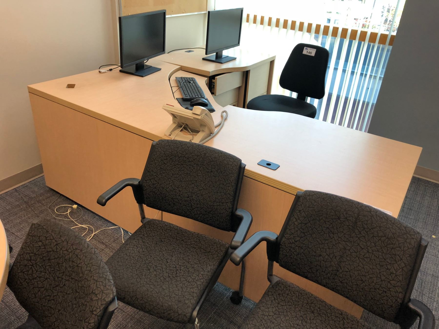 CONTENTS OF OFFICE INC. MAPLE CORNER COMPUTER DESK, MAPLE CONFERENCE TABLE, 6 ROLLING CONFERENCE CHAIRS, 3 DOOR LATERAL FILE CABINET AND WHITE BOARD