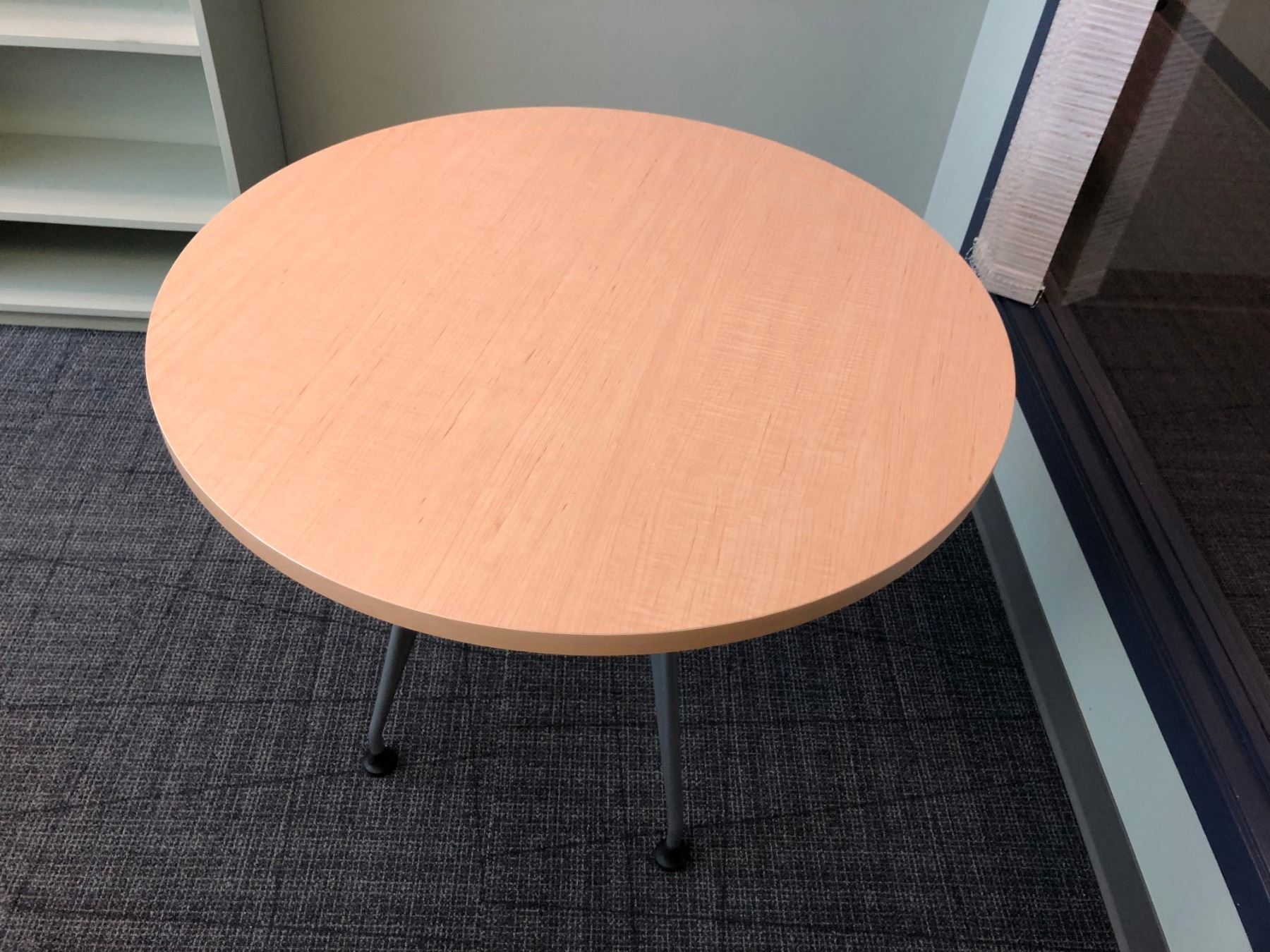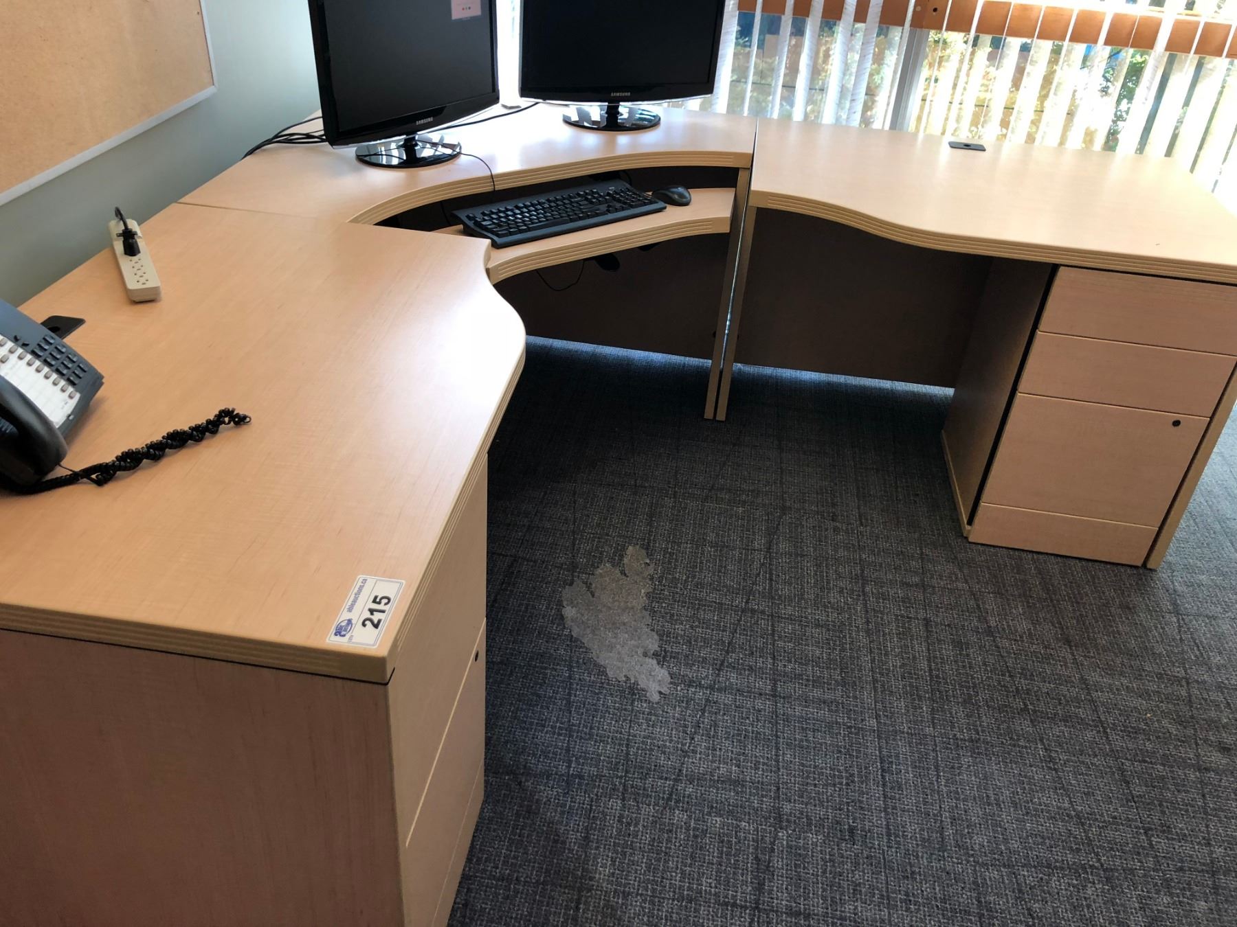 CONTENTS OF OFFICE INC. MAPLE CORNER COMPUTER DESK, MAPLE CONFERENCE TABLE, AND 2 TALL BOOK SHELVES