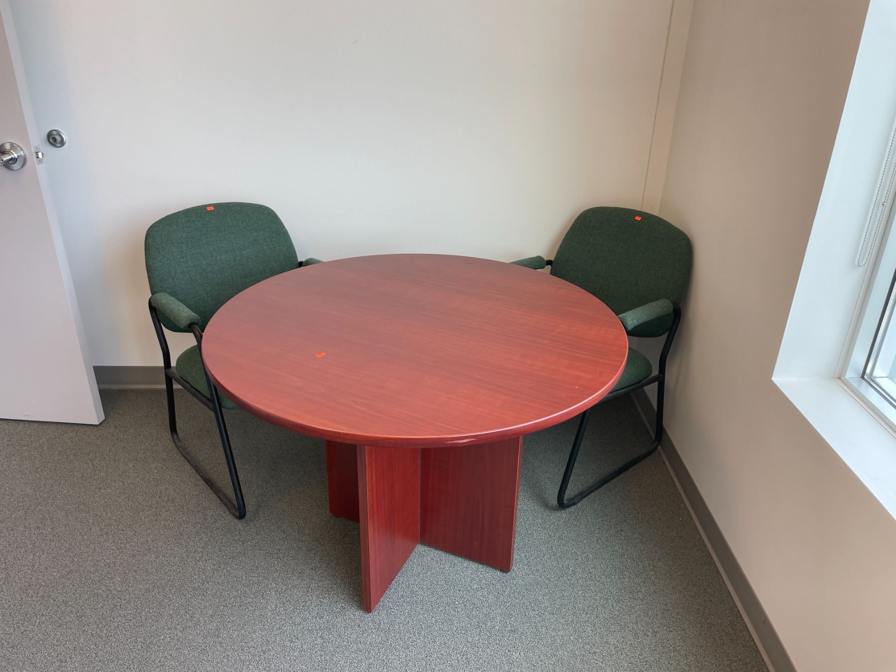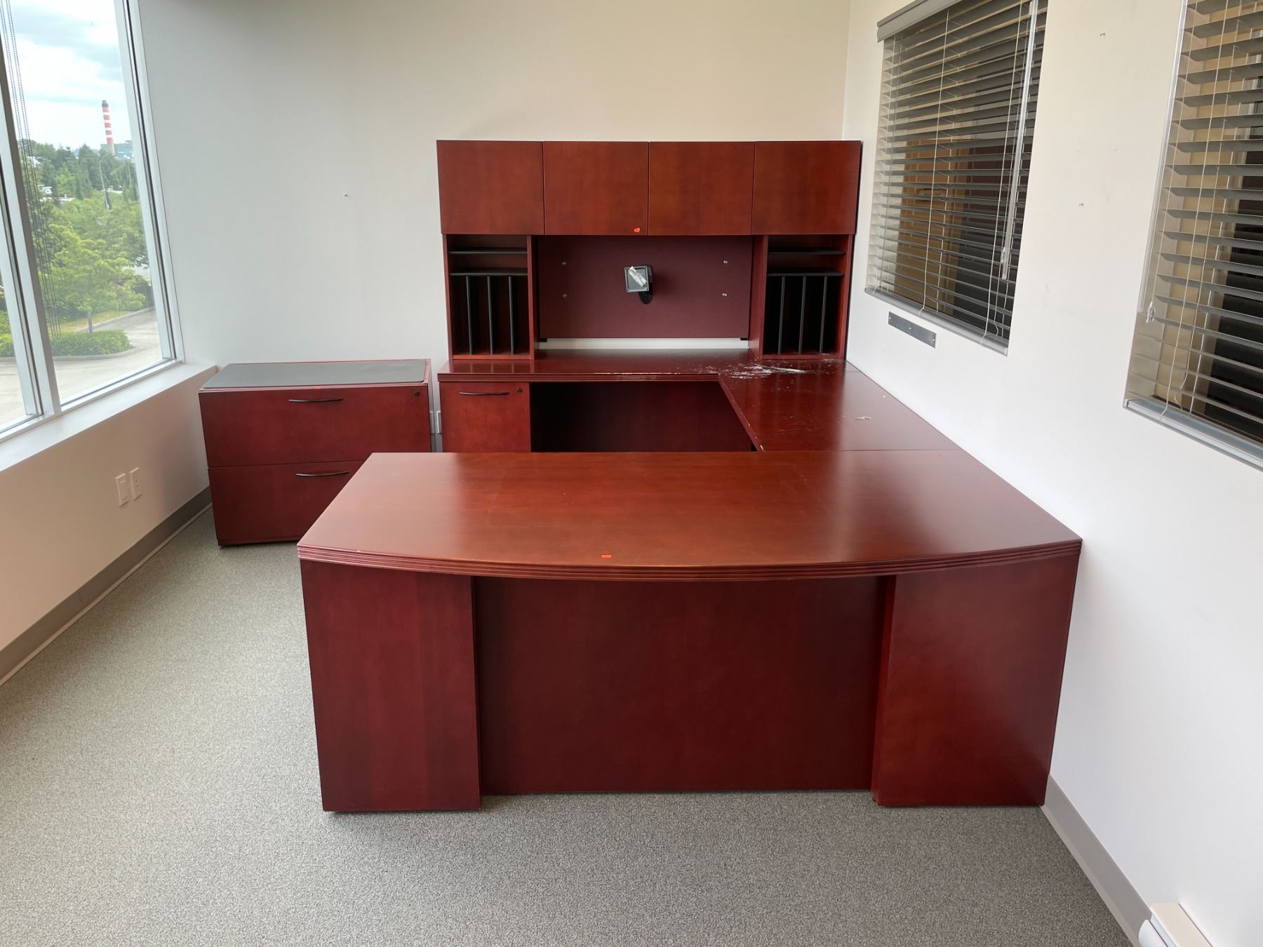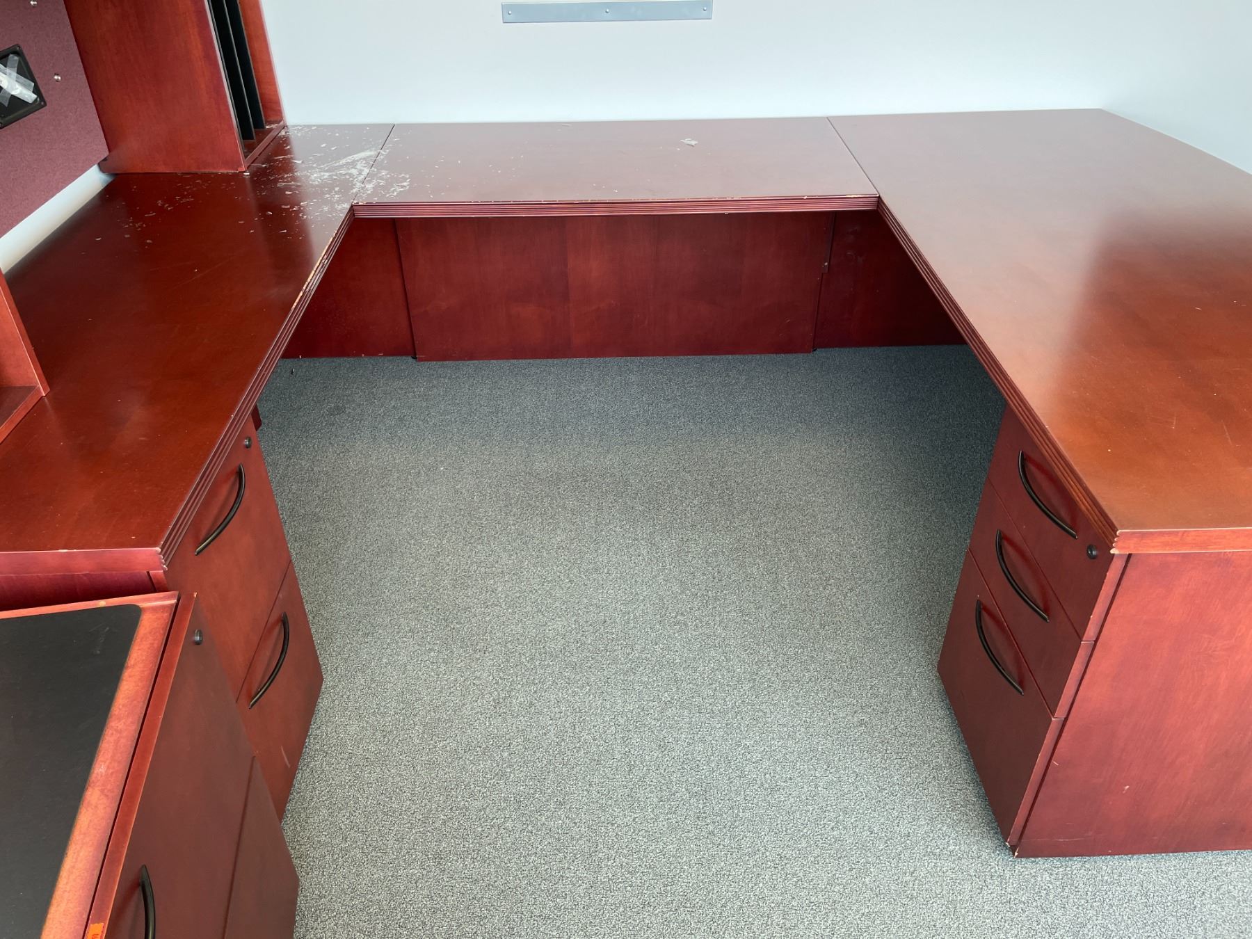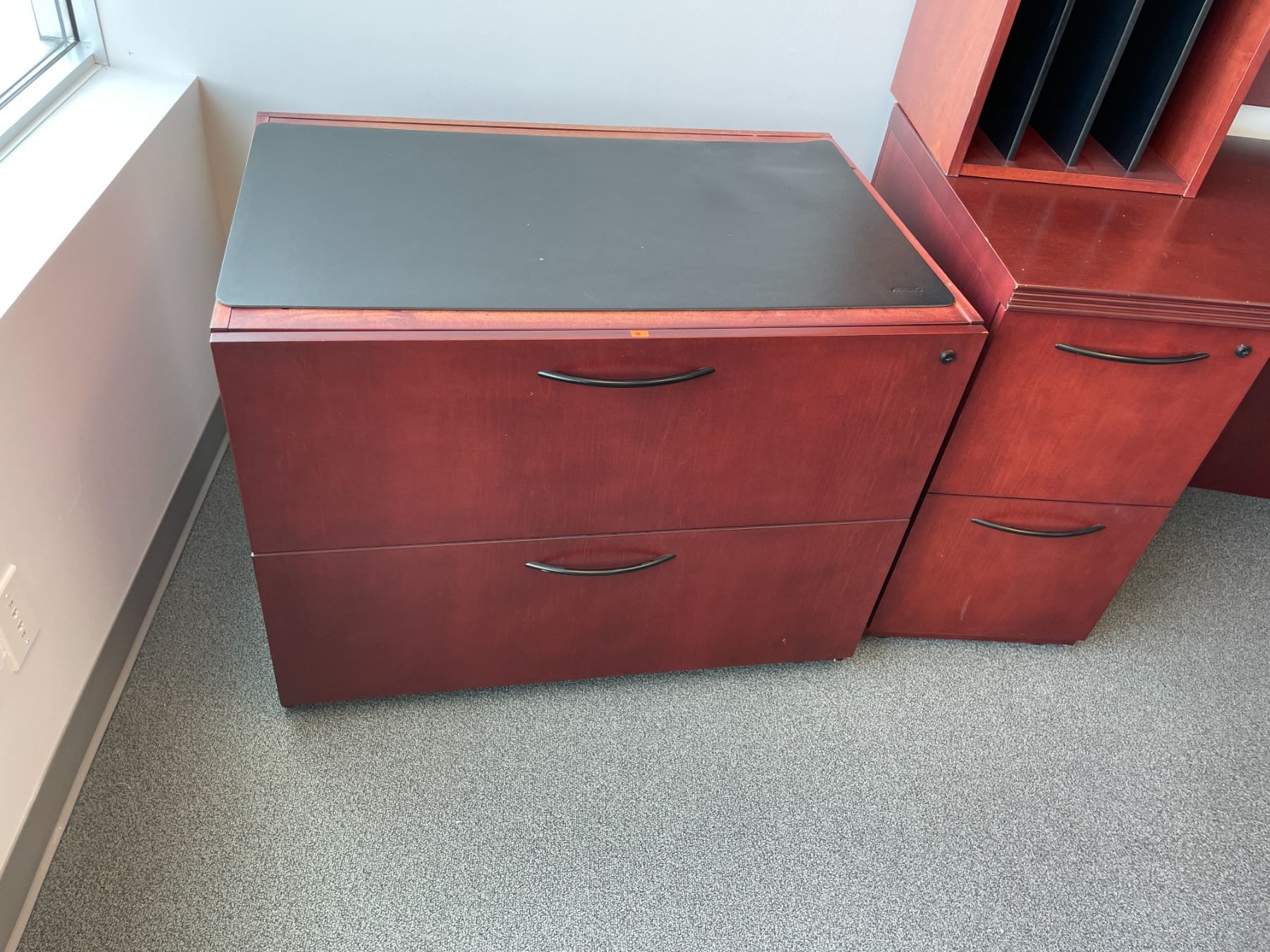 CONTENTS OF OFFICE INCLUDING: CHERRY U-SHAPE DOUBLE PEDESTAL DESK WITH 4 DOOR HUTCH, CHERRY 2 DRAWER LATERAL FILE CABINET, CHERRY 3' CONFERENCE TABLE, & 2 GREEN ARM CHAIRS