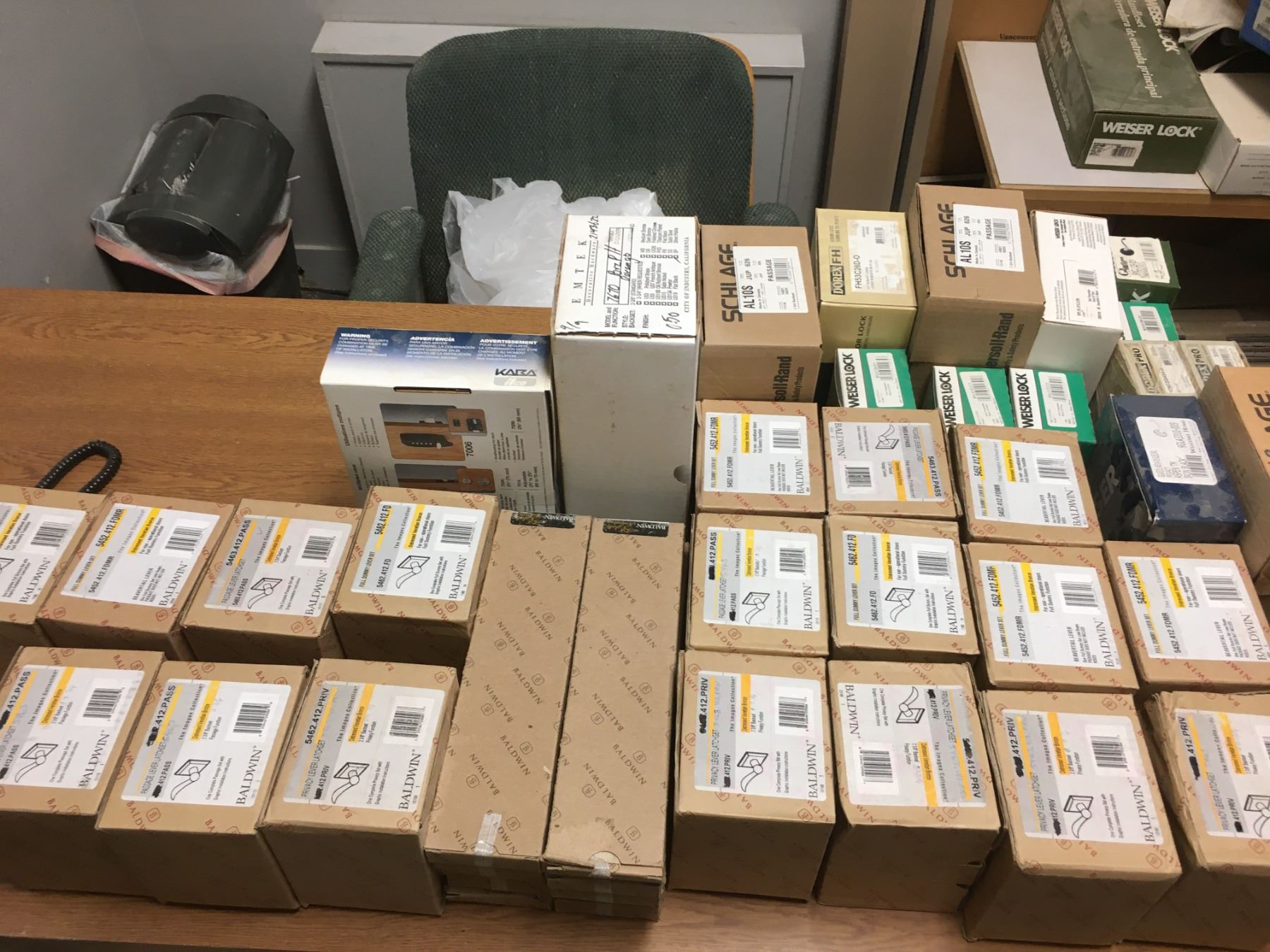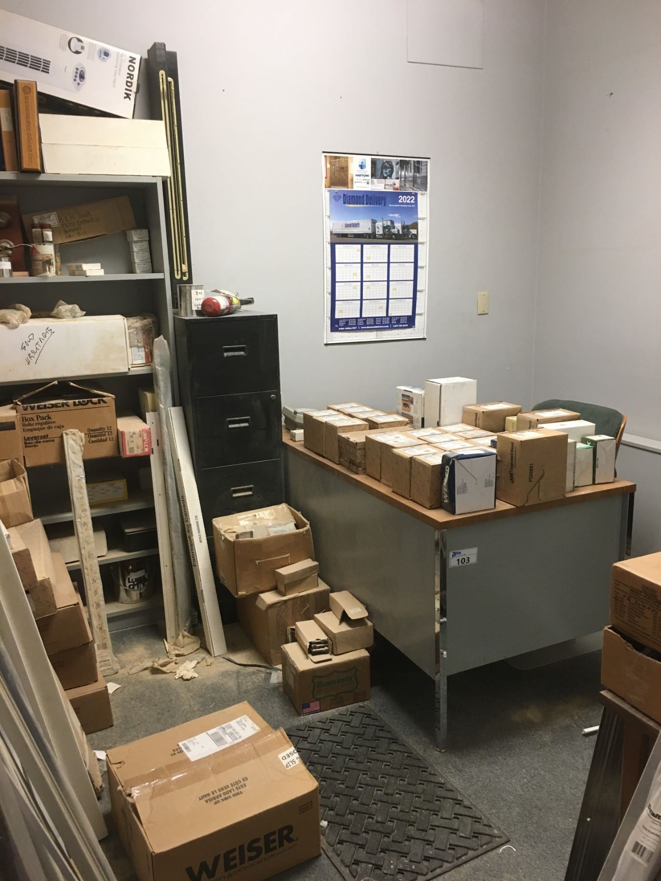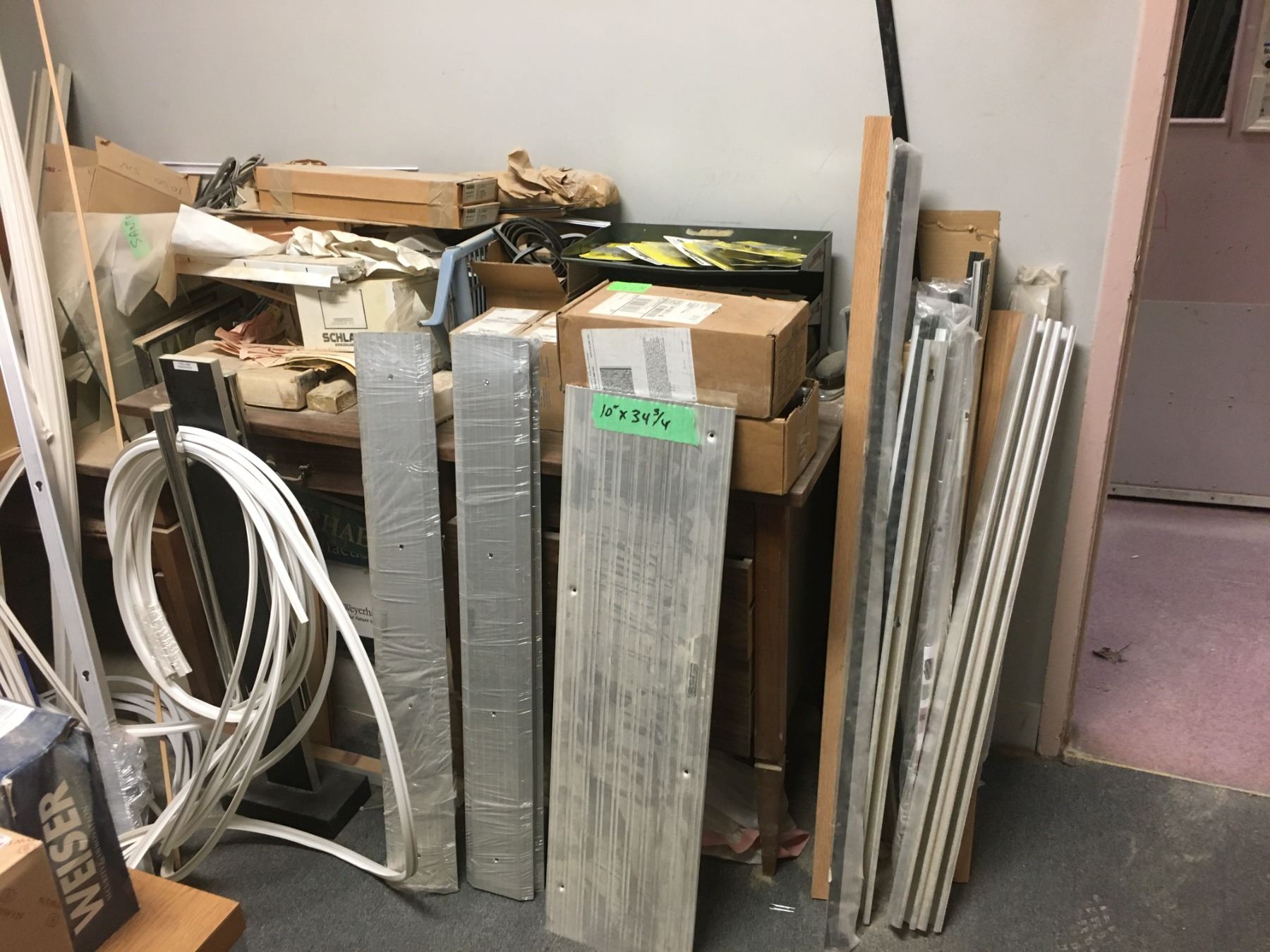 CONTENTS OF OFFICE - LOTS OF ASSORTED DOOR HARDWARE, DESK, BOOKSHELF, FILING CABINET, ETC *MUST TAKE ALL*