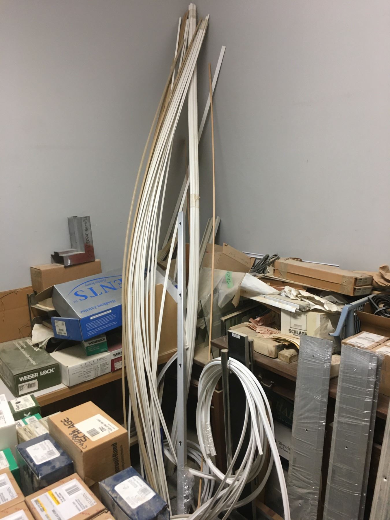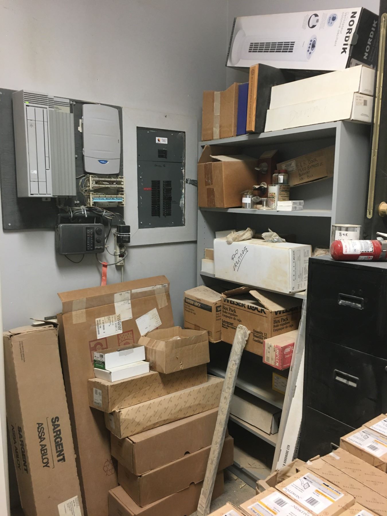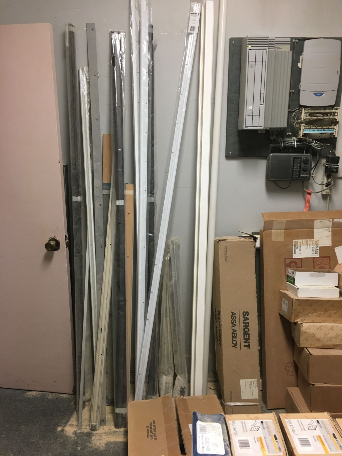 CONTENTS OF OFFICE - LOTS OF ASSORTED DOOR HARDWARE, DESK, BOOKSHELF, FILING CABINET, ETC *MUST TAKE ALL*