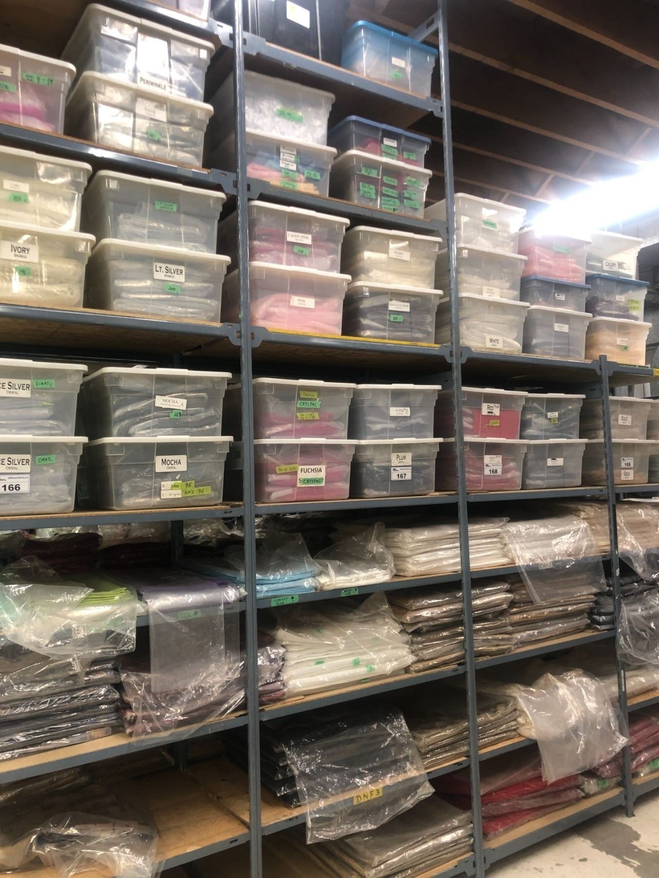 CONTENTS OF RACKING BAY INC. LARGE ASSORTMENT OF LINENS, TABLE CLOTHES, NAPKINS ETC., ASSORTMENT OF SIZE, COLOUR, MATERIAL, COMES WITH BINS