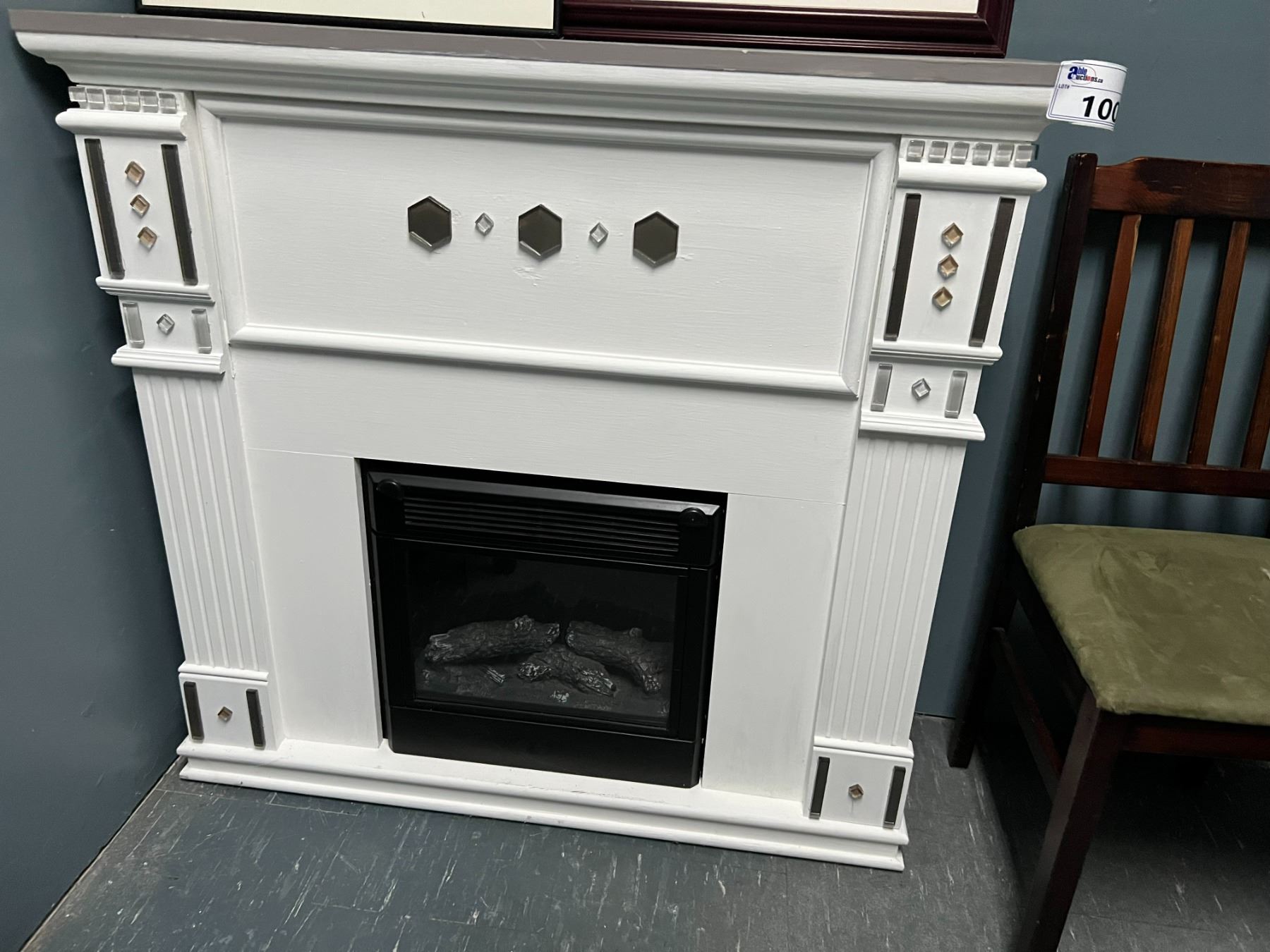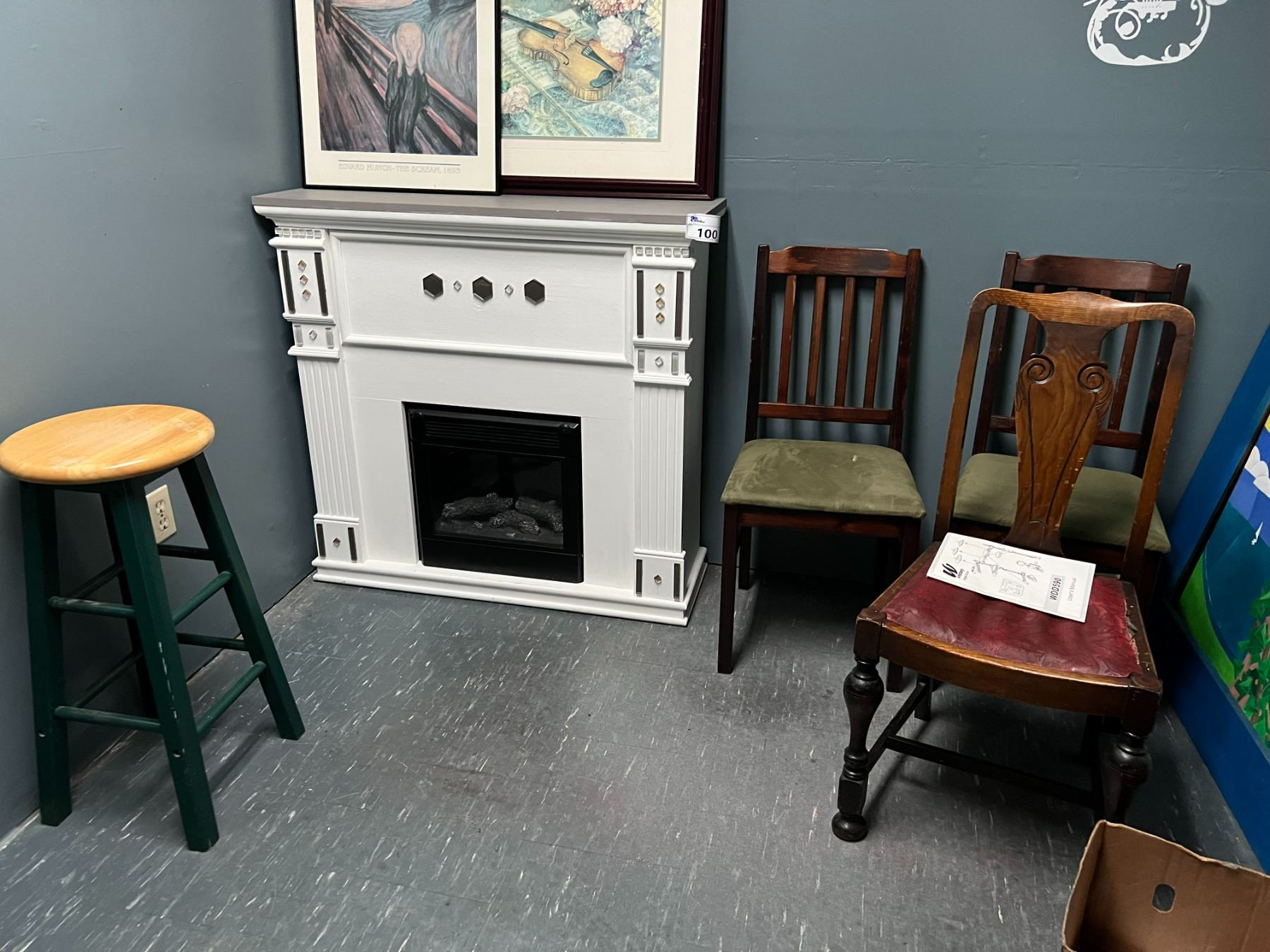 CONTENTS OF ROOM INCL ELECTRIC FIREPLACE, 4 PICTURES, 3 X WOOD CHAIRS, STOOLS