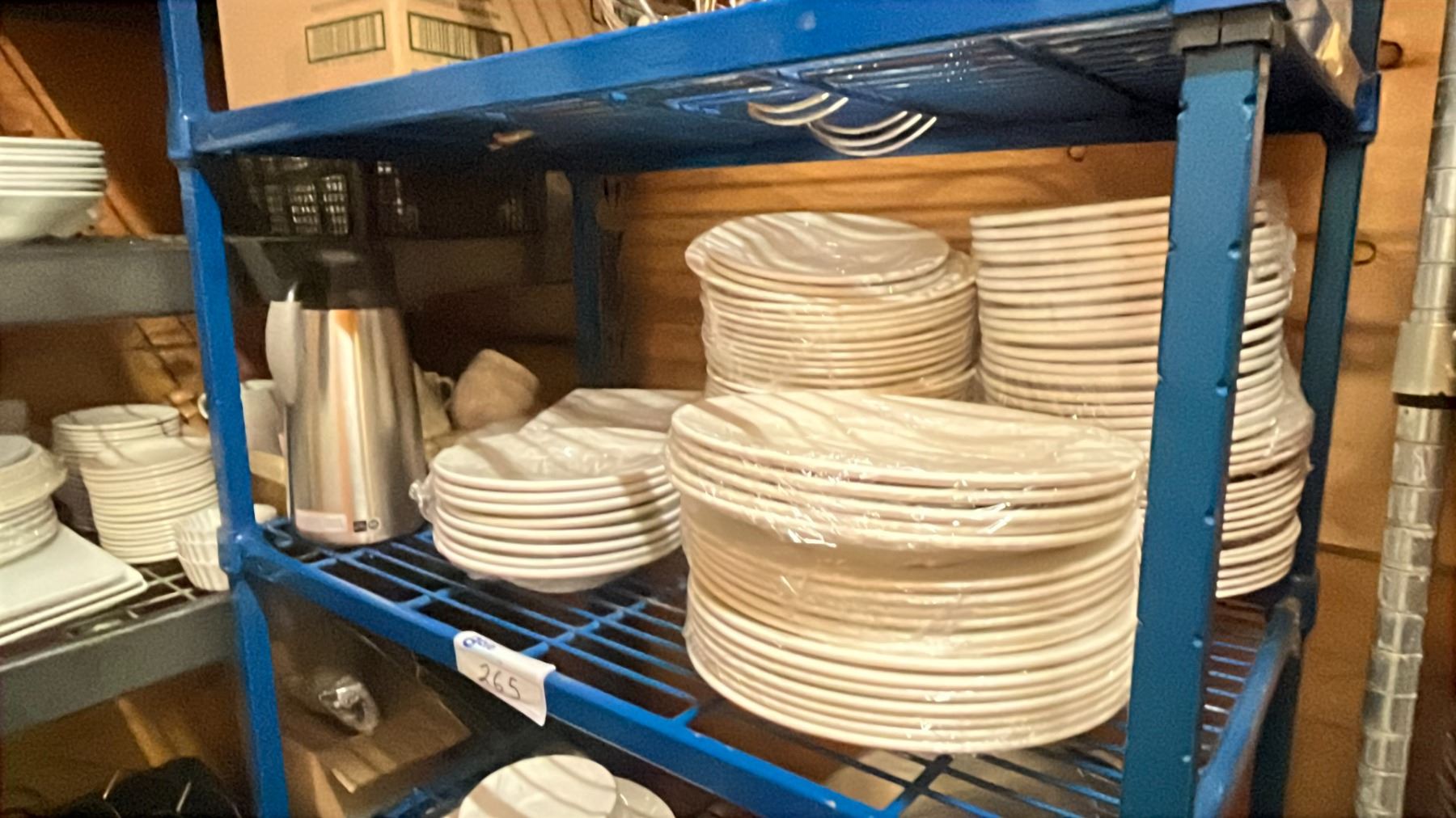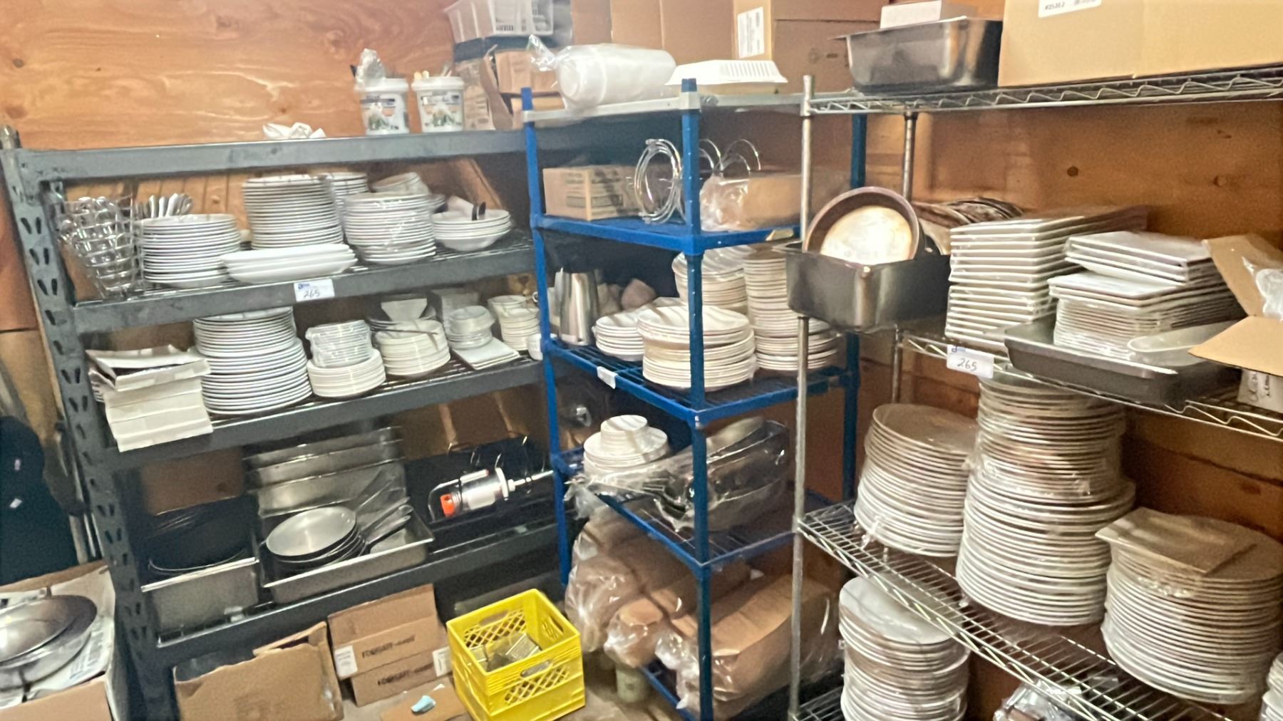 CONTENTS OF ROOM WITH 3 METAL SHELVING RACKS WITH MISC RESTAURANT EQUIPMENT, DISHWARE, KITCHEN WARE & MUCH MORE