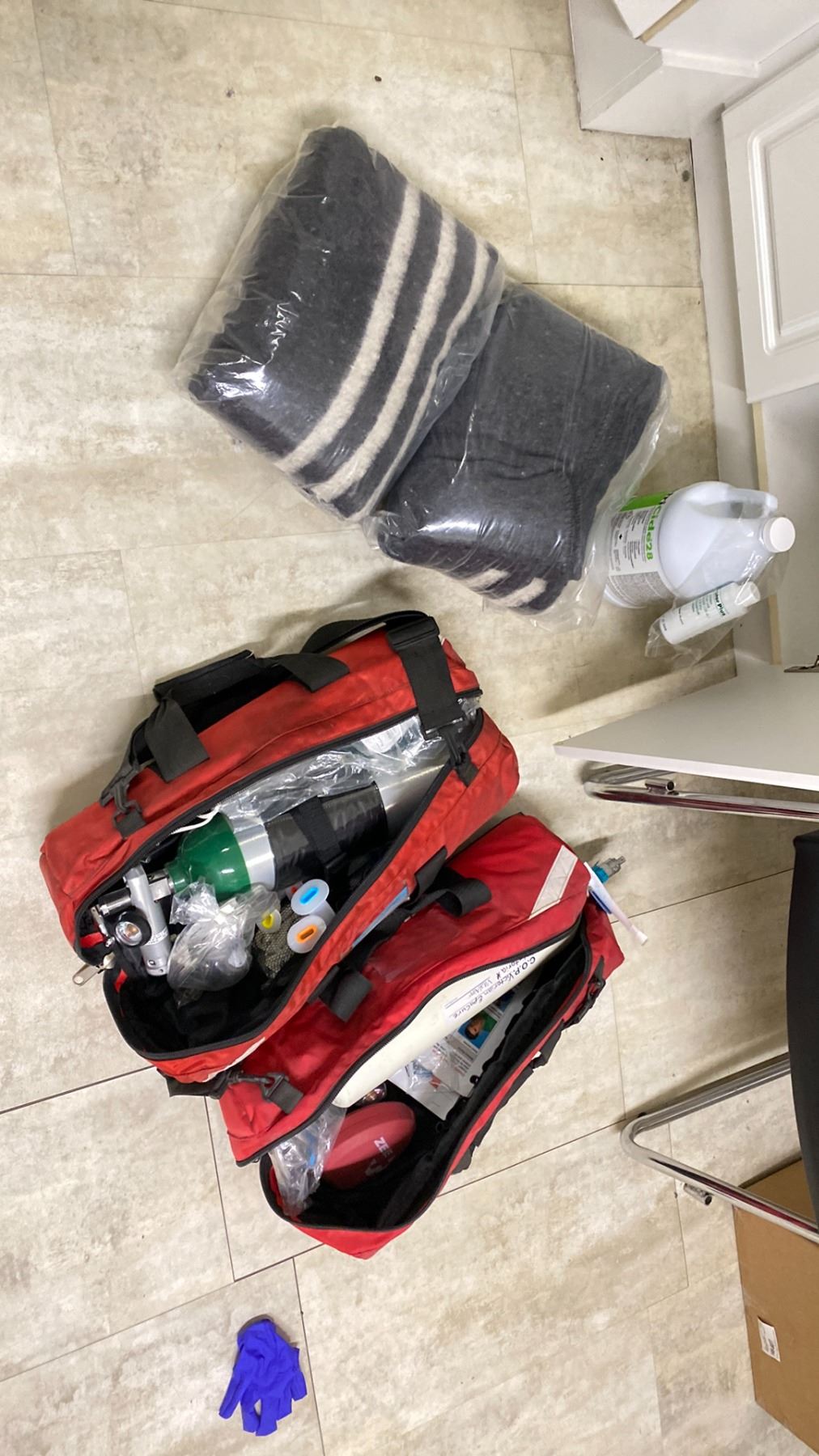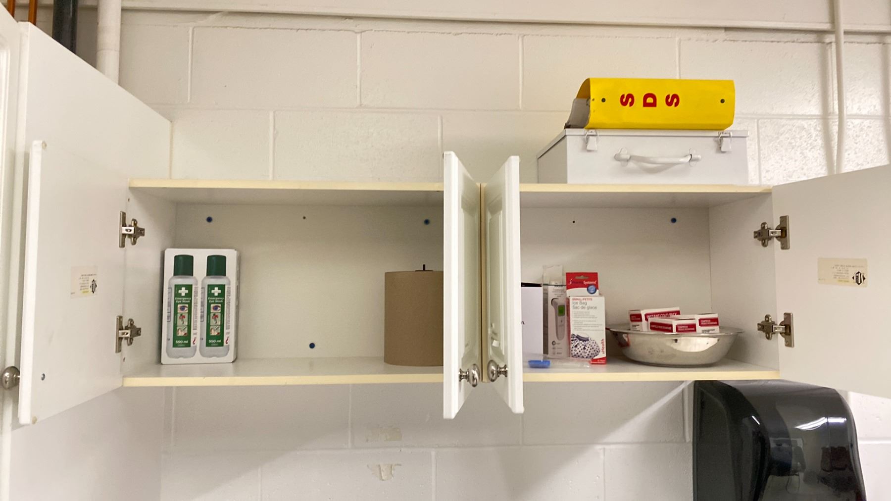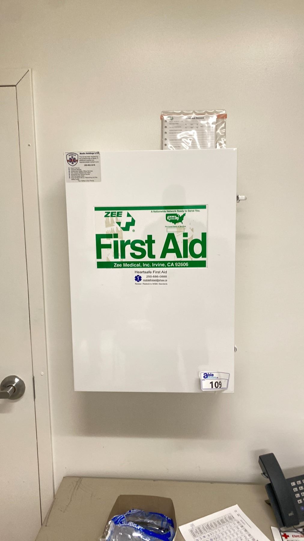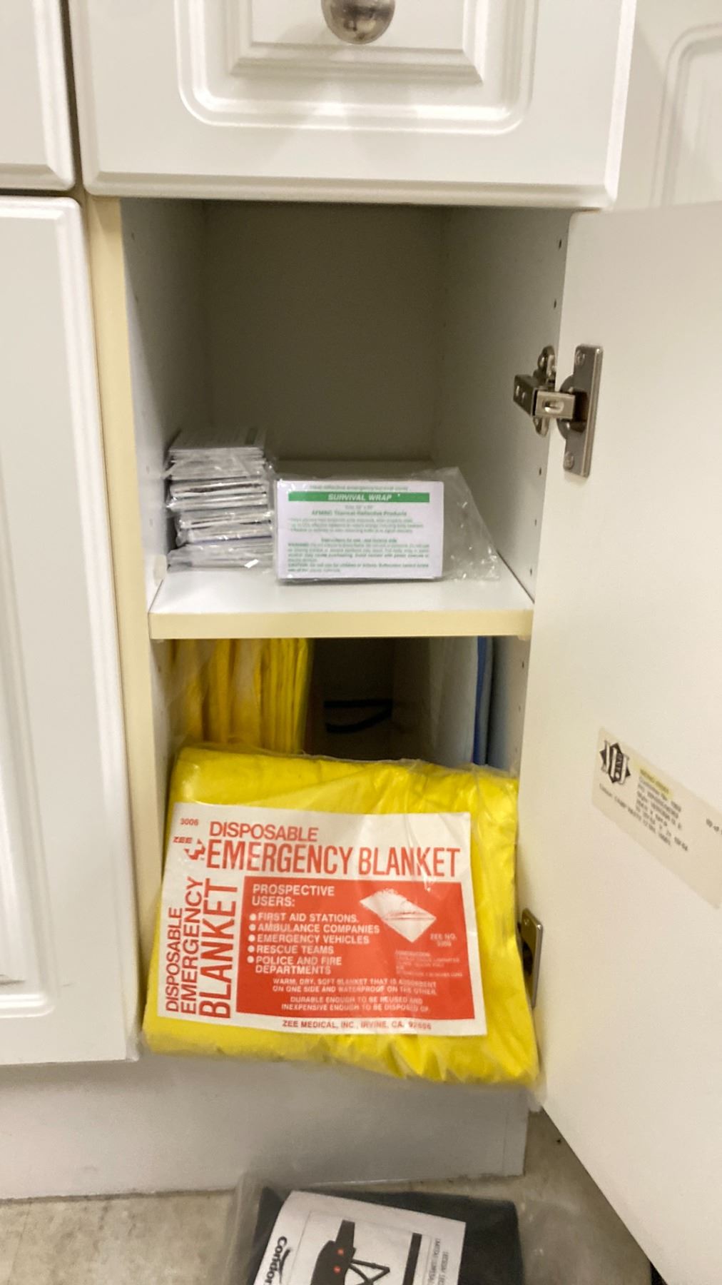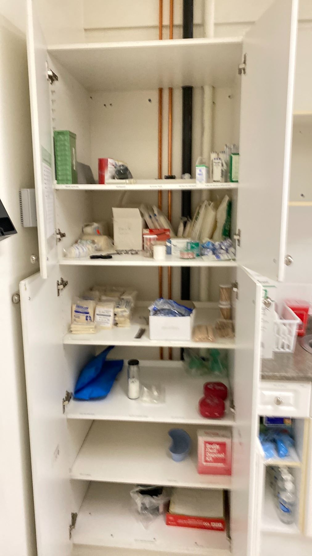 CONTENTS OF SAFETY ROOM. LARGE AND CURRENT ASST. INC MEDICAL BED, TWO MEDICAL CHAIRS, 5X6 PER CASE NEW IN BOX COOLING TOWELS, TEST KITS, BANDAGES, SPLINTS, GAUZE, FIT TEST KIT FOR MASKS, SAFETY GLASSES, BODY FLUID DISPOSAL KITS, BASINS, ICE PACKS, MAGNIFYING EXAM LIGHT, EYEWASH, GLOVES, BACK BRACE, SURVIVAL BLANKETS, DISPOSABLE BLANKETS, ETC NOTE 02 NEEDS TO BE REFILLED