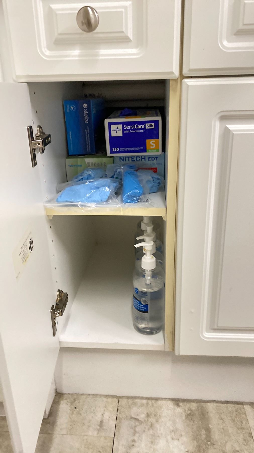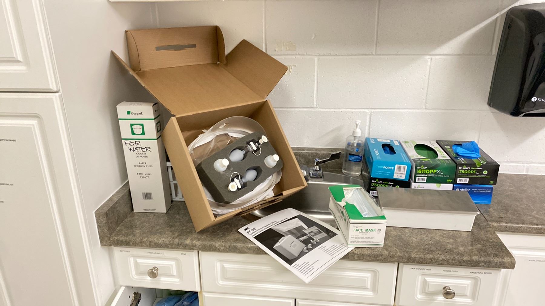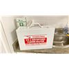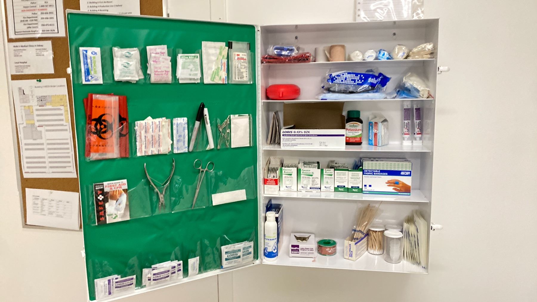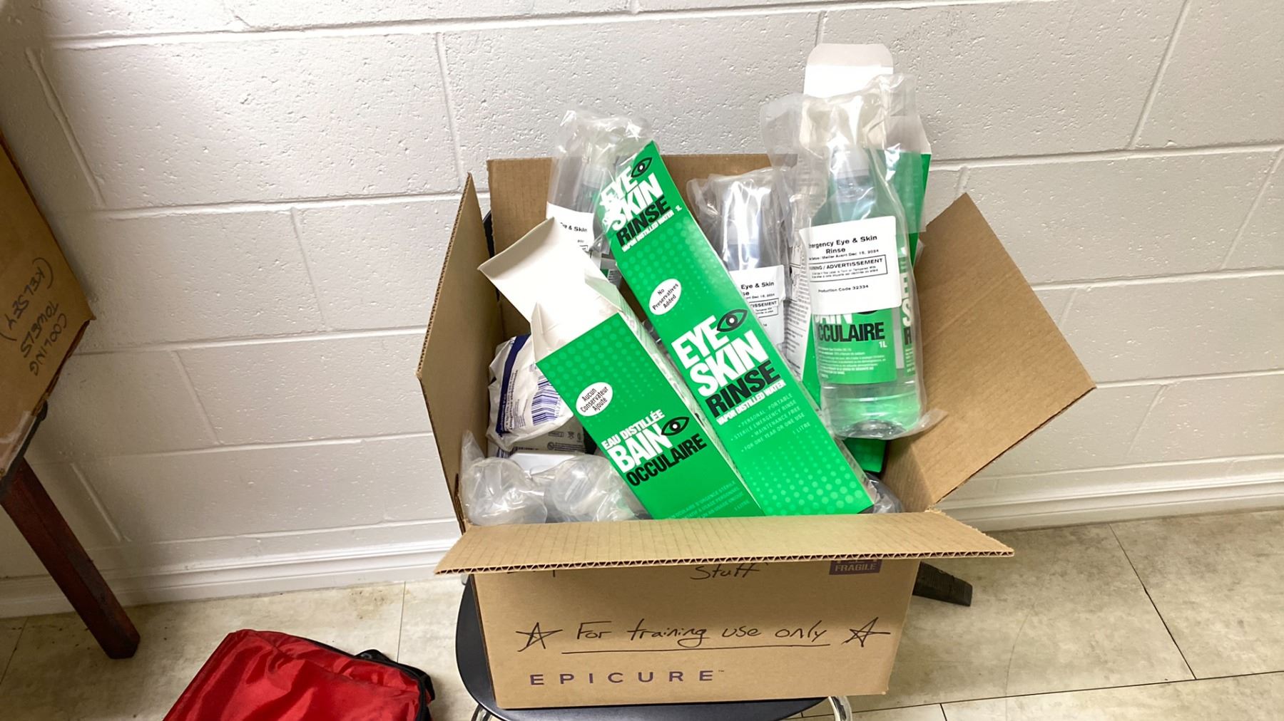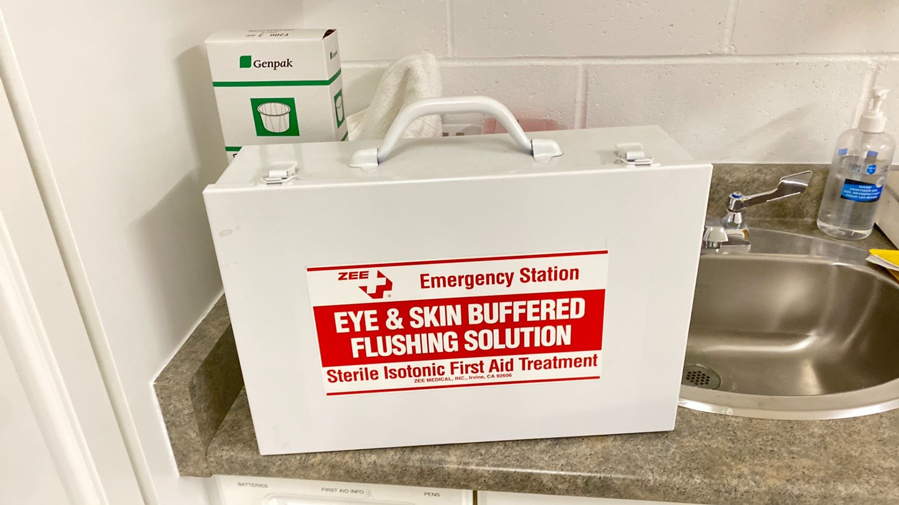 CONTENTS OF SAFETY ROOM. LARGE AND CURRENT ASST. INC MEDICAL BED, TWO MEDICAL CHAIRS, 5X6 PER CASE NEW IN BOX COOLING TOWELS, TEST KITS, BANDAGES, SPLINTS, GAUZE, FIT TEST KIT FOR MASKS, SAFETY GLASSES, BODY FLUID DISPOSAL KITS, BASINS, ICE PACKS, MAGNIFYING EXAM LIGHT, EYEWASH, GLOVES, BACK BRACE, SURVIVAL BLANKETS, DISPOSABLE BLANKETS, ETC NOTE 02 NEEDS TO BE REFILLED