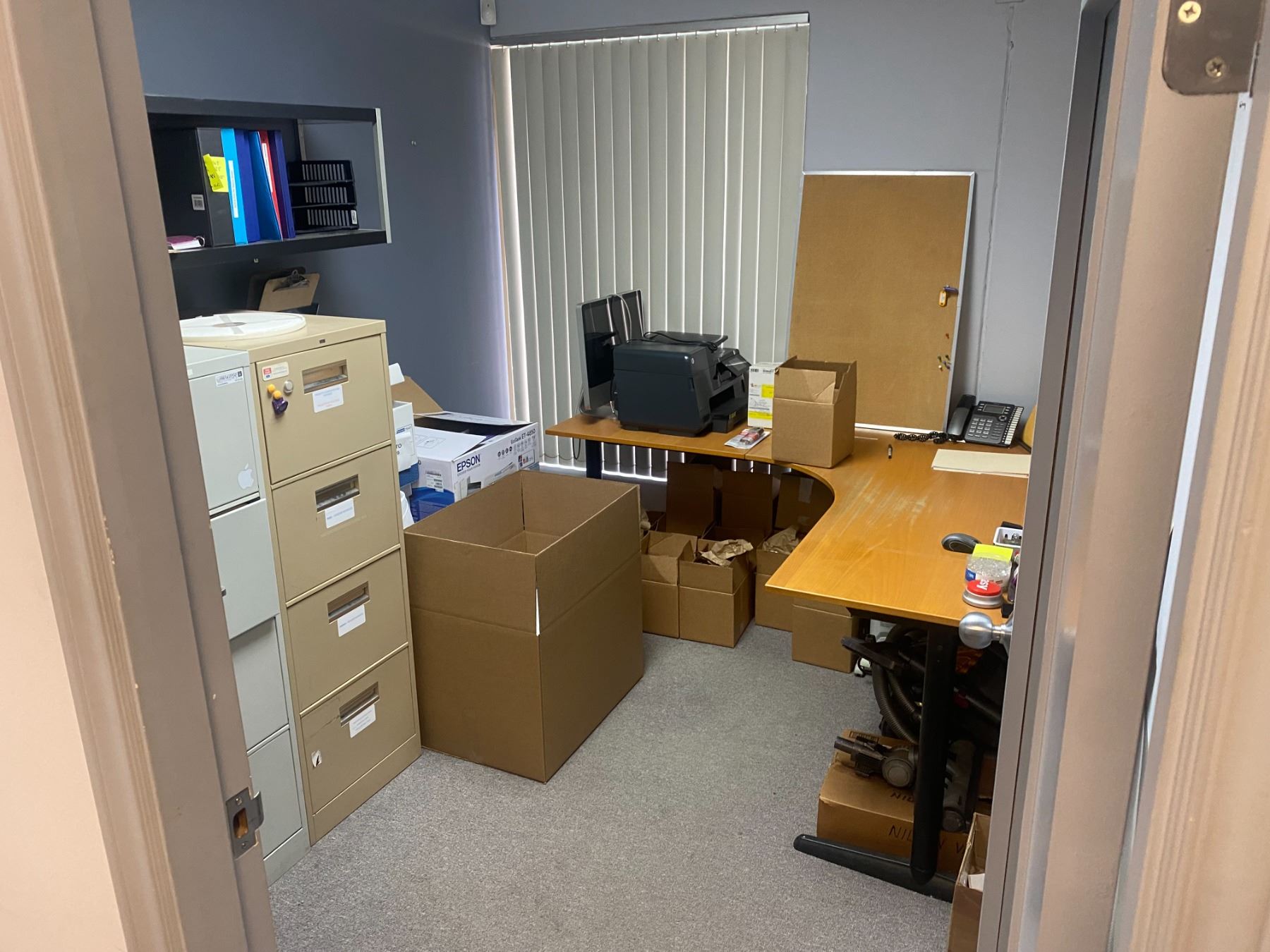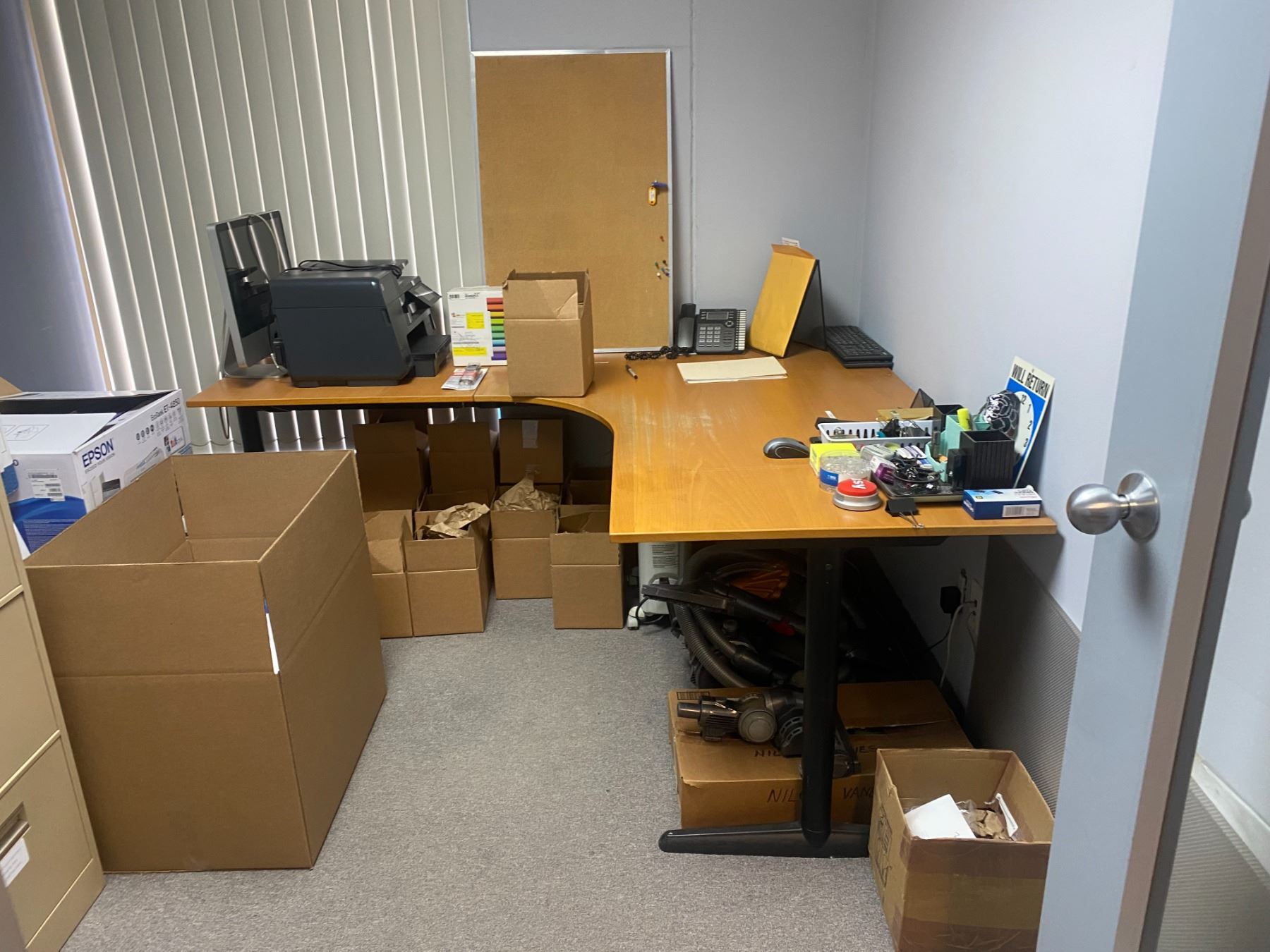 CONTENTS OF SALES OFFICE INCLUDING: DESK, 3 METAL 4 DRAWER FILE CABINETS, 2 TIER WALL SHELF & ASSORTED OFFICE PRODUCTS (ITEMS MAY VARY FROM PICTURE PLEASE PREVIEW)
