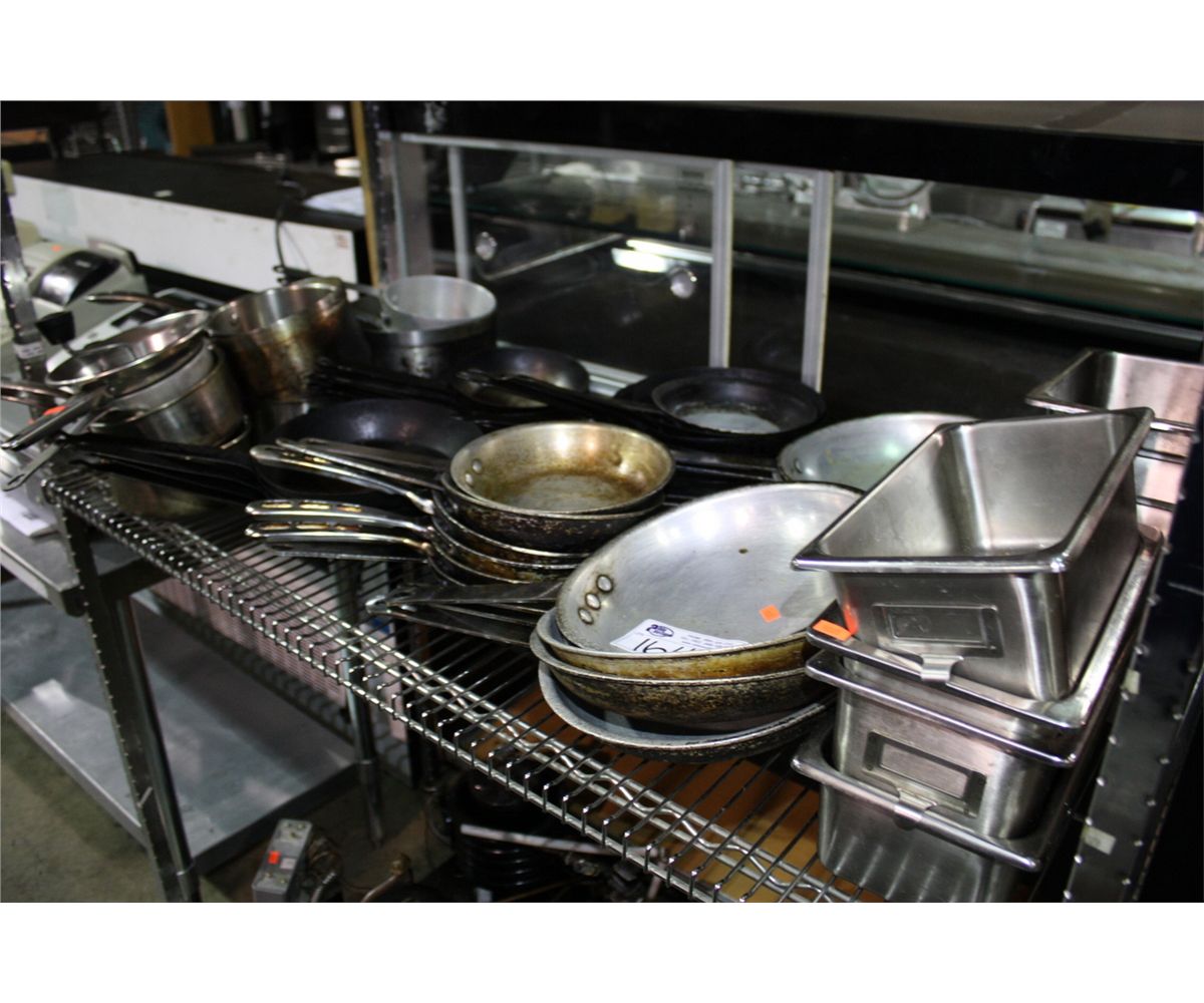CONTENTS OF SHELF INCLUDING PANS, RICE COOKER ETC