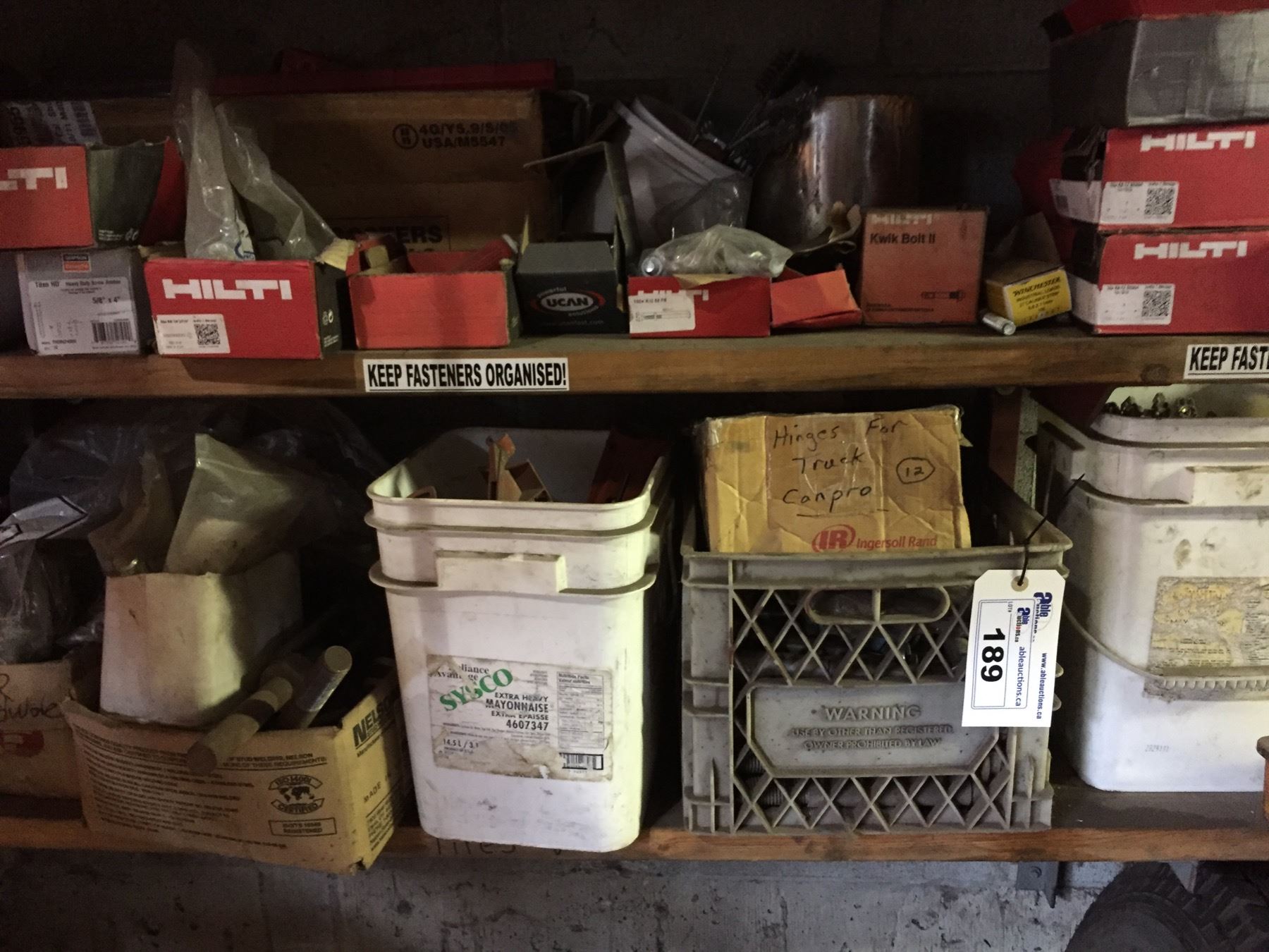 CONTENTS OF SHELF NEAR STAIRWAY INC. ASSORTED HILTI STOCK, CONTENTS OF BINS AND MORE