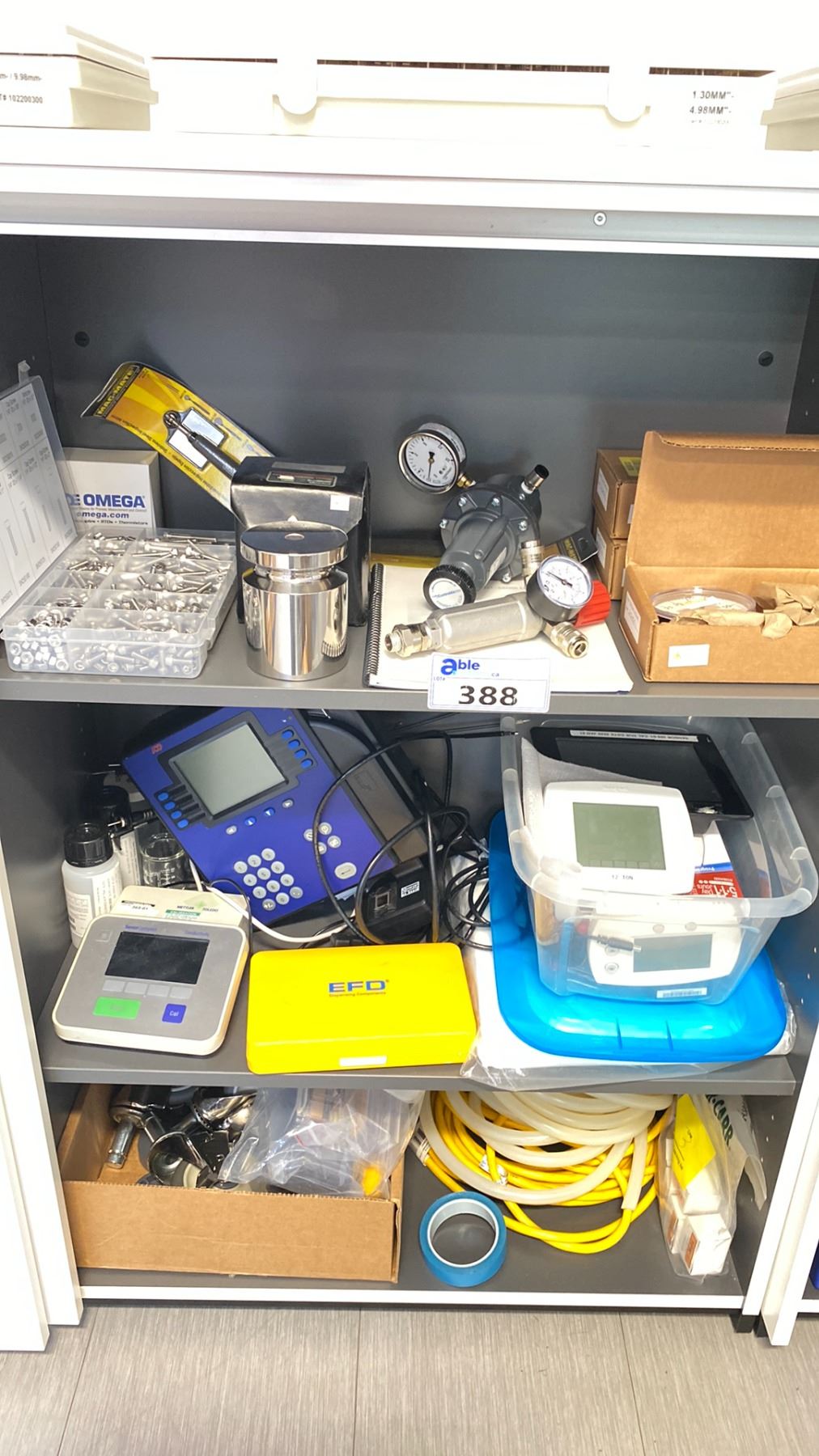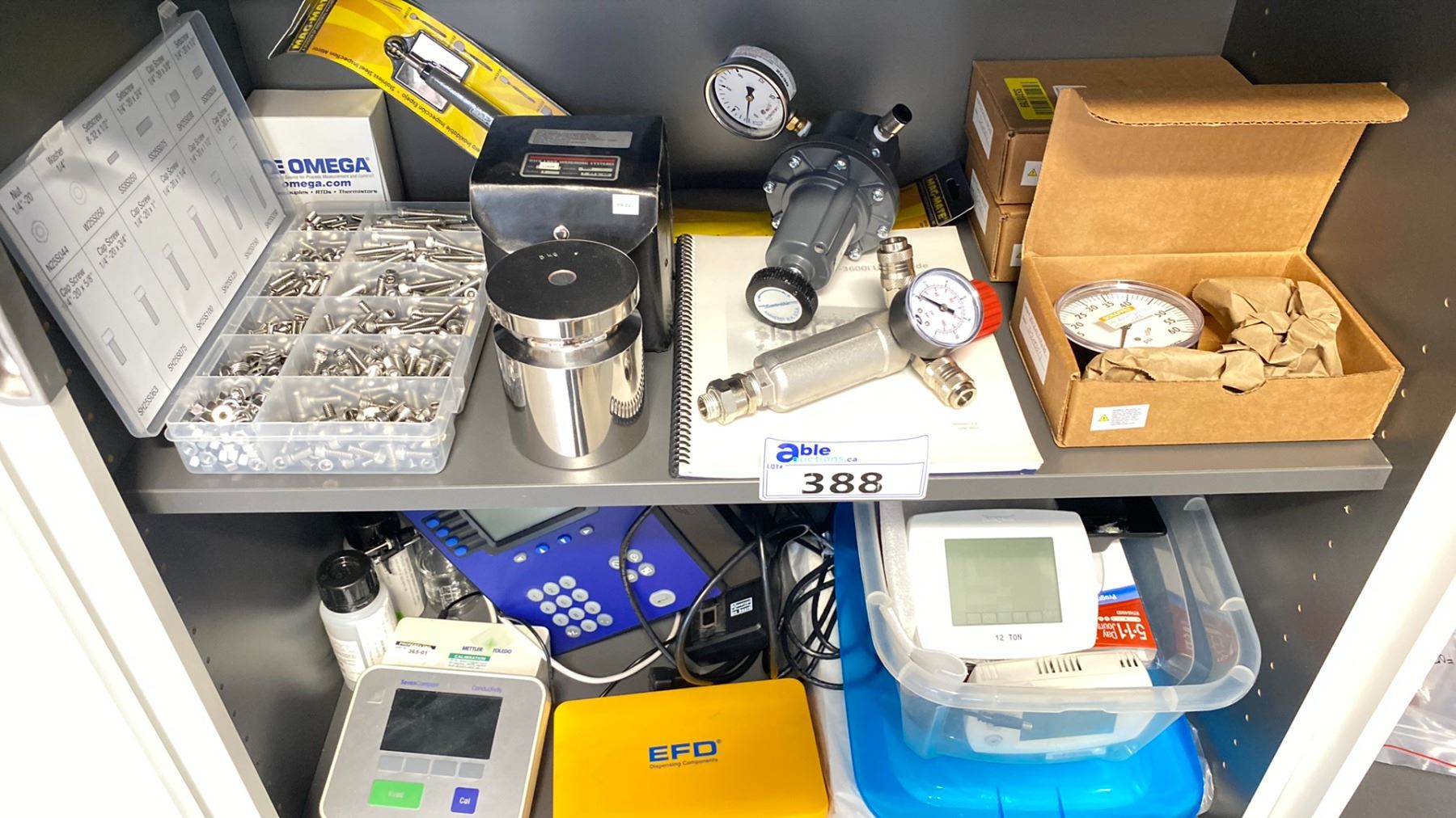 CONTENTS OF SHELVING UNIT IN KITCHEN; ASSORTED HARDWARE, FISHER SCIENTIFIC WEIGHT, ASSORTED GAGES AND MUCH MORE