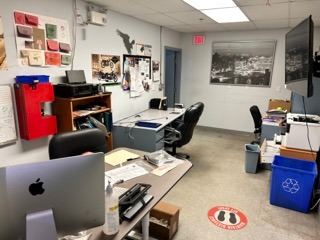 CONTENTS OF SHIPPING OFFICE INCLUDING: ADJUSTABLE STANDING DESK, BLUE METAL DESK, 3 OFFICE CHAIRS, STEREO, WOODEN SHELF, BLUE METAL DESK WITH HUTCH & SOLDERING EQUIPMENT (ITEMS ARE SUBJECT TO CHANGE FROM PICTURES PLEASE PREVIEW)