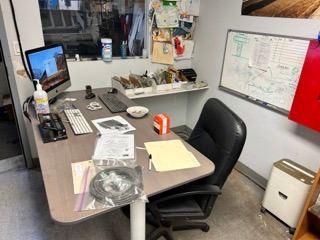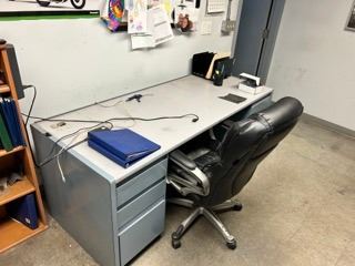 CONTENTS OF SHIPPING OFFICE INCLUDING: ADJUSTABLE STANDING DESK, BLUE METAL DESK, 3 OFFICE CHAIRS,