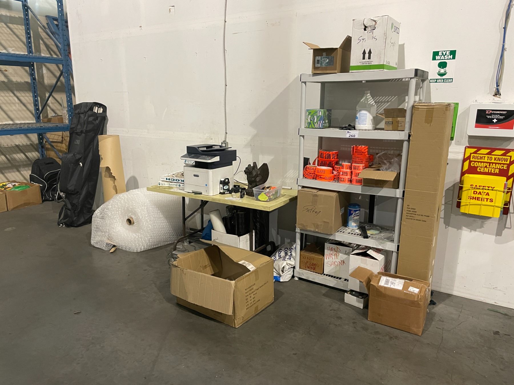 CONTENTS OF SHIPPING RECEIVING AREA INCLUDING SHELVES, WORK BENCH, FOLDING TABLE, HYDROPONICS