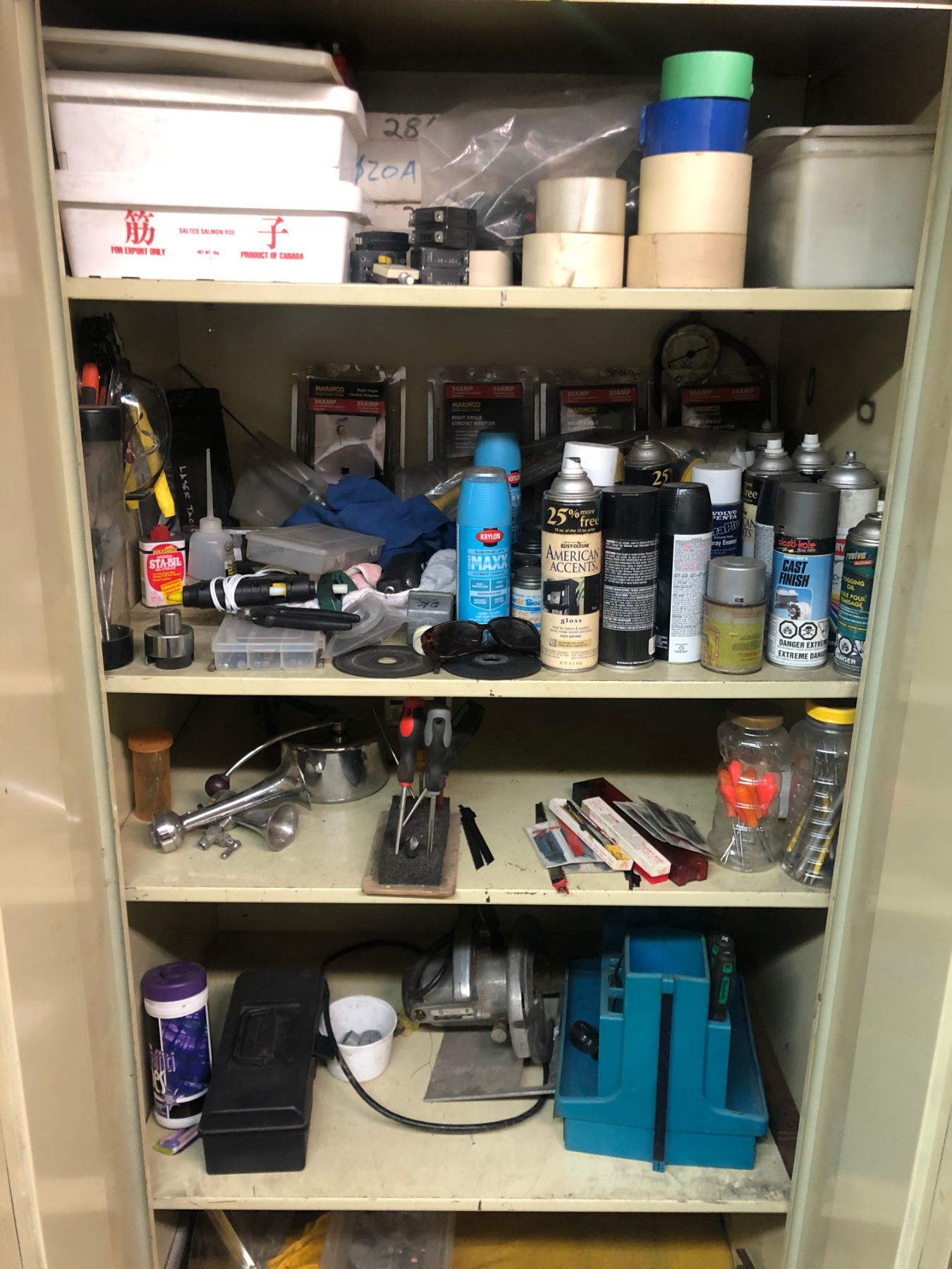 CONTENTS OF STORAGE CABINET INCLUDING PARTS, HARDWARE AND MORE