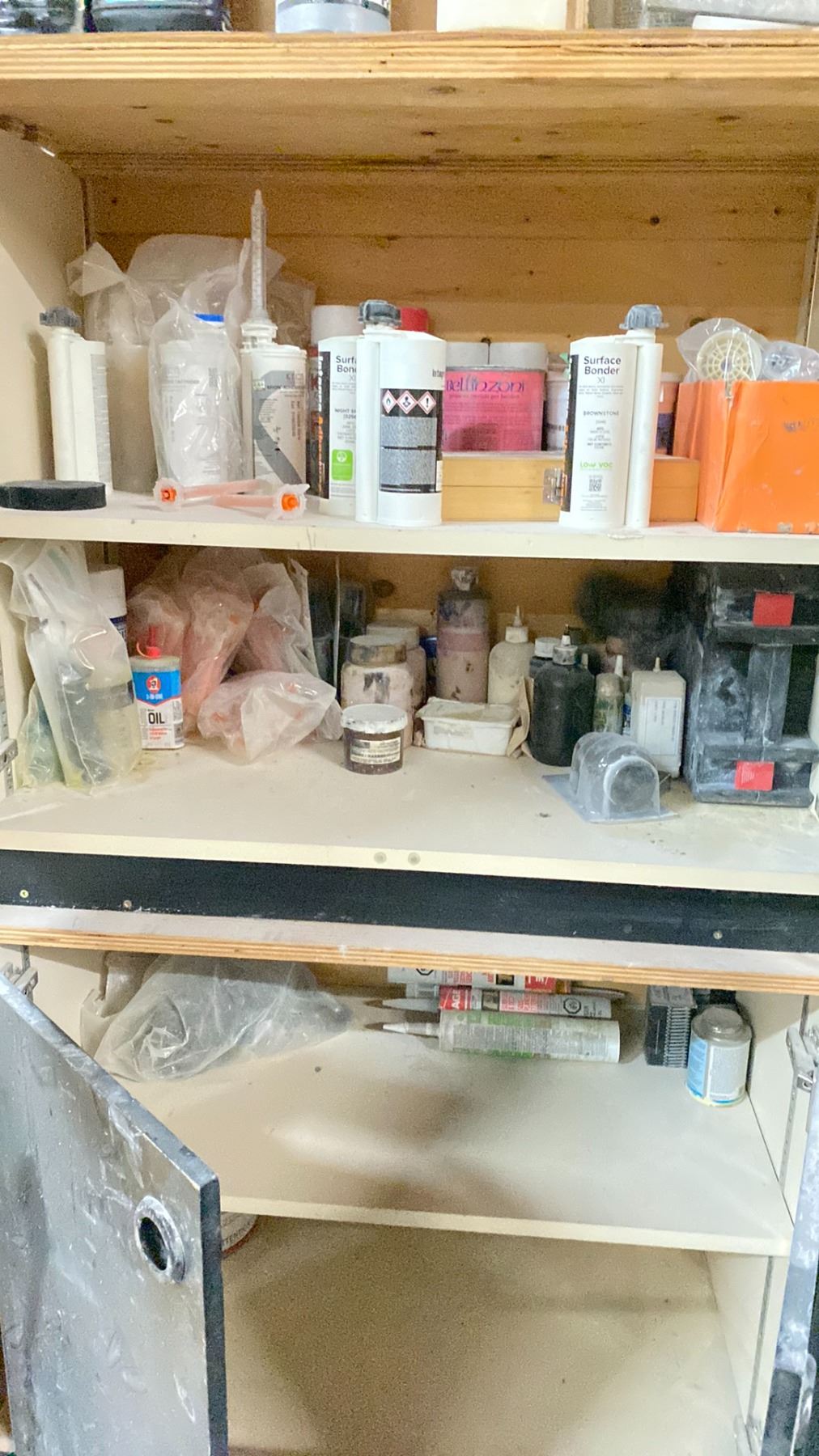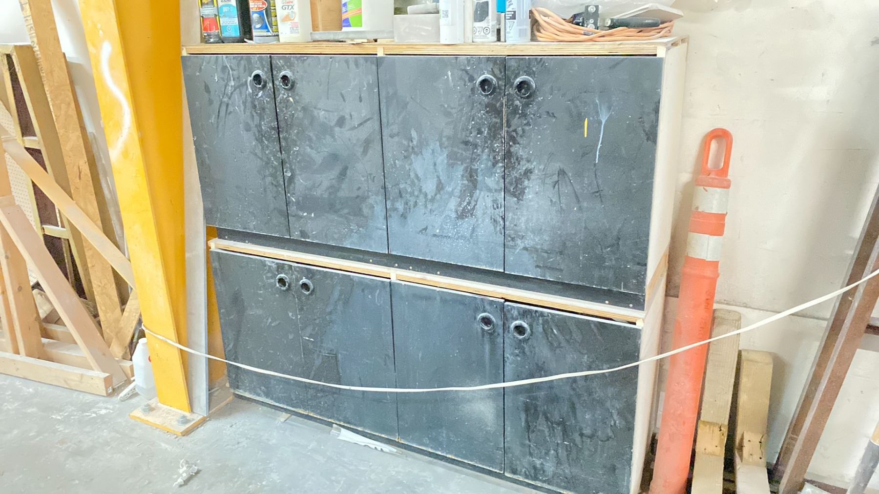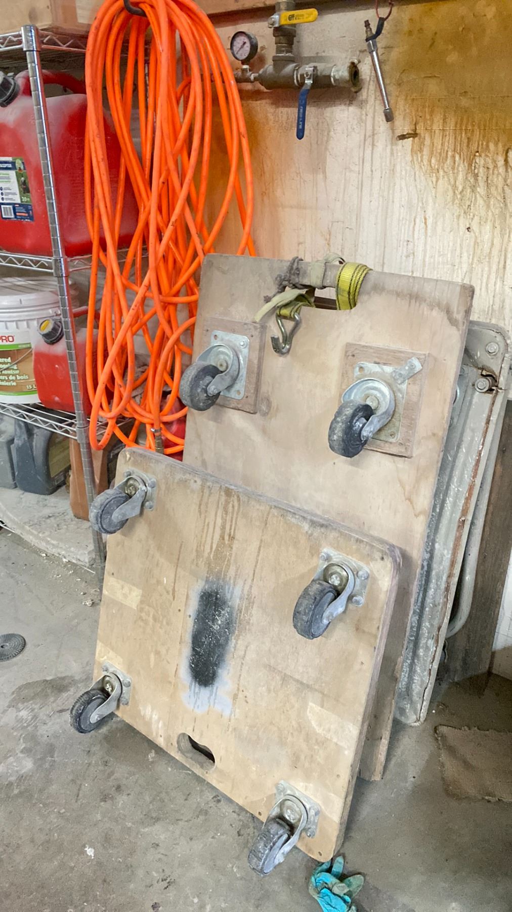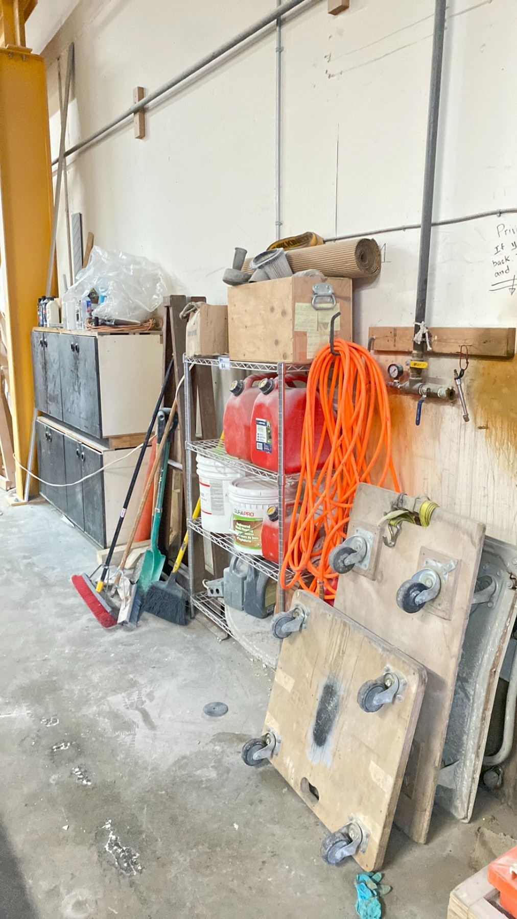 CONTENTS OF STORAGE WALL INCLUDING: CHROME 4 TIER RACK WITH JERRY CANS, 4 WHEEL MOBILE CARTS, ORANGE AIR HOSE, 3 METAL DUAL A FRAME RACKS, & 2 4 DOOR WOODEN CABINETS WITH ASSORTED CONTENTS